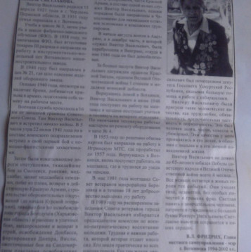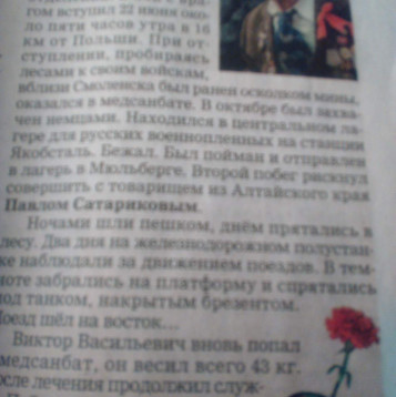 Мой отец был очень честным,справедливым и смелым человеком. В 1940 г осенью ушел в армию.Окончил полковую школу, а 22 июня подняли по тревоге,получили боеснаряжение по дороге началась бомбежка. Вступили в бой в Червонном бору,в 16 км от польской границы.Оборонялись до 28 числа в окружении немцев, в этом окопе был заколот первый фриц. Из окружения вышли,вели бои под Смоленском.Был ранен осколком мины,попал в медсанчасть, отступая к Вязьме пытаясь спастись.., но медсанбат окружили немцы.В одну из таких ночей организовали побег. шли ночами,но на 26 сутки попали в окружение и были отправлены в дрезденскую тюрьму. Дальше лагерь, работы в шахте. Бежали вдвоем, шли по ночам, днем забирались в густой лес,голодали. Однажды, утром увидели человека на подводе, оказался свой. Отдали в распоряжение особого отдела. Потом медсанбат, т.к весил тогда мой папа 43кг. В апреле 44го года выписали в строй,вновь,принял присягу.Сохранили в сержантском звании,лычки повесил, вручили медаль "За боевые заслуги" за отвагу. Освобождали Донбасс,запомнился Сандомирский плацдарм. Польшу освобождали затяжными боями,г. Бориславль брали. 6 апреля 1945-го был ранен осколок попал в голову-долгие годы не удаляли.Был удален уже годы 70-е. Еще освобождали Австрию,Чехословакию,Венгрию. 9 мая -победу встретил на территории нынешней Польши в г. Бреслау (ныне г. Вроцлав).