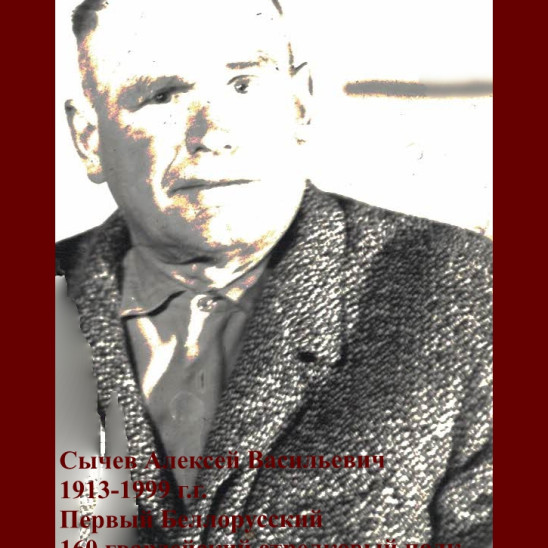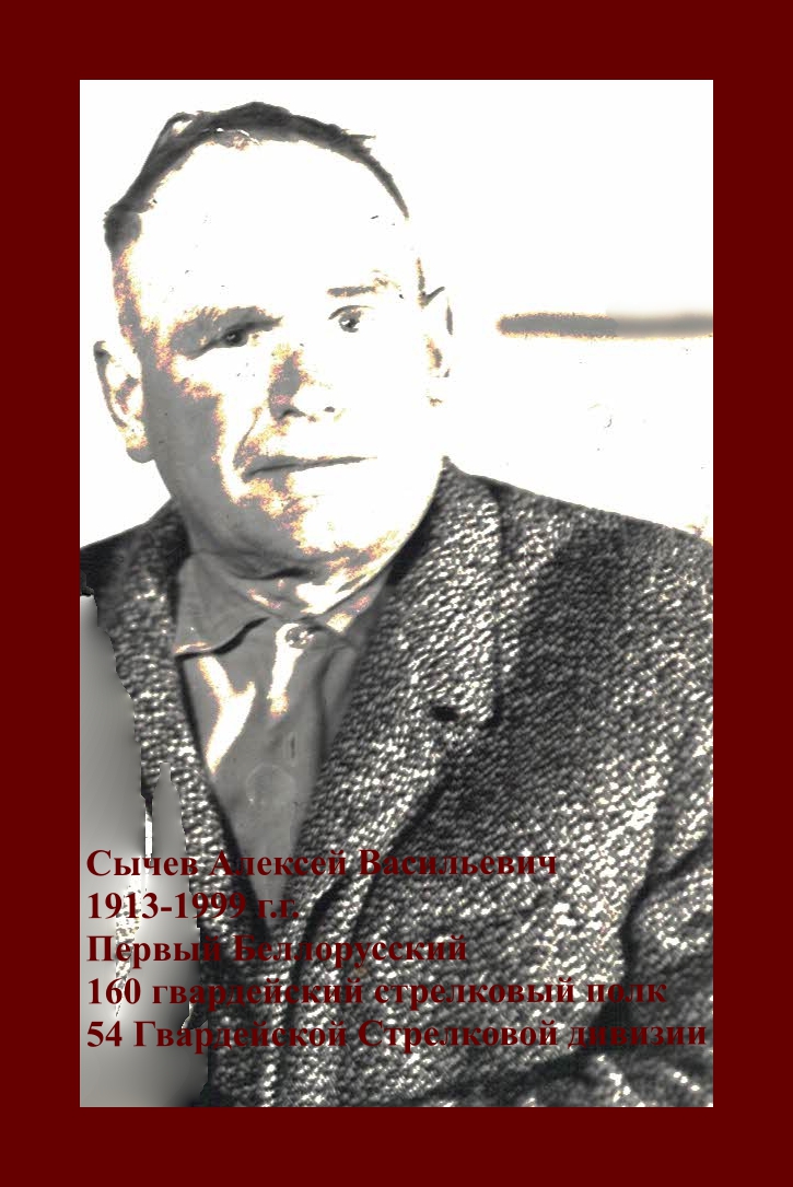 Мой дедушка Сычев Алексей Васильевич 1913 года рождения родился в Белорусская ССР, Могилевская обл., Хотимский р-н, с.Будочка. Служил в 160 гвардейском стрелковом полку 54 гвардейской стрелковой дивизии. Награжден Медалью За отвагу, представлен к награде Ордена Красная звезда за то, что 24 июня 1944 г. под непрерывным арт.минометным огнем держал непрерывную связь КП батальона со стрелковыми ротами, восстанавливал немедленно прорывы линий, чем способствовал непрерывному управлению боем во время штурма вражеской обороны. Был неоднократно ранен, дошел до конца войны, вернулся домой и воспитал и поднял на ноги 5 детей и внуков.