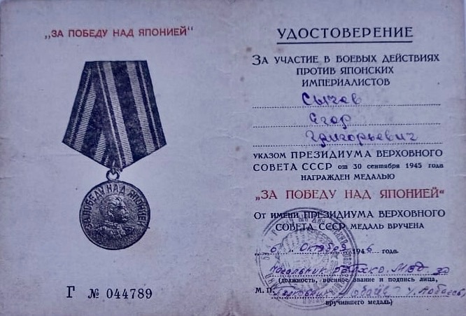 Мой дедушка-участник Великой Отечественной войны, Сычев Егор Григорьевич. Из Вагайского района, включая бывший Дубровинский, всего было мобилизовано на войну-9678 мужчин и женщин. Среди них был и мой дед Сычев Егор Григорьевич, родившийся 16 апреля 1926 года в деревне Наумово Вагайского района. Военную службу проходил в 53 пограничном отряде с 26 мая 1944 года по 2 февраля 1947 года, воинское звание рядовой запаса. Принимал участие в боевых действиях в войне с Японией. Награжден медалями: "За победу над Германией в Великой Отечественной войне 1941-1945", "За победу над Японией". После окончания войны принимал участие в строительстве Вагайского Маслозавода. Умер 30 января 1969 года в с.Вагай, Вагайского района. В нашей семье бережно хранятся все документы и награды дедушки .