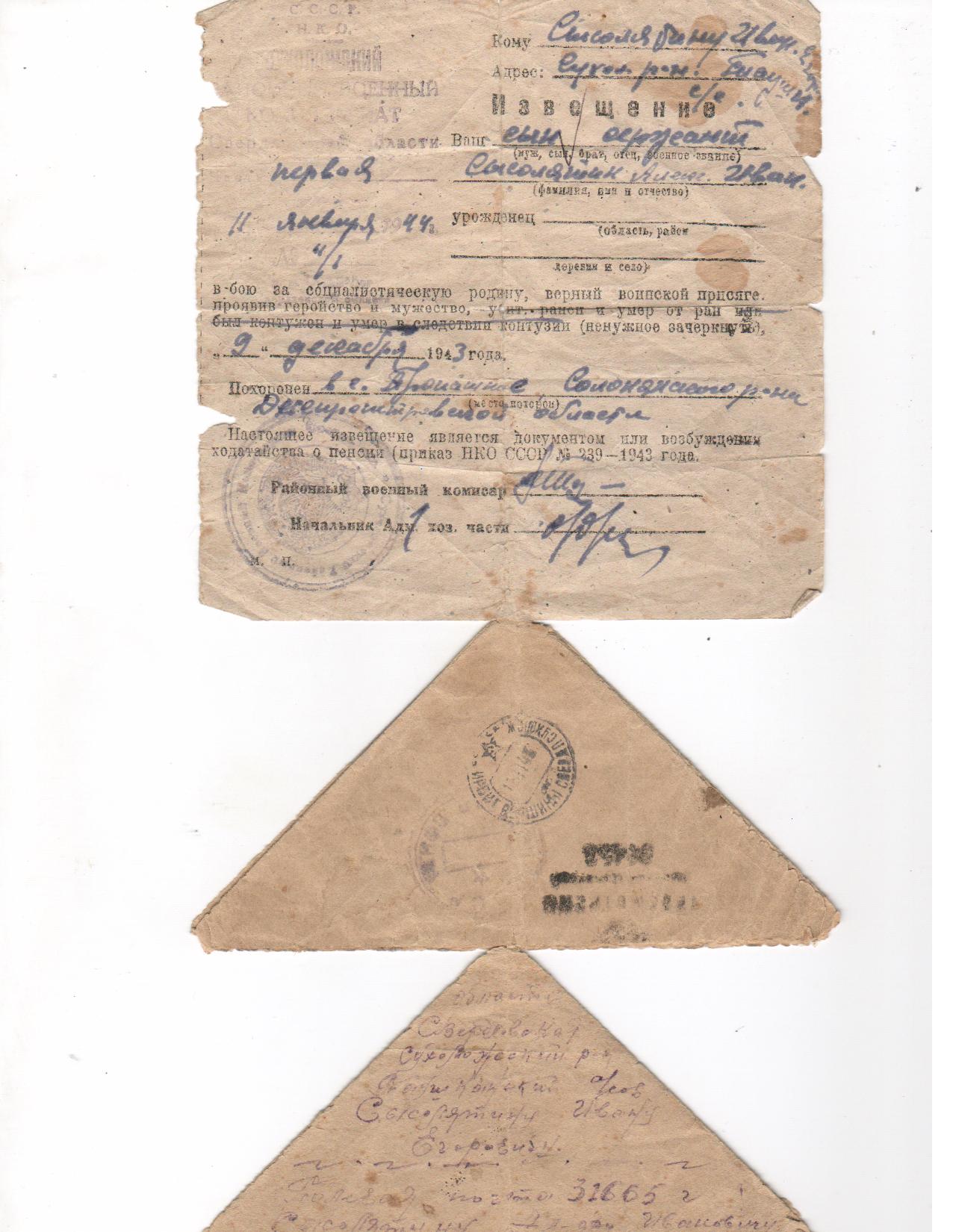 С фронта от Саши родные получили всего несколько писем- солдатских треугольников. В последнем письме он писал: «Привет с фронта! Здравствуйте мои дорогие