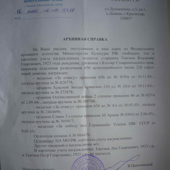 Гвардии старшина, разведчик. Прошёл с боями Сев. Кавказ, Крым, Курск, Украину, Кёнигсберг