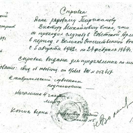 Тараканов Виктор Михайлович в августе 1942 года был призван в Советскую Армию и зачислен в отделение моторизованного инженерного Керченского ордена Красной Звезды батальона сапёром-минёром. Уволен в запас по ранению 23 февраля 1944 года (подорвался на мине). После войны работал в СШ №5 города Ставрополя учителем физики и автодела.
