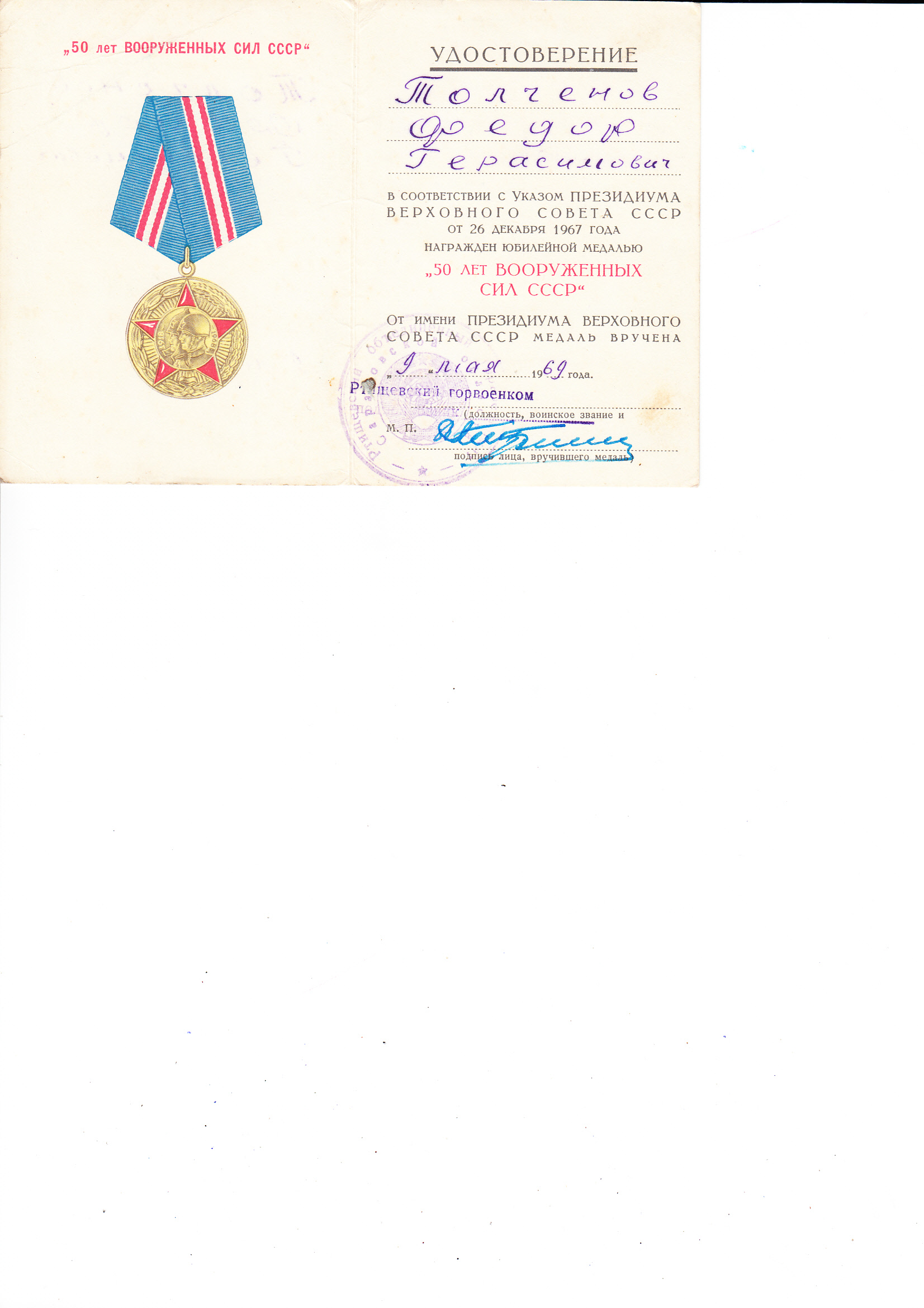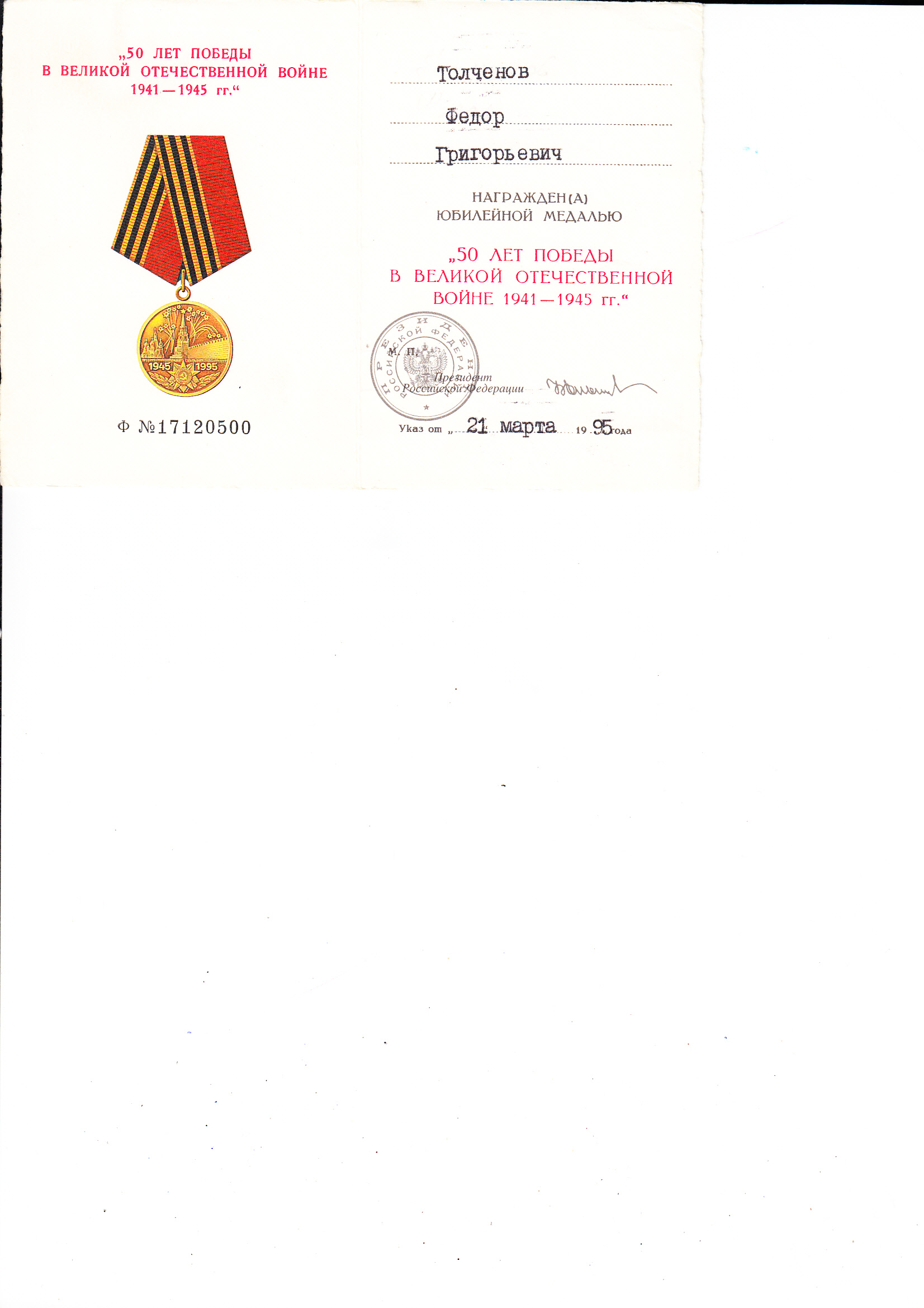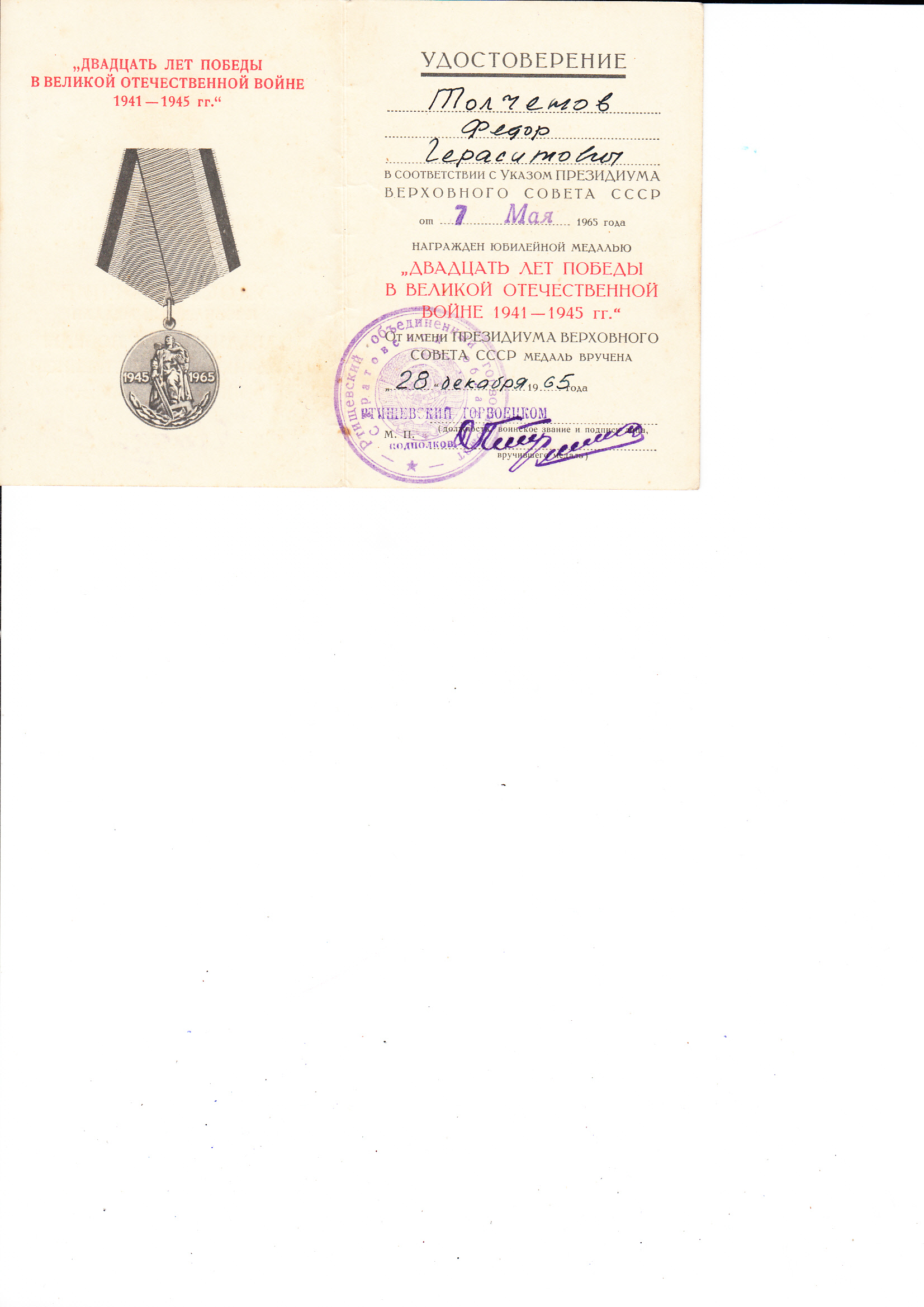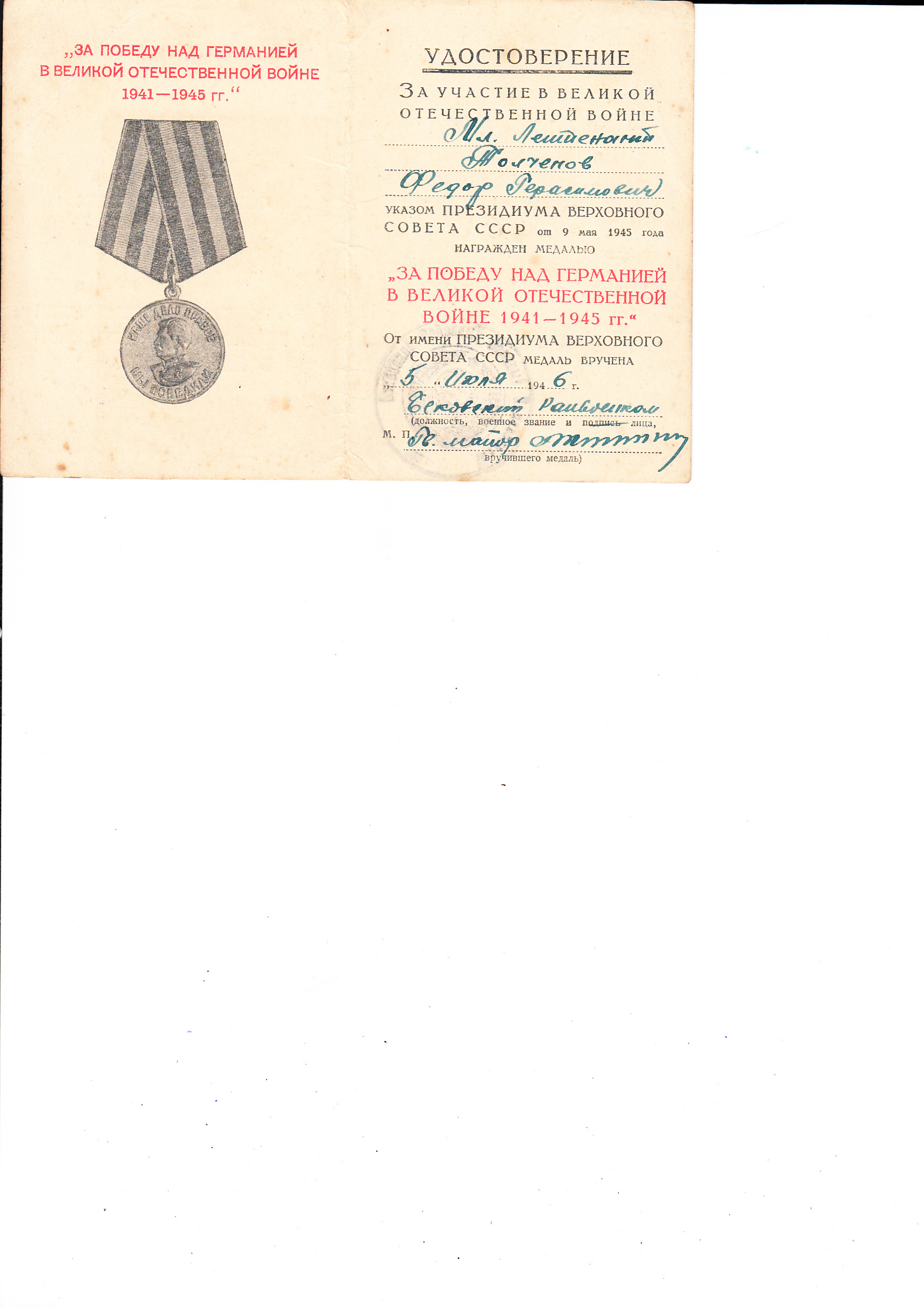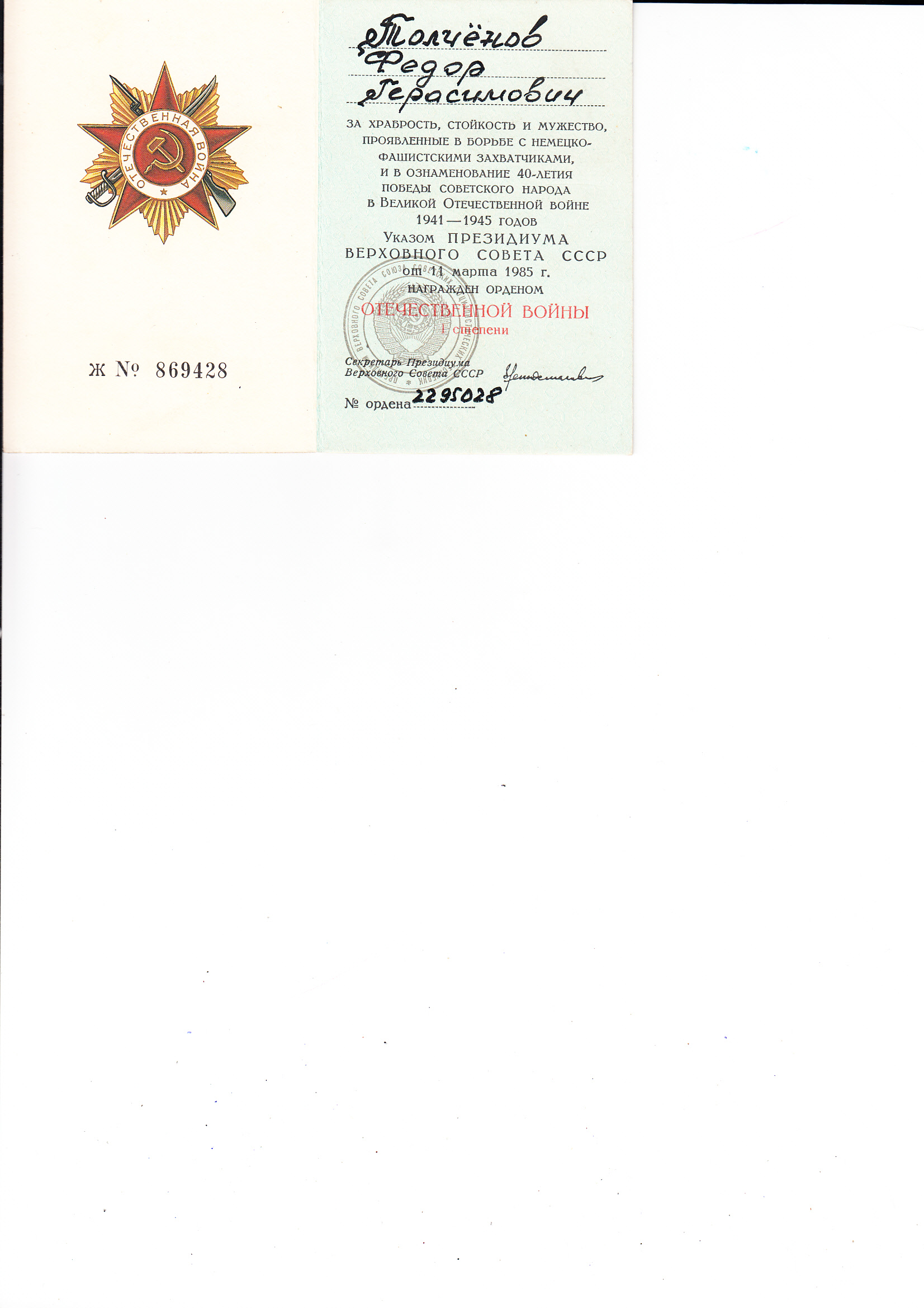 Мой дедушка, Толченов Федор Герасимович, попал на фронт в 1941 году будучи курсантом Артиллерии Западного фронта. В декабре 1941 был ранен, попал в госпиталь. В мае 1942 вернулся на фронт и в апреле 1943 стал командиром огневого взвода. В ноябре 1943 был ранен второй раз. Пролежав в госпитале 2 месяца, снова вернулся на фронт, после чего в феврале 1944 снова был ранен и отправлен в резерв. Однако в январе 1945 года снова находился в должности командира огневого взвода. После войны мой дедушка работал воспитателем в Свищёвском детском доме, директором Аткарского детского дома № 1, затем работал учителем, а также председателем исполкома Курганского сельского совета депутатов трудящихся. На оборотной стороне фотографий военных лет мой дедушка писал фамилии своих боевых товарищей - Угрюмов, Ульянов (госпиталь Балатира 20 января 1944 г.), Крутов Сергей, Сорокин Вова, Разран Сергей (г. Дулево 20.06.1944 г.)