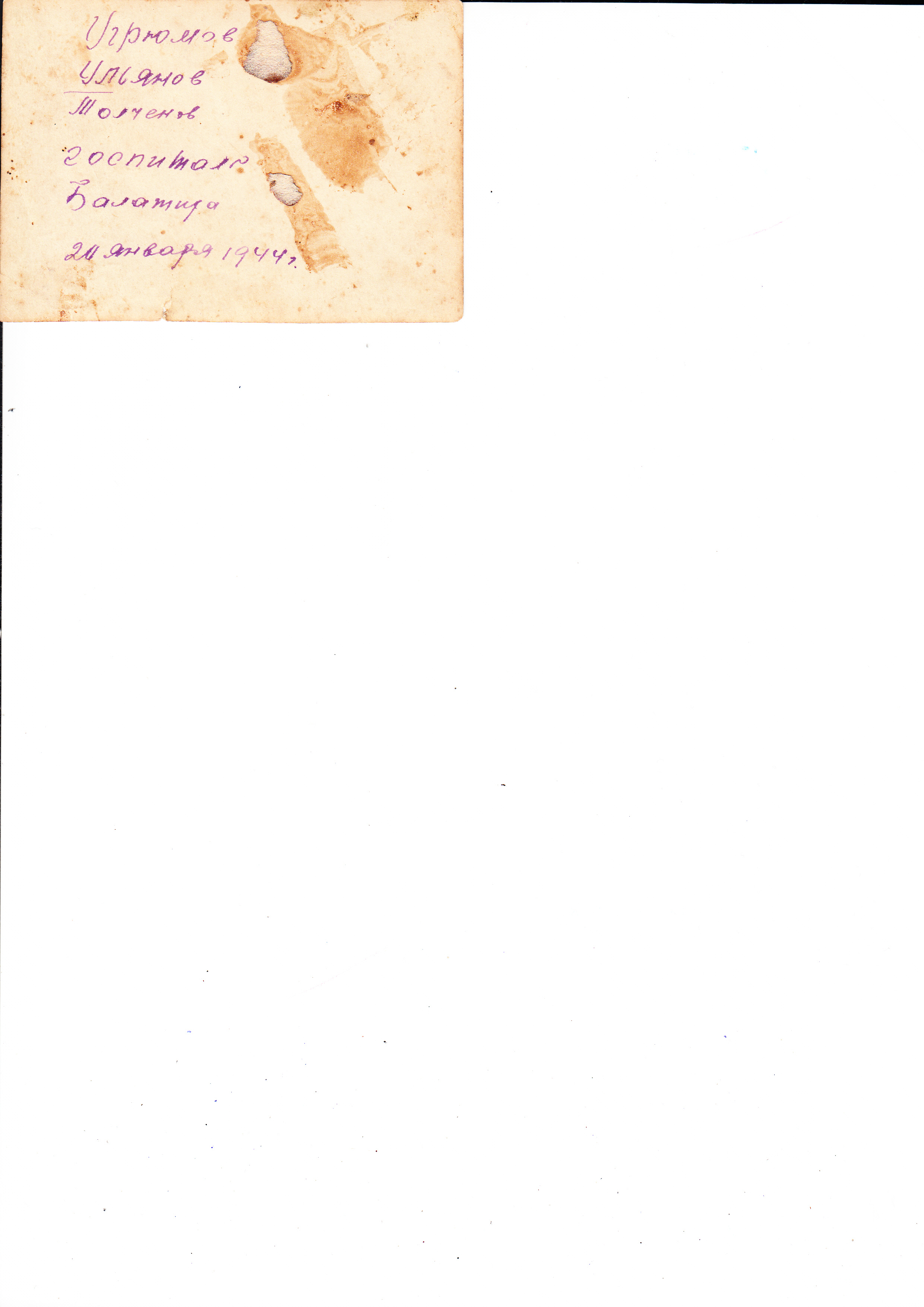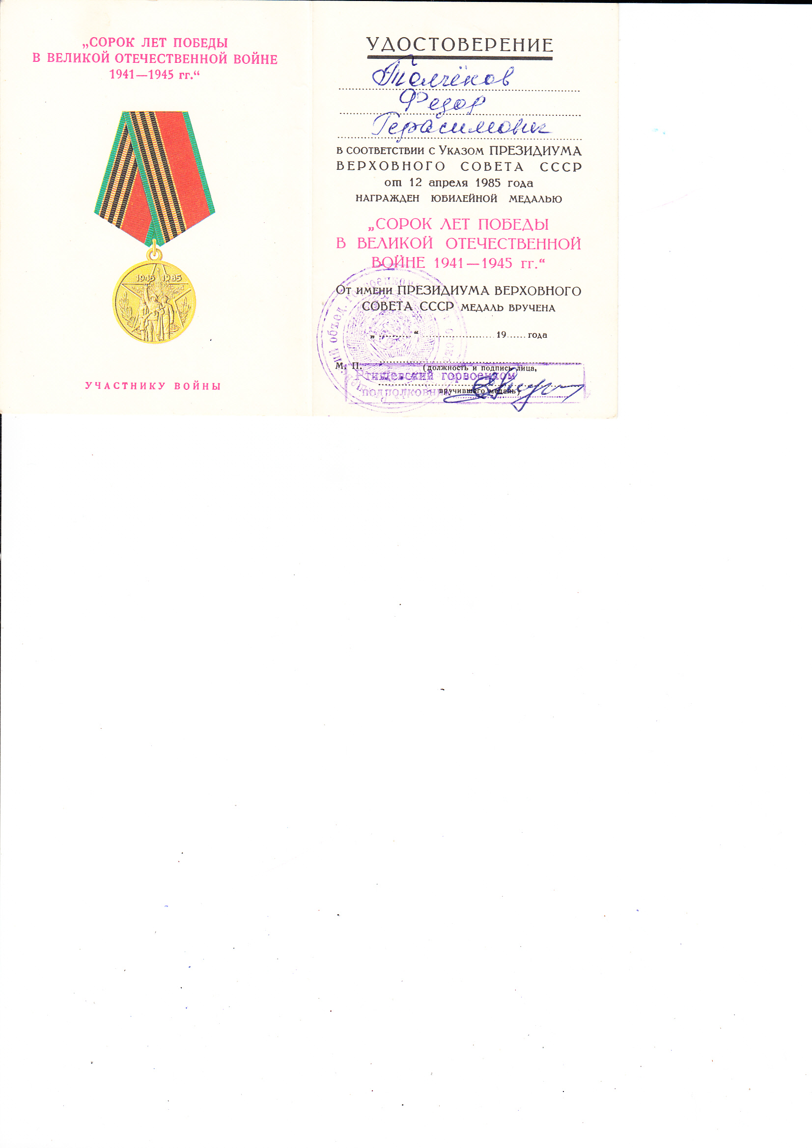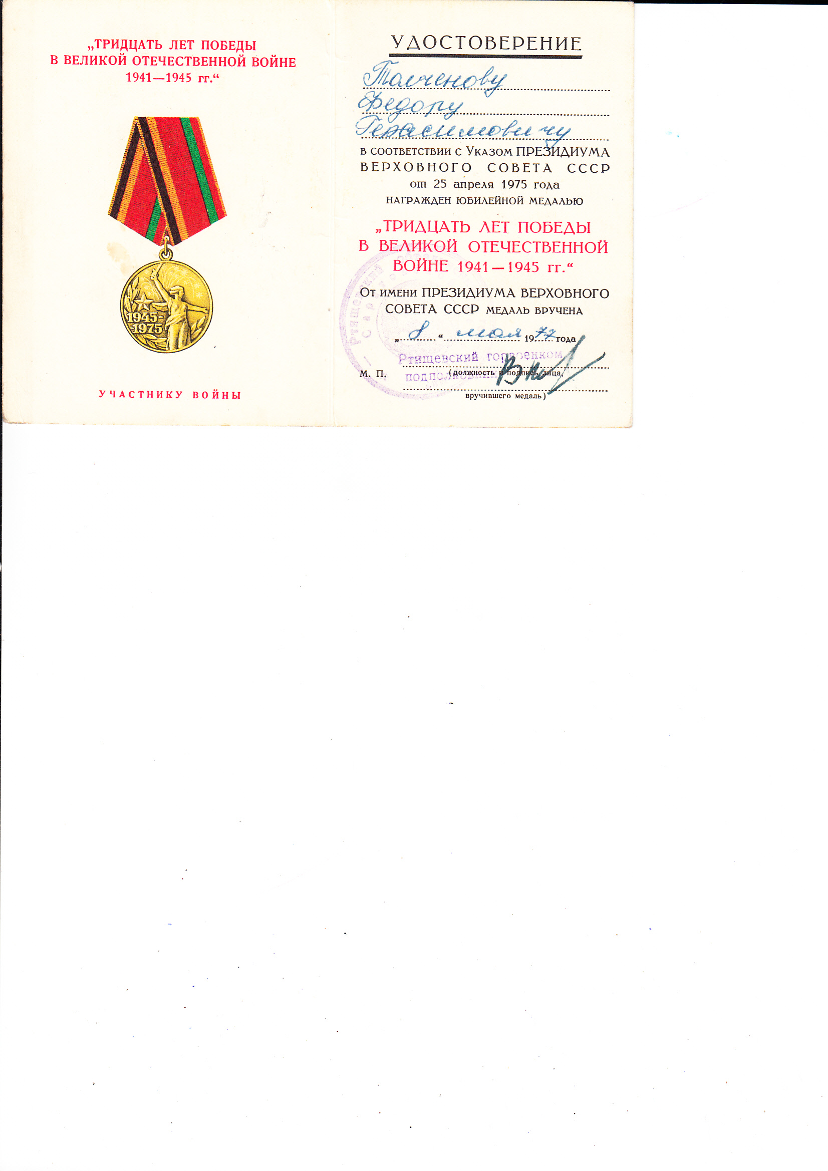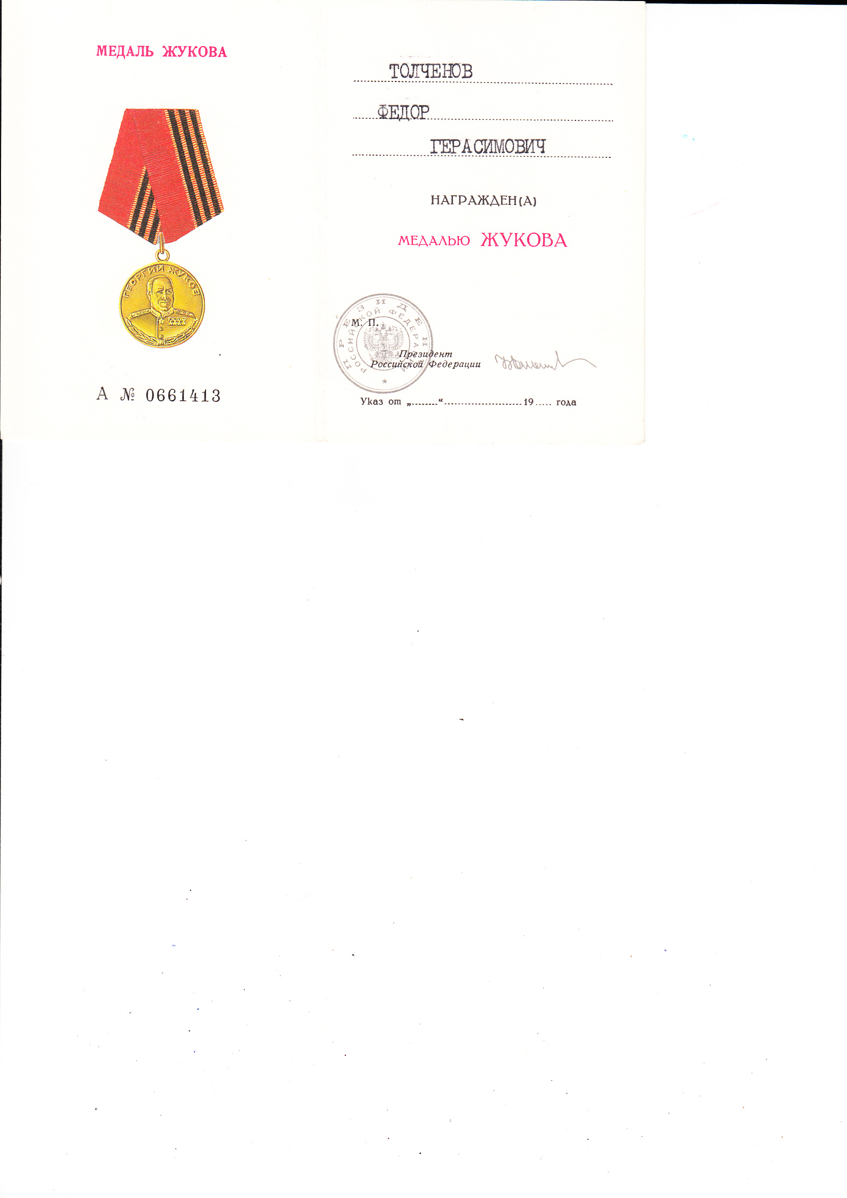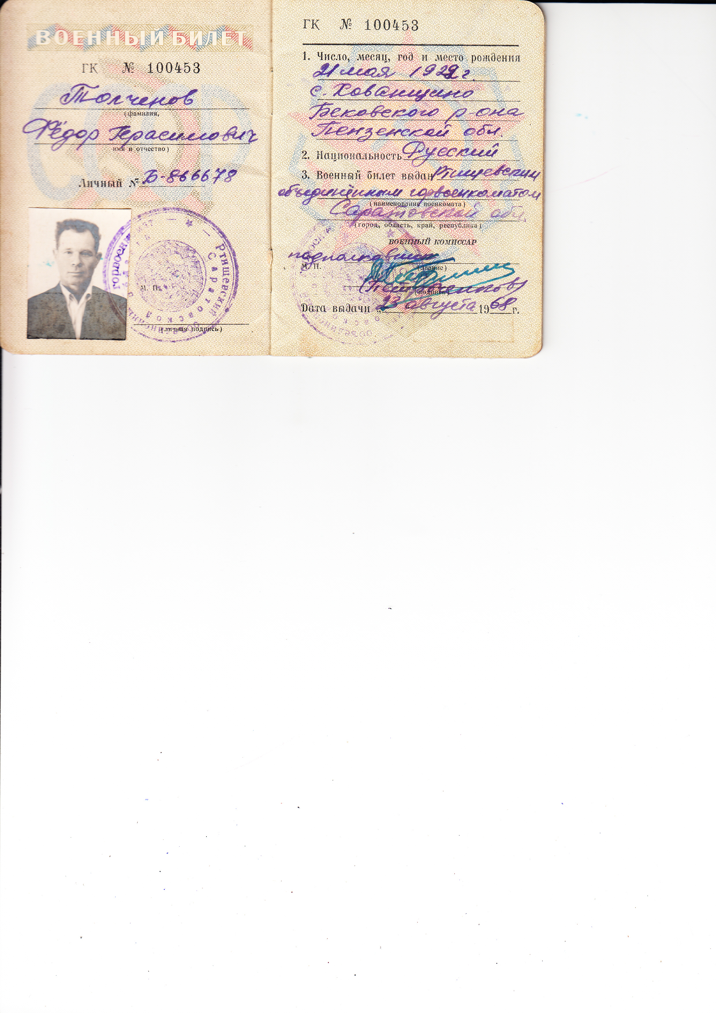 Мой дедушка, Толченов Федор Герасимович, попал на фронт в 1941 году будучи курсантом Артиллерии Западного фронта. В декабре 1941 был ранен, попал в госпиталь. В мае 1942 вернулся на фронт и в апреле 1943 стал командиром огневого взвода. В ноябре 1943 был ранен второй раз. Пролежав в госпитале 2 месяца, снова вернулся на фронт, после чего в феврале 1944 снова был ранен и отправлен в резерв. Однако в январе 1945 года снова находился в должности командира огневого взвода. После войны мой дедушка работал воспитателем в Свищёвском детском доме, директором Аткарского детского дома № 1, затем работал учителем, а также председателем исполкома Курганского сельского совета депутатов трудящихся. На оборотной стороне фотографий военных лет мой дедушка писал фамилии своих боевых товарищей - Угрюмов, Ульянов (госпиталь Балатира 20 января 1944 г.), Крутов Сергей, Сорокин Вова, Разран Сергей (г. Дулево 20.06.1944 г.)