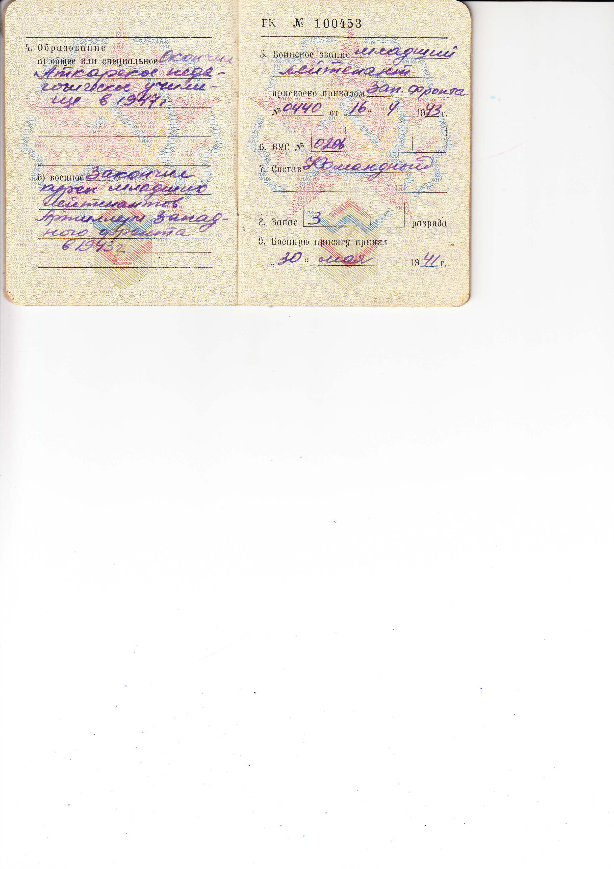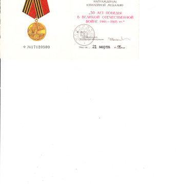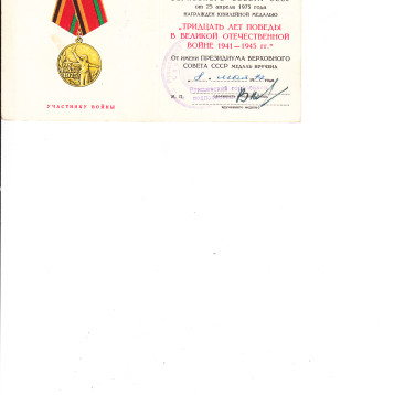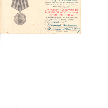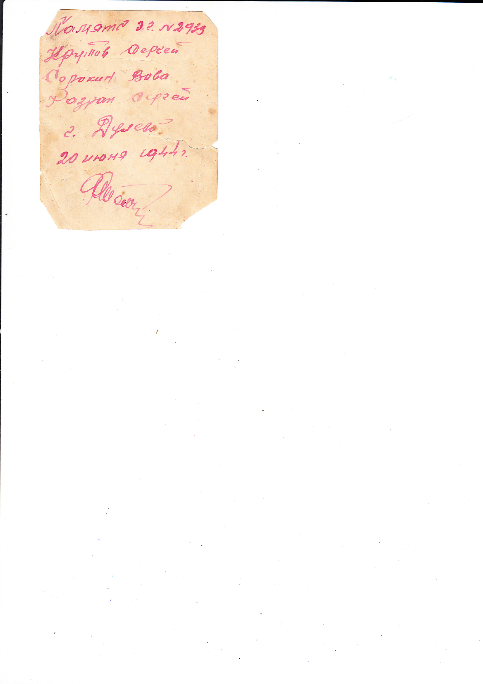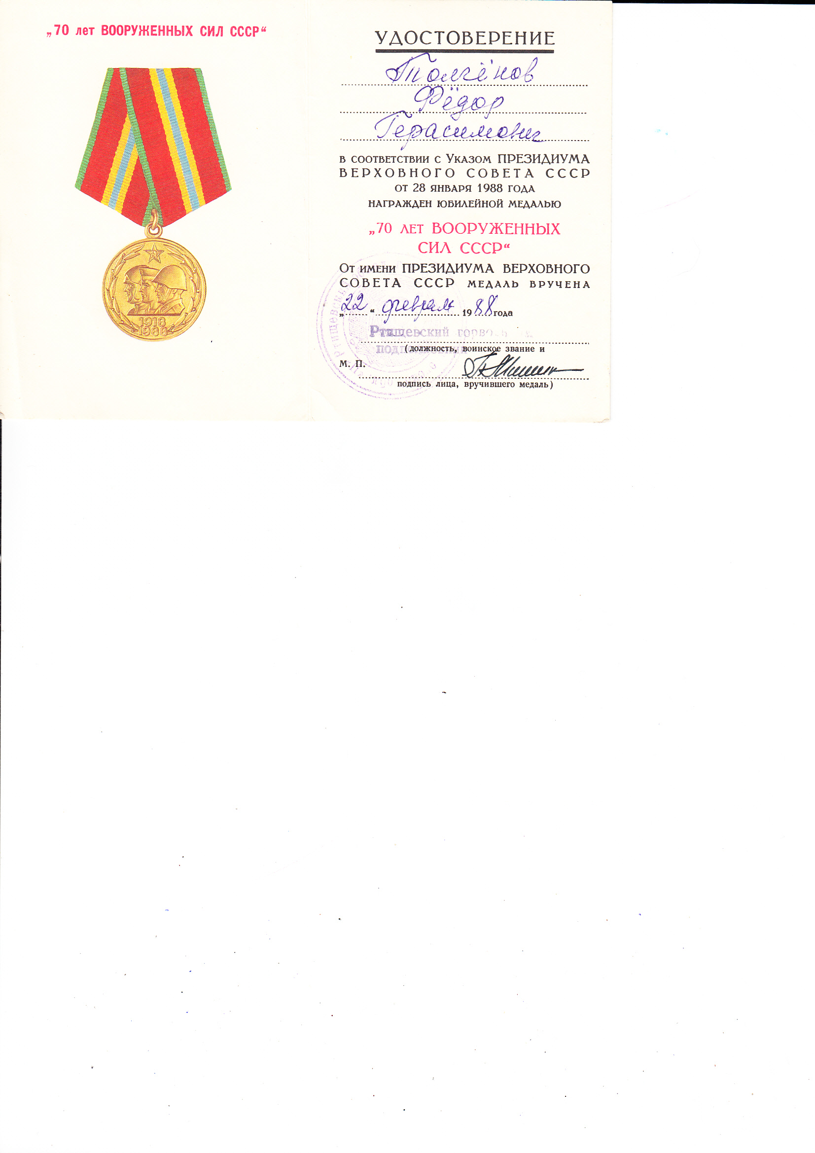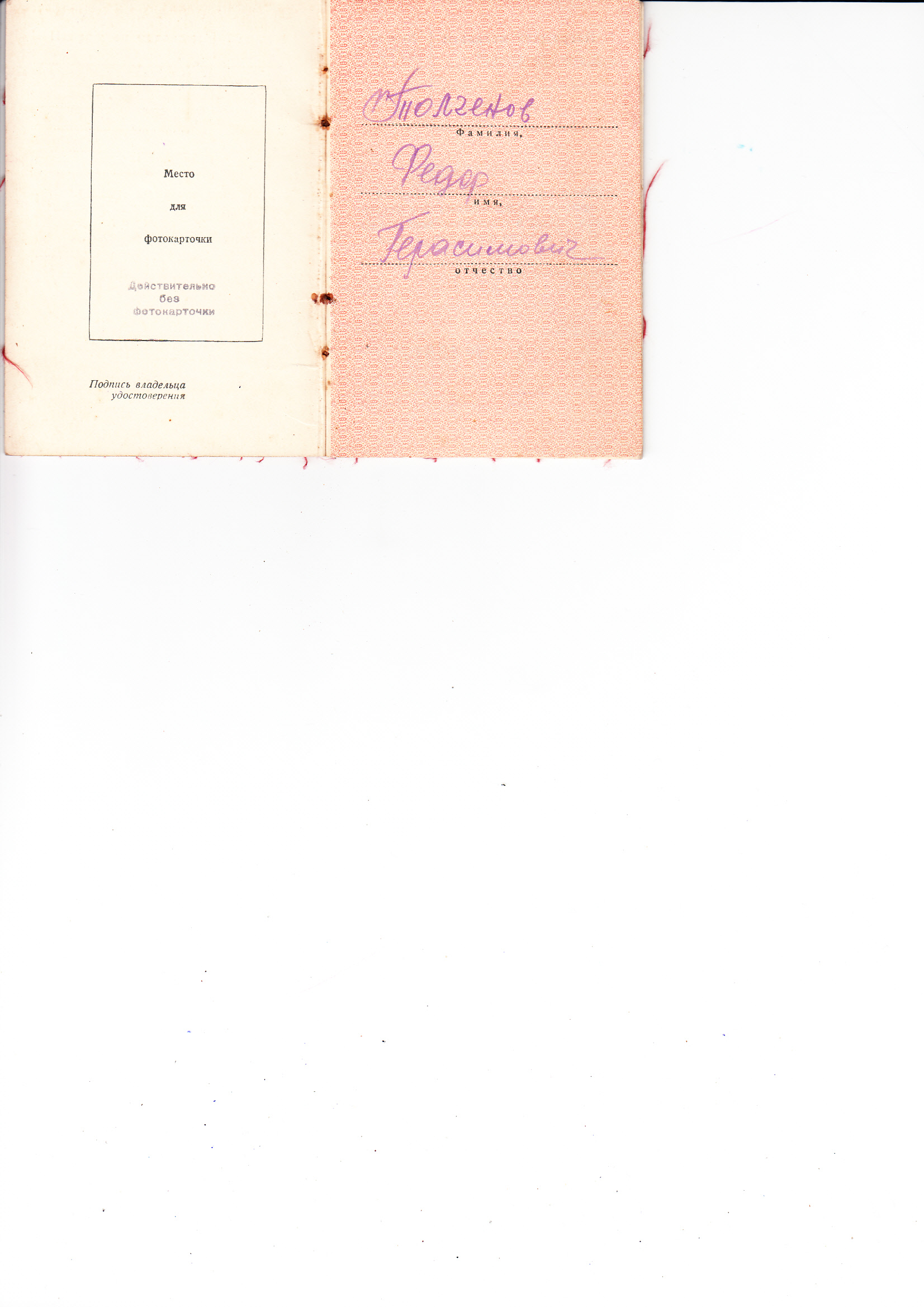 Мой дедушка, Толченов Федор Герасимович, попал на фронт в 1941 году будучи курсантом Артиллерии Западного фронта. В декабре 1941 был ранен, попал в госпиталь. В мае 1942 вернулся на фронт и в апреле 1943 стал командиром огневого взвода. В ноябре 1943 был ранен второй раз. Пролежав в госпитале 2 месяца, снова вернулся на фронт, после чего в феврале 1944 снова был ранен и отправлен в резерв. Однако в январе 1945 года снова находился в должности командира огневого взвода. После войны мой дедушка работал воспитателем в Свищёвском детском доме, директором Аткарского детского дома № 1, затем работал учителем, а также председателем исполкома Курганского сельского совета депутатов трудящихся. На оборотной стороне фотографий военных лет мой дедушка писал фамилии своих боевых товарищей - Угрюмов, Ульянов (госпиталь Балатира 20 января 1944 г.), Крутов Сергей, Сорокин Вова, Разран Сергей (г. Дулево 20.06.1944 г.)