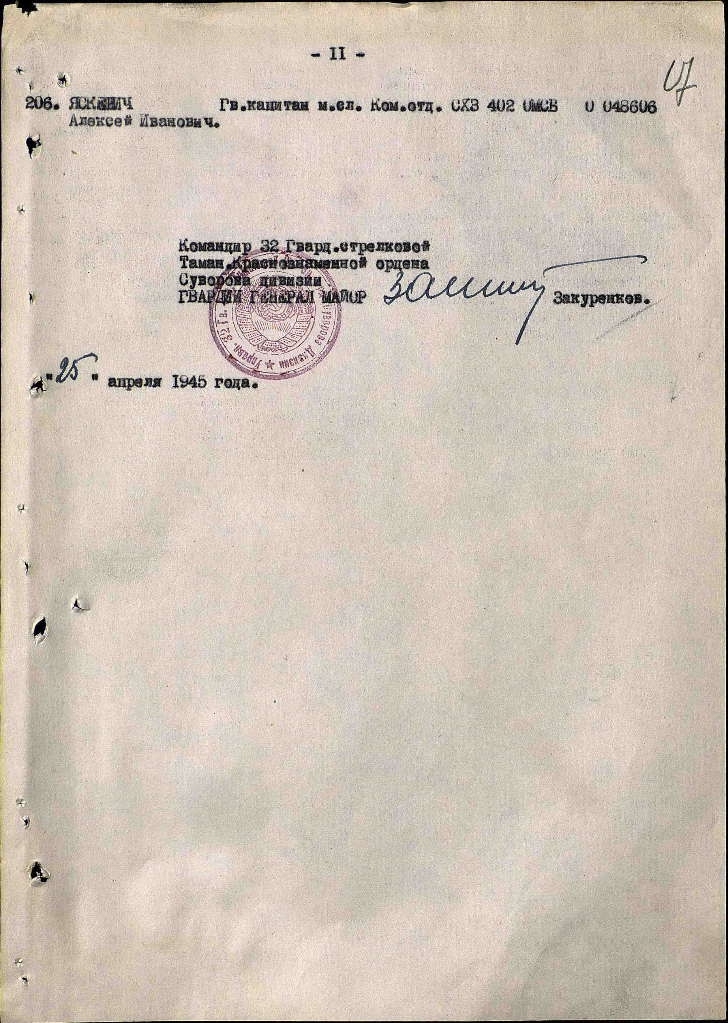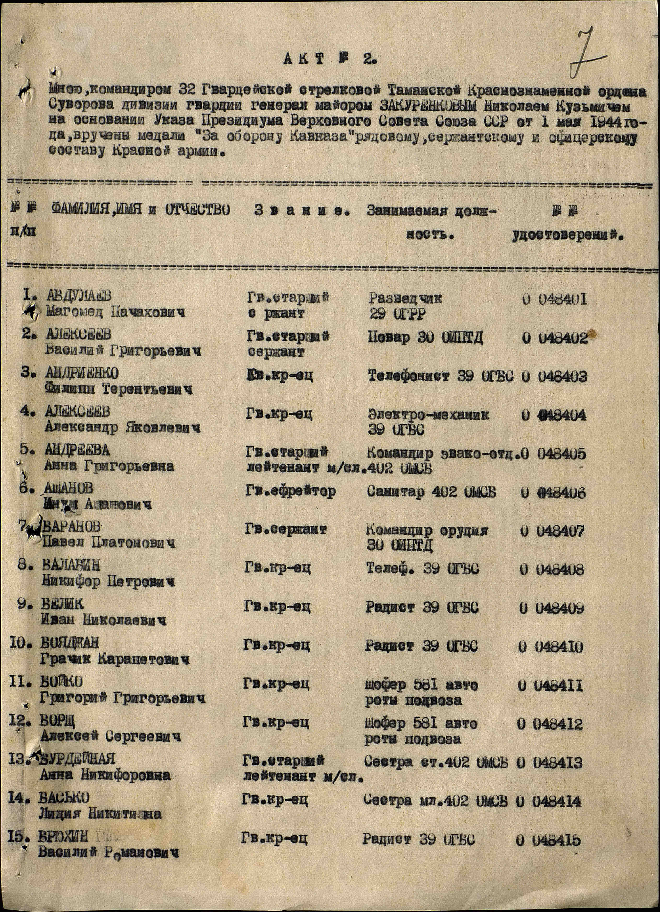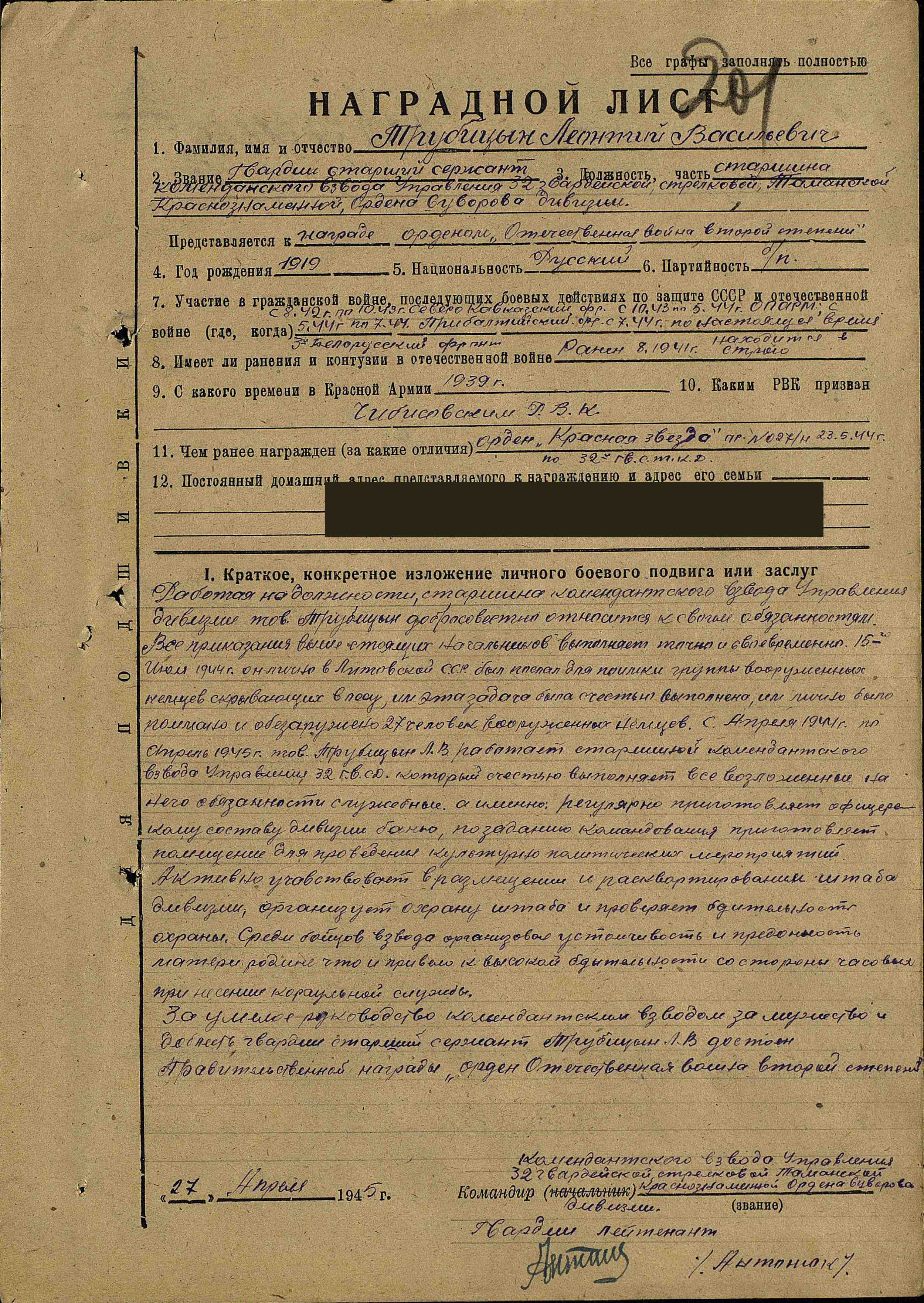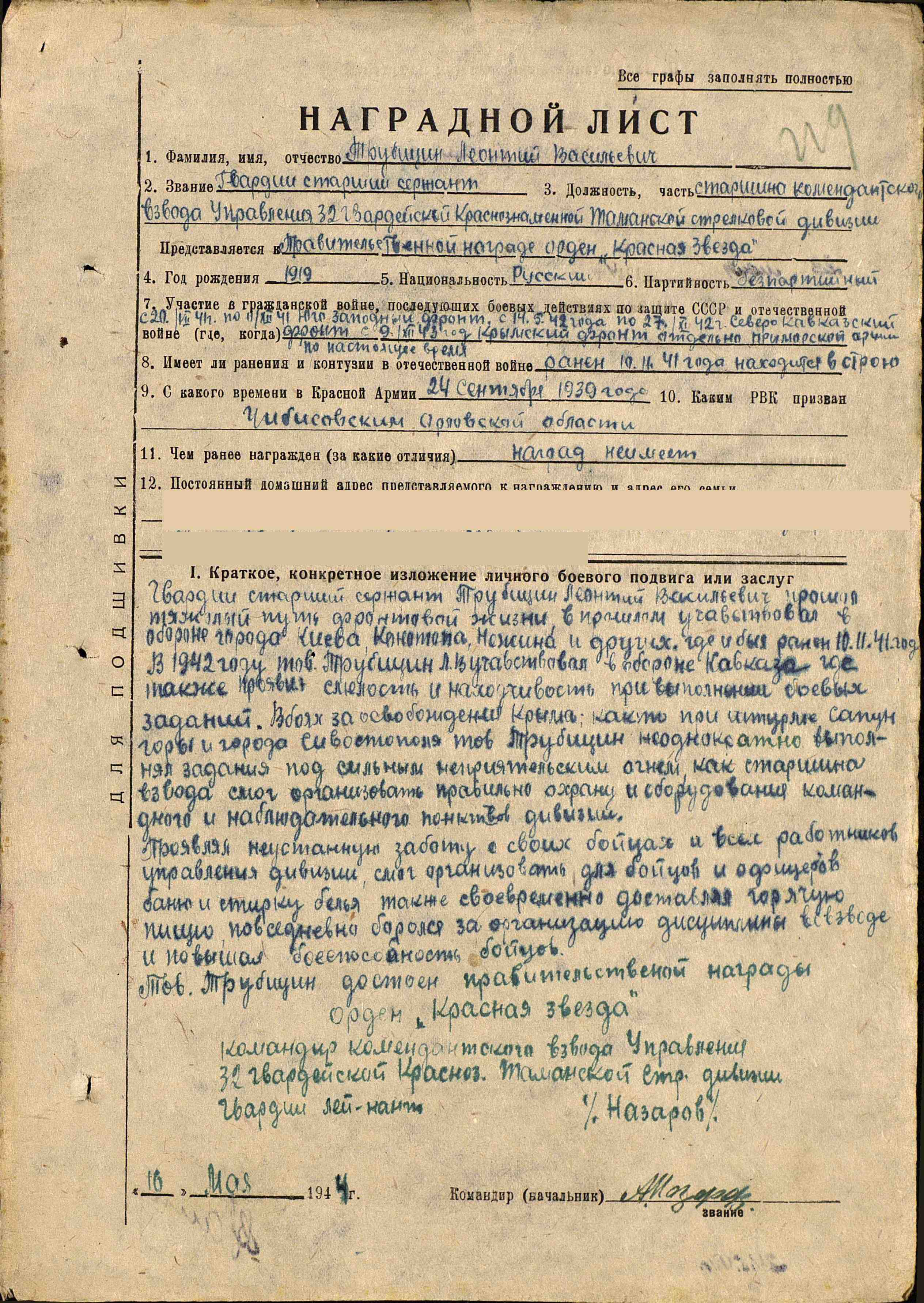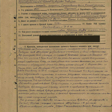 Призван в Красную Армию в 1939 г. Ветеран и участник ВОВ Старшина комендантского взвода Управления 32 гвардейской стрелковой Таманской Краснознаменной дивизии. Писарь. Награжден Орденом Красной Звезды дважды , Орденом Отечественной войны II степени, Медаль за отвагу, Медаль за боевые заслуги, Медаль за взятие Кенинсберга, Медаль за оборону Кавказа, Медаль за оборону Севастополя. Участвовал в Северо-Кавказском Фронте (август 1942-октябрь 1943),Отдельной Приморской армии (ОПАРМ) (октябрь 1943-май 1944), Прибалтийском фронте (май 1944-июль 1944), Белорусском фронте (июль 1944-1945). В августе 1941 был ранен. Окончание войны встретил в Прибалтике.