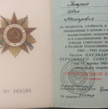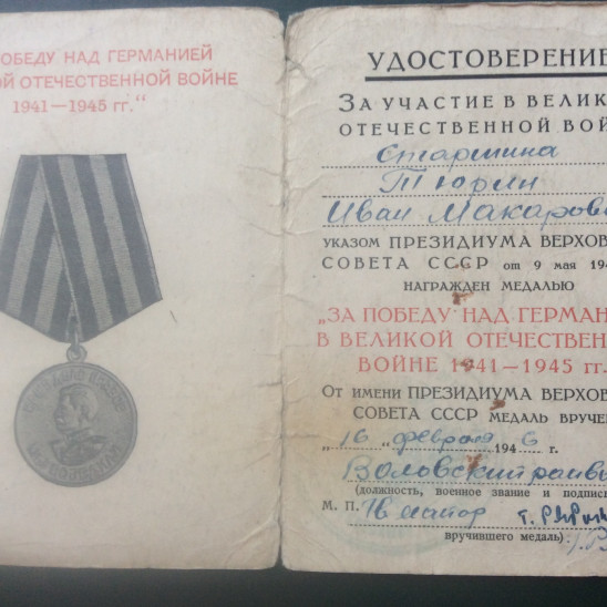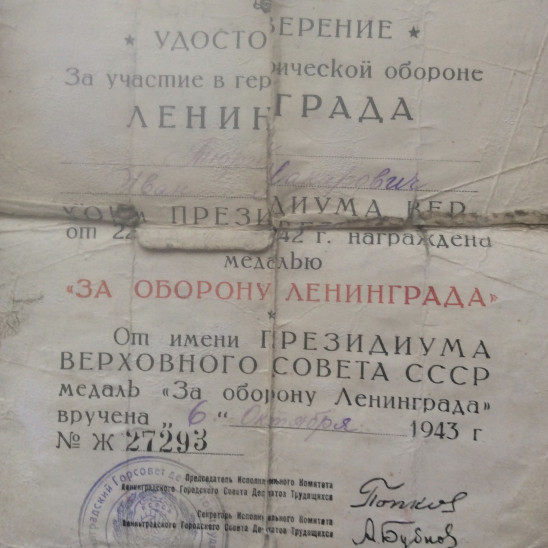Дедушка сначала участвовал в Советско-Финской войне, потом сразу был призван на Великую Отечественную войну. Участвовал в битве за Сталинград, в обороне Ленинграда, в 1942 году был ранен, оторвало пальцы на ноге, после лечения вернулся в строй, прошёл всю войну до конца. Имеет медали и ордера. Дедушка не любил вспоминать и рассказывать про войну, поэтому сведений у нас немного. Он был отважным, мужественным, отзывчивым. Мы его помним и ценим то, что он сделал для будущего нашей Родины и для нас, своей семьи!