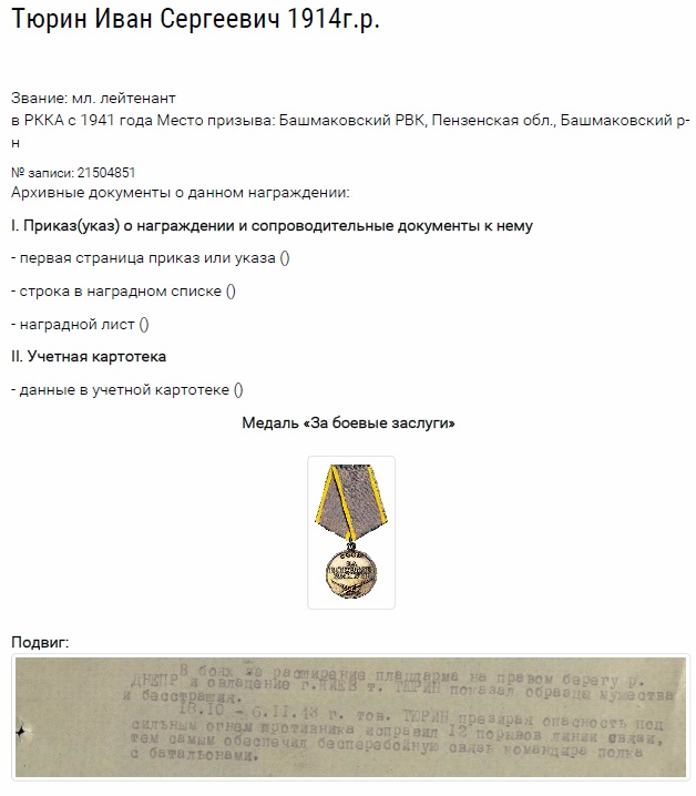 Мой дедушка Тюрин Иван Сергеевич родился 10 ноября 1914 года в селе Митрофаново Башмаковского района Пензенской области. В 1941 году был призван в ряды Красной Армии для защиты Отечества. В июне 1943 года принимал участие в боевых действиях на Воронежском фронте.Участвовал в боевых действиях в действующей Армии в составе 529 стрелкового полка 72 стрелковой дивизии. Был назначен командиром телефонно-кабельного взвода роты связи 764 стрелкового полка 232 Сумско-Киевской стрелковой дивизии 40 армии 1 Украинского фронта.В боях за расширение плацдарма на правом берегу реки Днепр и овладение г. Киев, младший лейтенант Тюрин Иван Сергеевич, показал образцы мужества и бесстрашия.С 18 октября по 6 ноября 1943 года мой дед, презирая опасность под сильным огнем противника, исправил 12 порывов линии связи, тем самым обеспечил бесперебойную связь командира полка с батальонами.От имени Президиума Верховного Совета СССР за образцовое выполнение боевых заданий командования на фронте борьбы с немецкими захватчиками и проявленные при этом доблесть и мужество, был награжден медалью за «Боевые заслуги».В период участия в боевых действиях дедушка был ранен дважды, одно из ранений получил в январе 1944 года при участии в освобождении города Белая Церковь. После лечения в военном госпитале продолжил свой боевой путь до мая 1945 года.В мирное время дедушка проживал со своей большой семьей в Республике Бурятия, г.Улан-Удэ. Работал на железной дороге. Награжден медалью "Ветеран труда" и юбилейными медалями. Умер 14 марта 1984 года в возрасте 69-ти лет.Вечная память о нашем дедушке хранится в благодарных сердцах потомков.