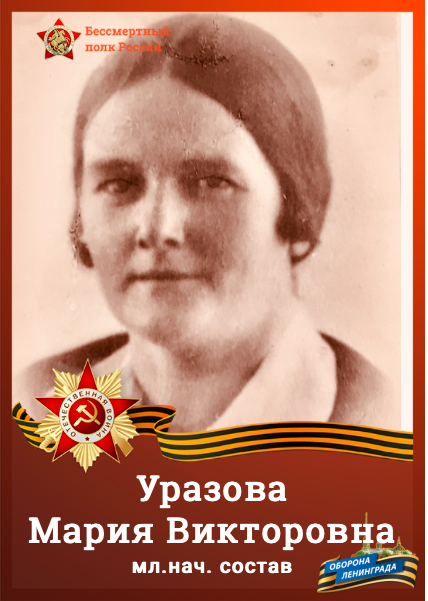 Уразова Мария Викторовна в годы блокады Ленинграда работала в Педиатрическом медицинском институте медицинской сестрой. Там располагался военный госпиталь, где выхаживали истощенных голодом, больных и раненых детей Ленинграда. Во время артобстрела в декабре 1942 г. она самоотверженно спасала раненых и больных детей, а сама получила ранение. Награждена в октябре 1943 г. медалью "За оборону Ленинграда";. У Марии Викторовны в блокадном Ленинграде жила вся семья - муж и трое детей. Все выжили. В Педиатрическом институте Мария Викторовна проработала всю свою трудовую жизнь до пенсии.