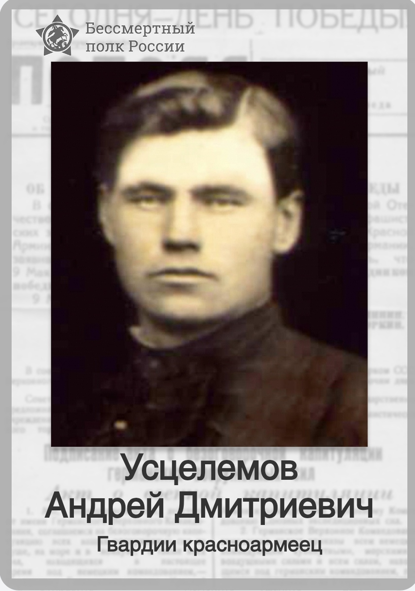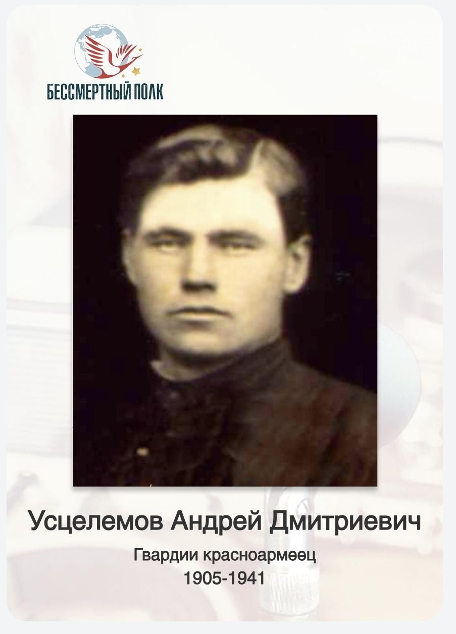 До войны проживал на Южном Урале Челябинская область Колхозный ныне Уйский район. Призвался на войну в первые дни июня 27. 06.1941 года ничего не известно до настоящего времени о месте гибели нашего дедушки Усцелемова Андрея Дмитриевича . Считается пропавшим без вести с 09.1941 года.