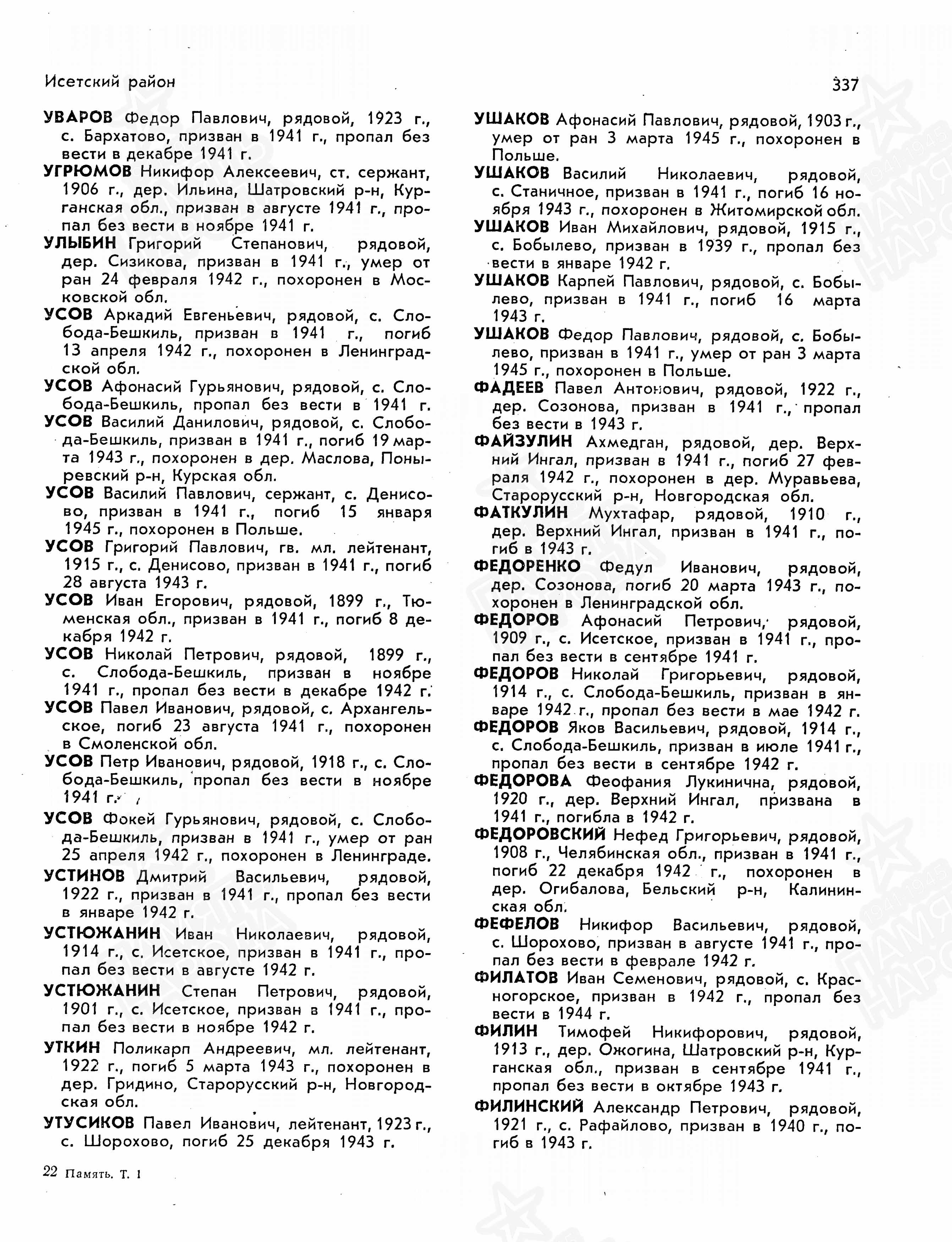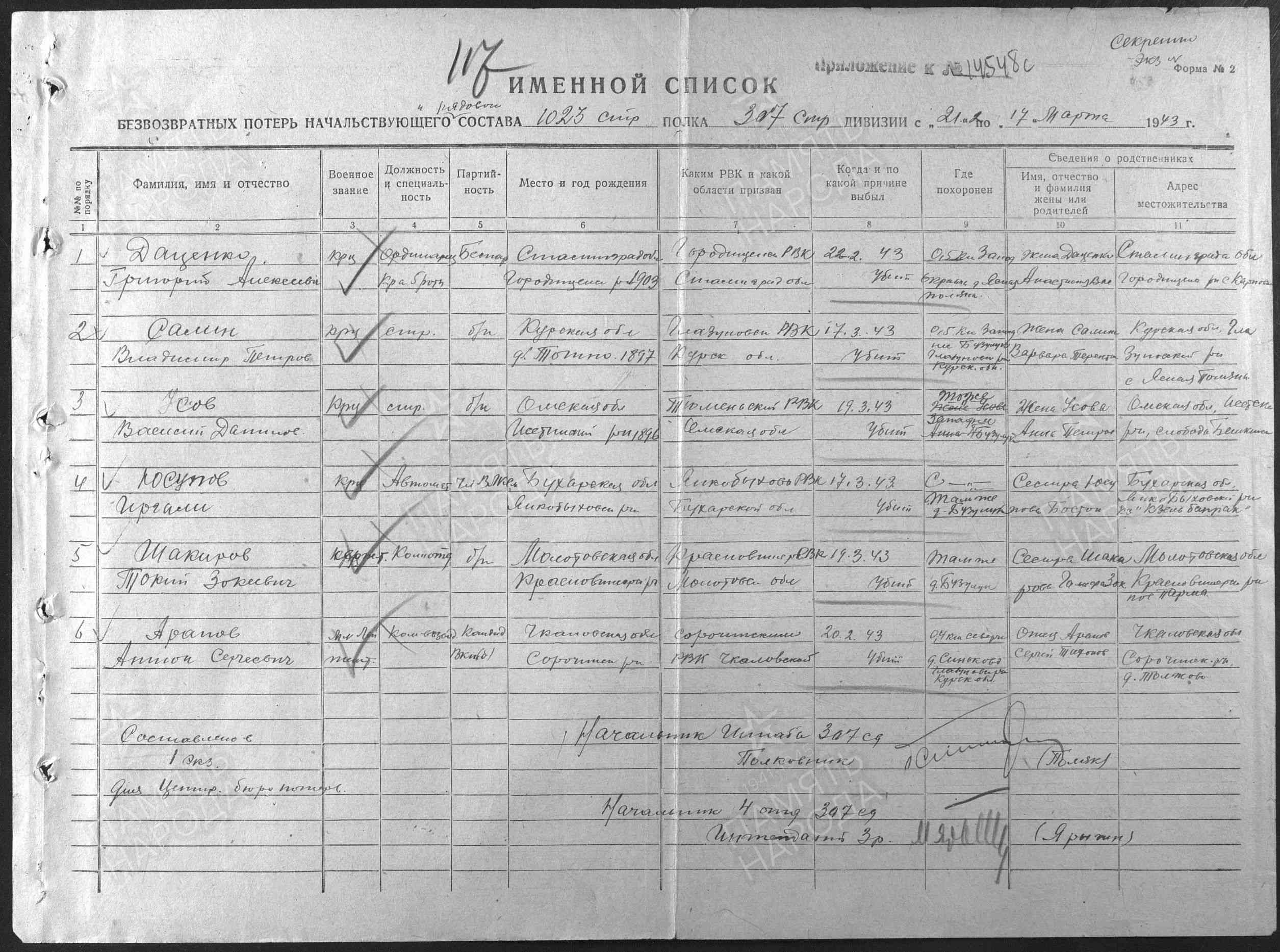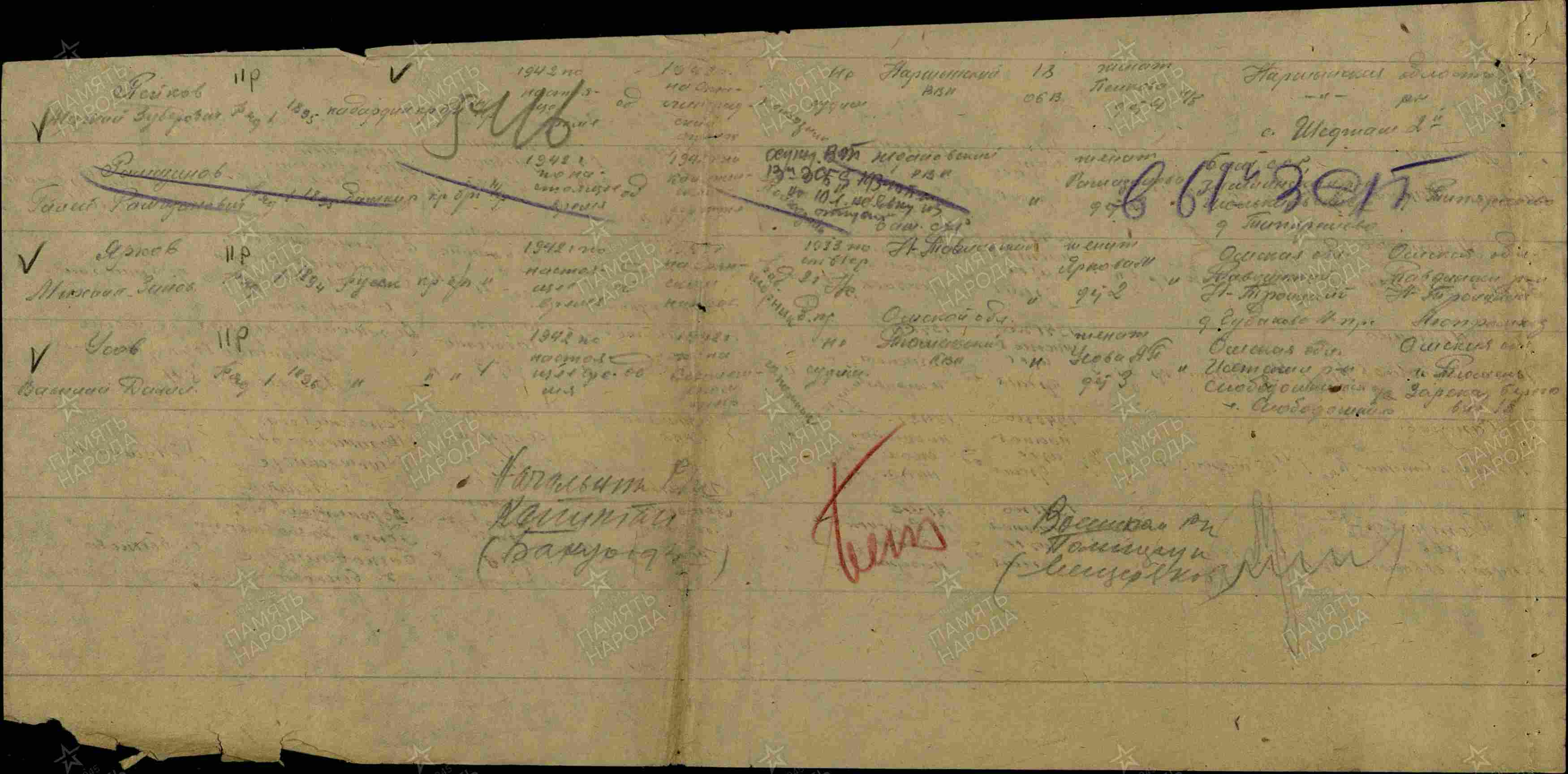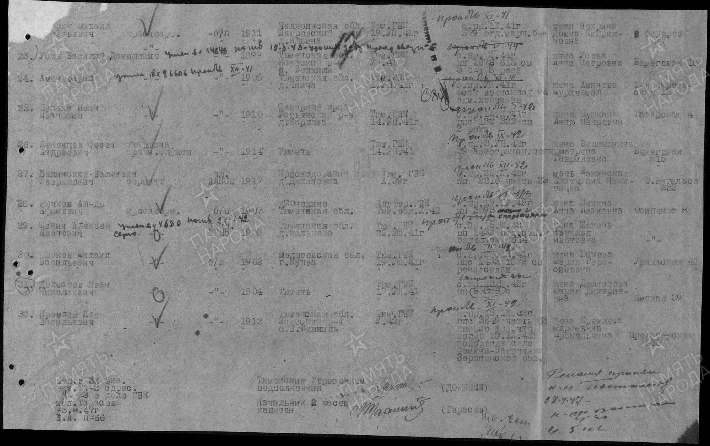Жена Усова Анна Петровна, трое детей. Призван в августе 1941 года Тюменским РВК, Омской области. Служил в 307 стрелковой дивизии. 19 марта 1943 года был убит в бою. Похоронен западнее д. Бузулук, Малоархангельского р-на, Орловской области, по другому документу в д. Маслова, Поныревского района, Курской области