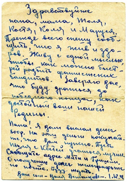 Валентин, закончив Подольское военное стрелково-пулеметное училище, попал в самую гущу наступательных боев наших частей. В декабре 1941 года родным пришло извещение о том, что лейтенант Успенский пропал без вести. Незадолго до этого семья получила короткое письмо на почтовой карточке от Валентина (см фото): «Здравствуйте, папа, мама, Толя, Костя, Коля и Маруся. Прежде всего спешу сообщить вам, что я жив и здоров. Живу с одной мыслью, чтобы как можно быстрее разбить фашистских бандитов. Заверяю вас, что буду драться до победного конца, как достойный воин нашей Родины. Папа! Я Вам выслал денег 800 рублей. На эти деньги покупайте, что Вам нужно. Пусть Толя с Костей учатся лучше. Сообщите адрес Мити и Гриши. О получении денег телеграфьте по почте. Буду ждать. Ваш сын - Валя Успенский. 1.12. 1941 г.»