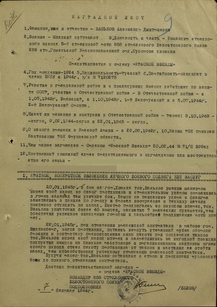 Даты подвига 20.01.1945,22.01.1945 за что и был представлен к ордену "Красной звезды"