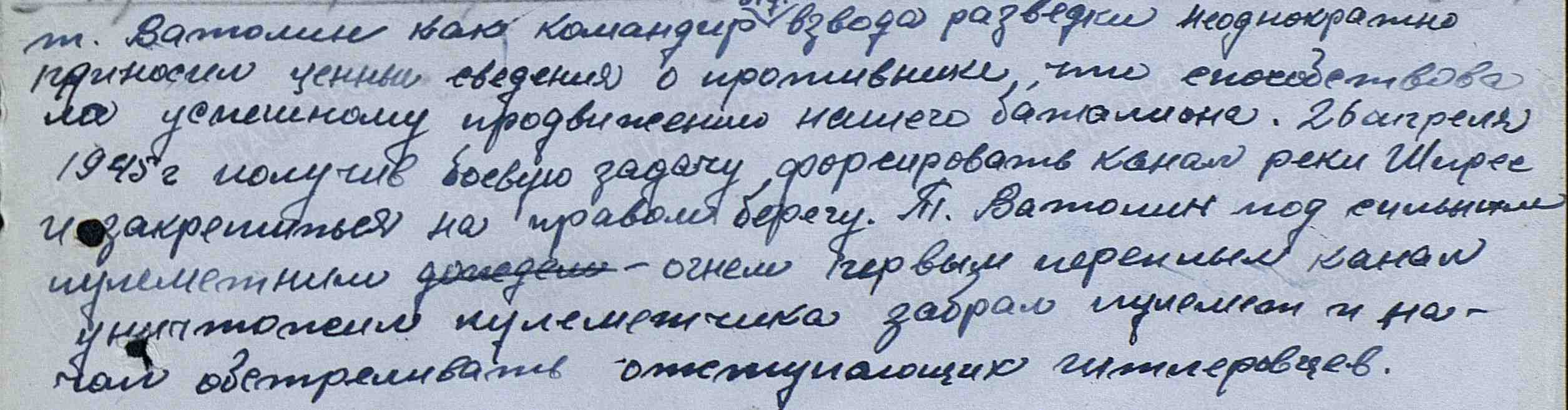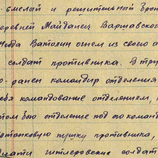 Боевой путь ветерана на войну в 17 лет. Прямо с поля,где проводились работы. Во время войны прошёл очень многое. Во время боя был сильно ранен в ногу,так же был контужен. Свою военную службу окончил 16 июня 1950г.После чего вернулся домой. Выростил 1-го сына и 2-ух дочерей . После войны: После войны служил в Польше,с 1945г. по16 июня 1950 в звании сержанта. Его командиром был: Константин Константинович Рокосовский .