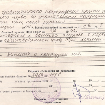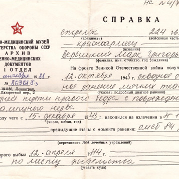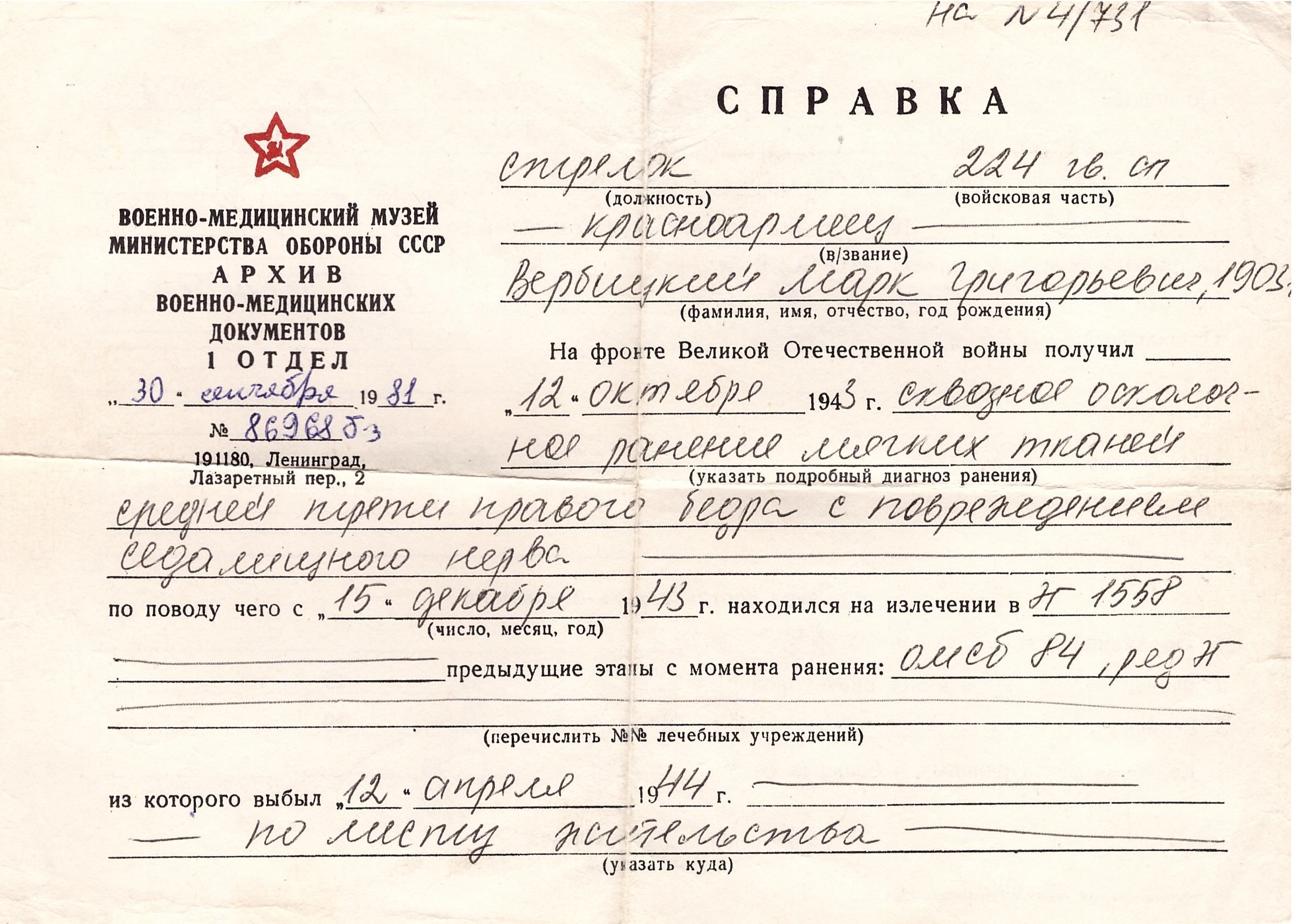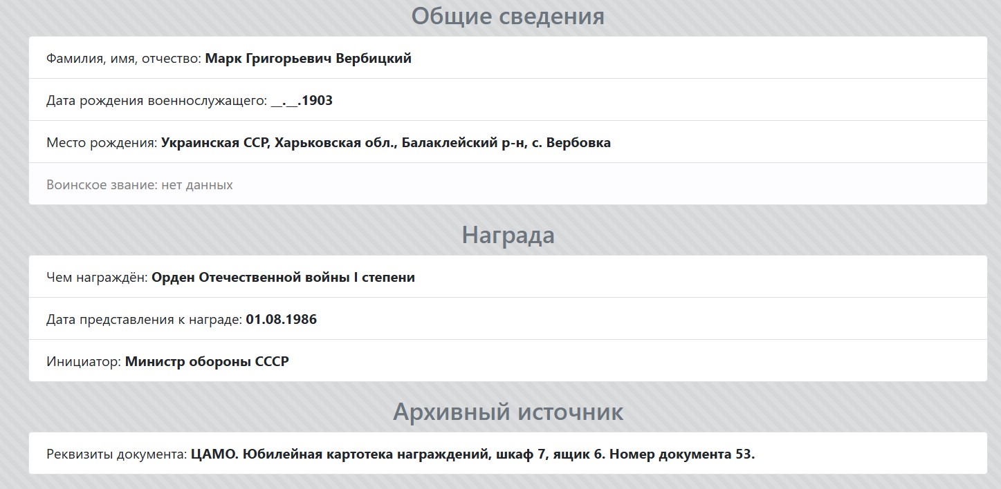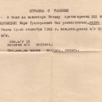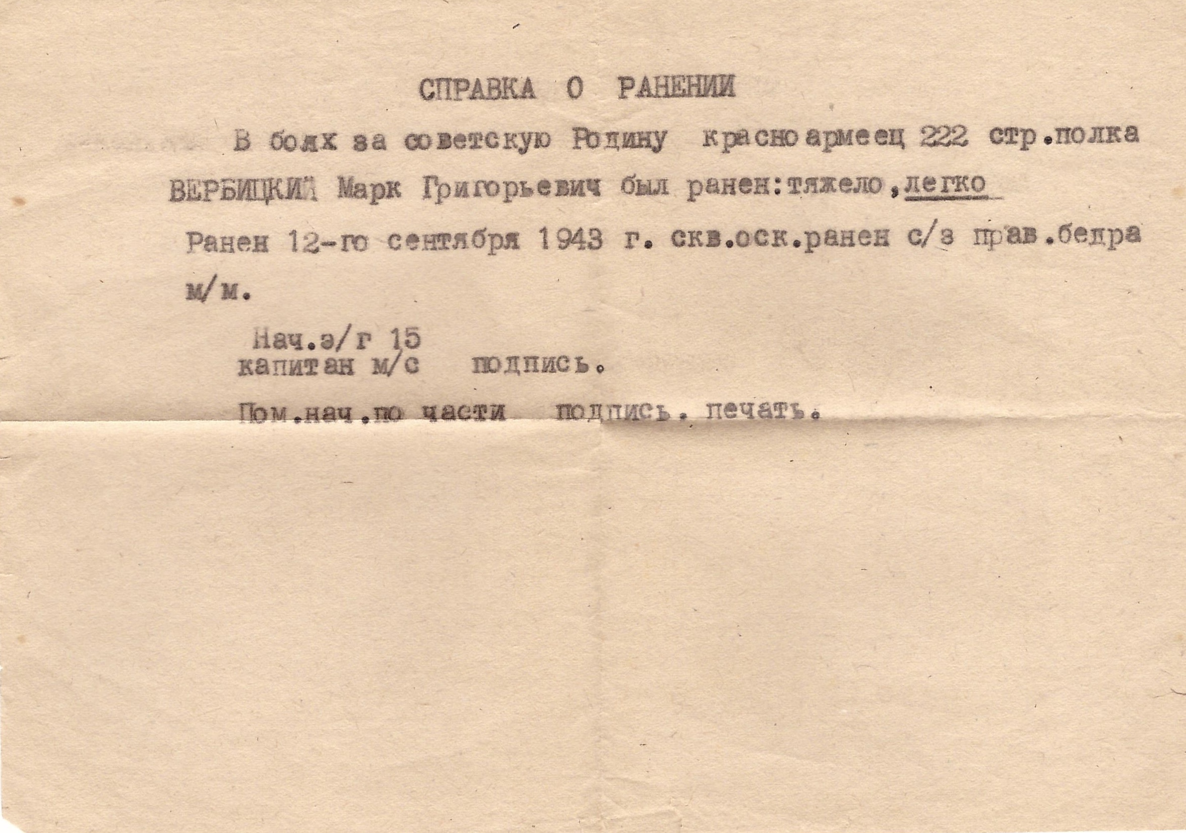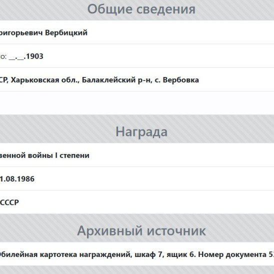 Мой прапрадед Вербицкий Марк Григорьевич, был призван в СА в первые дни войны, стрелок, красноармеец, в составе 222 гвардейского отдельного полка прошел боевой путь от г. Ростова на Дону до г. Прага. 13.10.1943 года получил сквозное осколочное ранение правого бедра. После излечения в госпитале 12.04.1944 года был признан негодным к военной службе и комиссован по месту жительства. Награжден Орденом Отечественной войны 1 степени и 8 медалями. После войны трудился в колхозе и проживал в с. Заветном, Кочубеевского района, Ставропольского края. Умер в 1986 году.