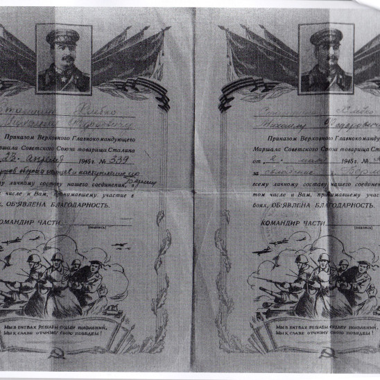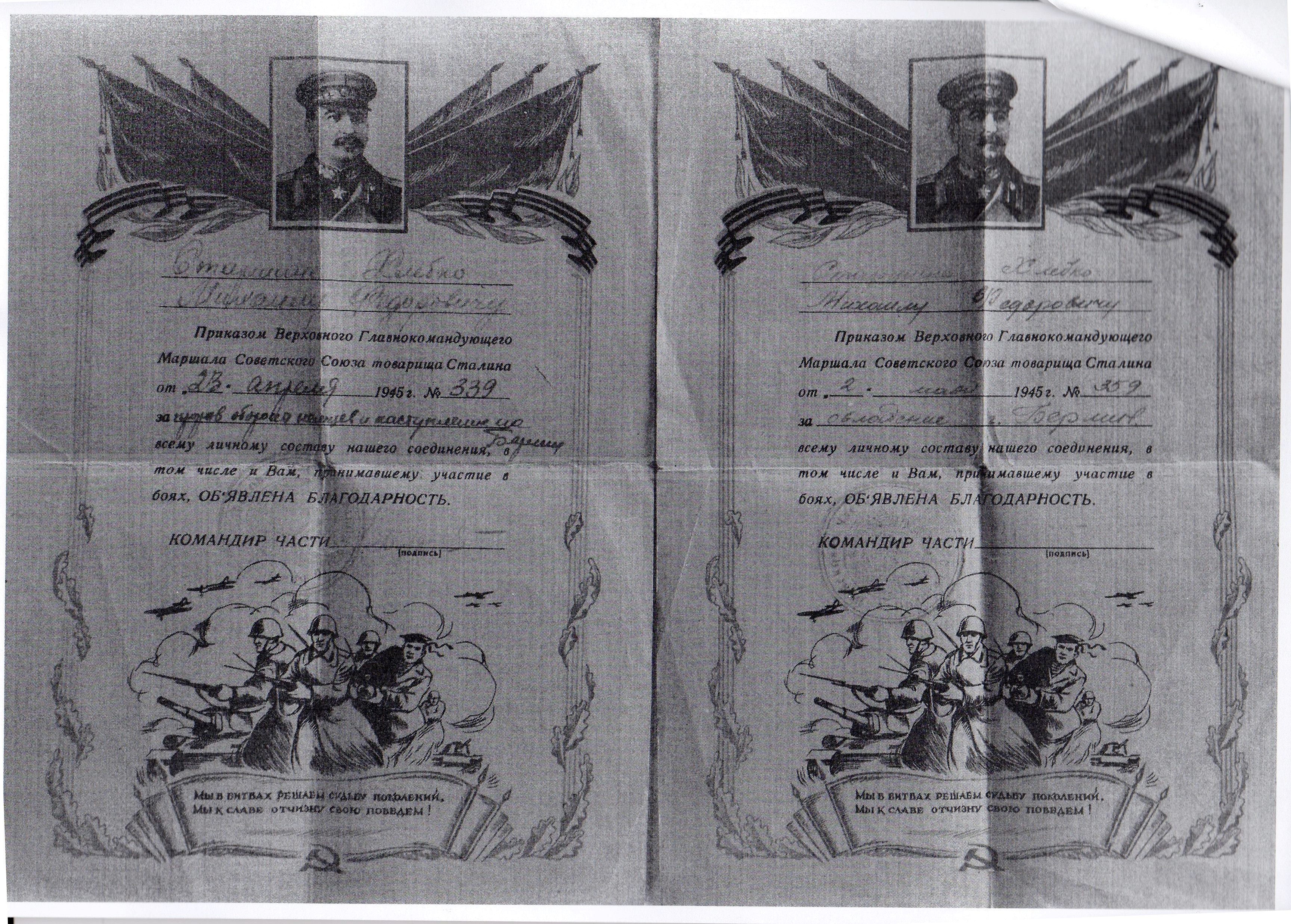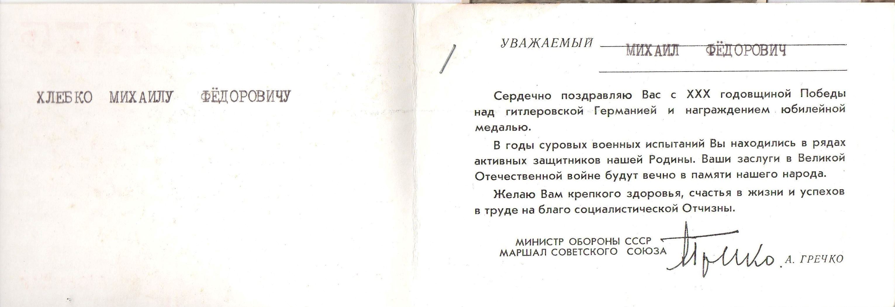 Учился в Канском авиатехническом военном училище. С января 1942 г. он воевал в составе 393 гаубичного артиллерийского полка в звании старшина батареи. Был дважды тяжело ранен. Дед в составе Советских войск дошел до Берлина и участвовал в боях за взятие Берлина, дважды награжден орденами Красной звезды, орденом Отечественной войны, Медалью за отвагу, Медалями за боевые заслуги, медалью за взятие Берлина и многими Юбилейными наградами. Приказом Верховного Главнокомандующего Советскою Союза от 23 апреля 1945 г. №339 всему личному составу и ему в т.ч. была объявлена благодарность за прорыв обороны немцев и наступление на Берлин. А 2 мая 1945 г. приказом Верховного Главнокомандующего Советского Союза приказом №359 благодарность за овладение г. Берлин. После окончания войны мой дед Хлебко Михаил Федорович продолжил службу в Германии до февраля 1947 г.