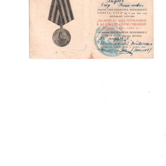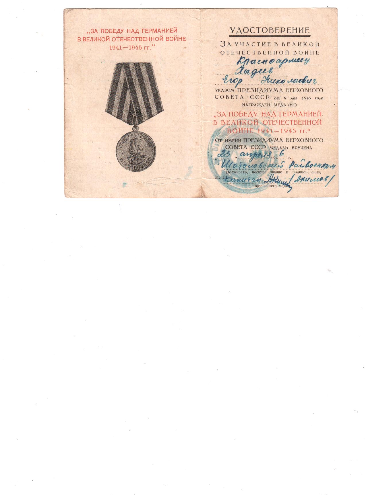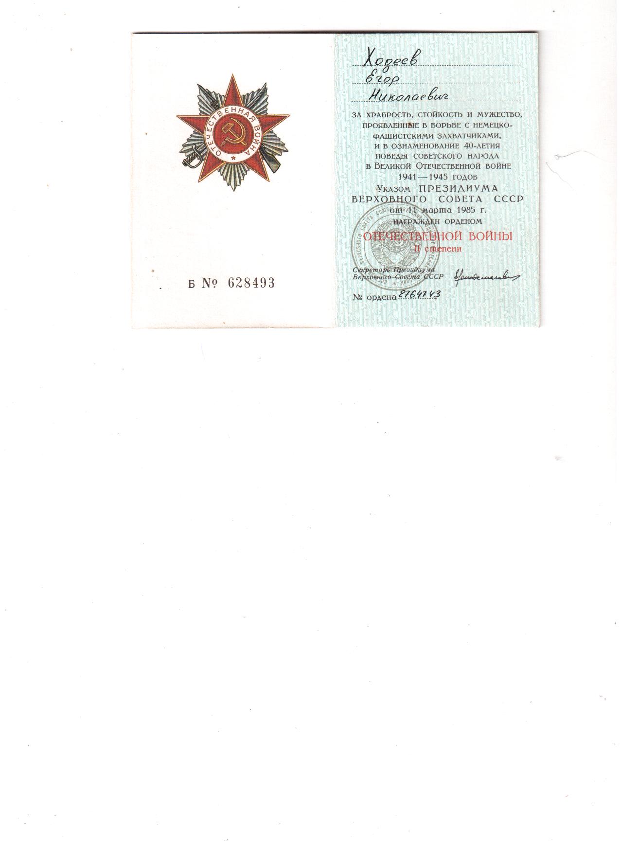 Ходеев Егор Николаевич родился 26 мая 1925 года в селе Роговатое, Шаталовского района, Воронежской области. Воевал на Курской дуге. В 1943 г. был два раза ранен в руку, в 1945 г. - в ногу. После войны был награждён медалью "За победу над Германией в Великой Отечественной войне 1941-1945 гг." и орденом Отечественной войны ll степени. Умер 23 сентября 1995 года.
