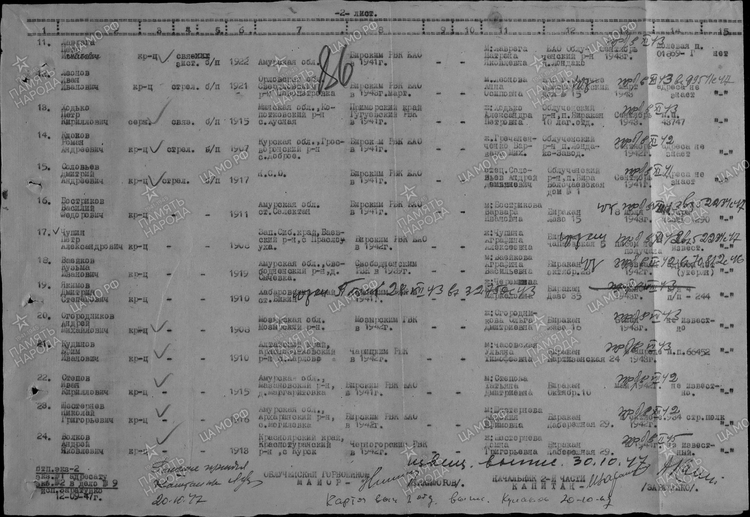 Дата и место призыва __.__.1941 Чугуевский РВК, Приморский край Последнее место службы п/п 43747 Воинское звание сержант Причина выбытия пропал без вести Дата выбытия __.11.1943