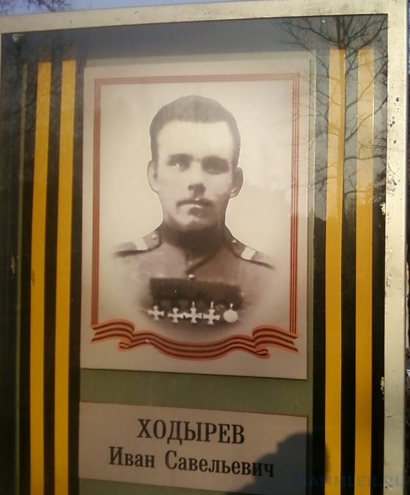 Ходырев Иван Савельевич. Родился 1891 г. На военной службе. В 1914 г. рядовой 5 Стрелкового полка. Ефрейтор команды разведчиков. Произведен в старшие унтер-офицеры. Фельдфебель 7 роты. Награжден Георгиевскими крестами: 4 ст.№847586 - За мужество и храбрость в бою 3 сентября 1915 г. (Приказ XI армейского корпуса за №382 от 8 ноября 1915 г.) 3 ст.№75939 - В бою 21марта 1915 г. у деревни Крживотуле-Стары, своевременно доносил о наступлении противника, несмотря на грозившую опасность. (Приказ XXX армейского корпуса за №254 от 23 октября 1915 г.) 2ст. 1 ст.№9928 - Во время боев с 9 по 16 октября 1915 г. у деревни Комарово находясь в среде ураганного артиллерийского обстрела, бесстрашно поддерживал телефонную связь. Когда подожжен был снарядом дом, в котором находилась телефонная станция, несмотря на то, что пламя охватило сразу всю постройку, он не растерялся и спас всё имущество, восстановив быстро работу на всех линиях. (Приказ 40 армейского корпуса за №56 от 16 декабря 1915 г.) Орден: Славы 3 ст. (1944 г.) С ноября 1918 г. по май 1920 г. в Красной Армии. С октября 1941 г. ефрейтор санитар, носильщик 412 отдельного медсанбата 330 стрелковой дивизии.