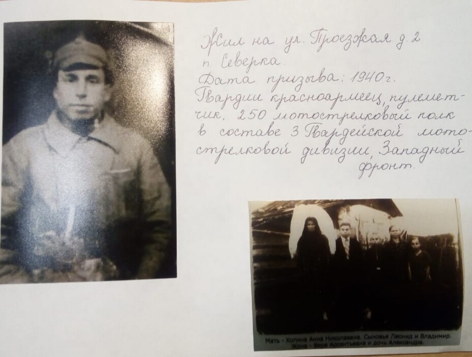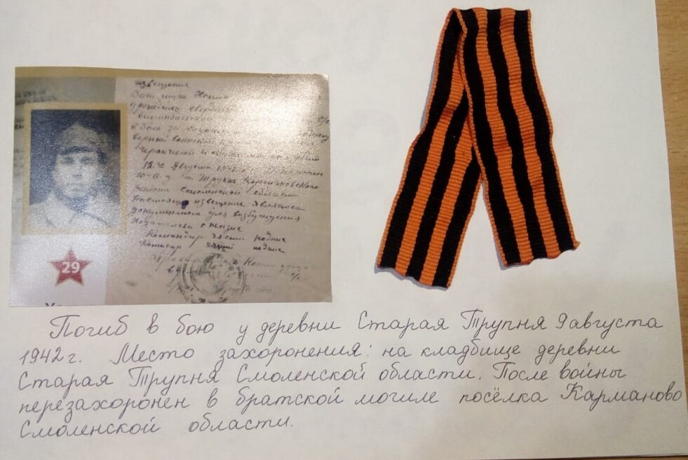 Погиб в бою у деревни Старая Прупня давгуста 1942 г. Место захоронения: на кладбище деревни Старая трупня Смоленской области. После войны ронен в братской перезахоронен в братской могиле посёлка Карманово Смоленской области Жил на ул. Проезжая д.2 - Северка Дата призыва: 1940 г. Гвардии красноармеец, пулеметчик. 250 мотострелковый полк в составе з вардейской мото-стрелковой дивизии, Западный фронт