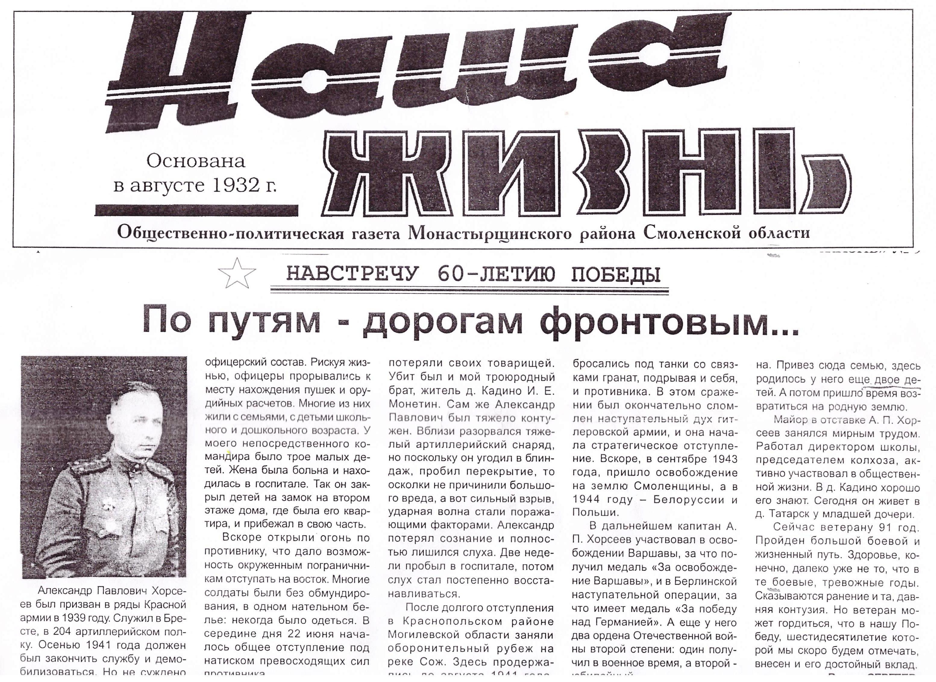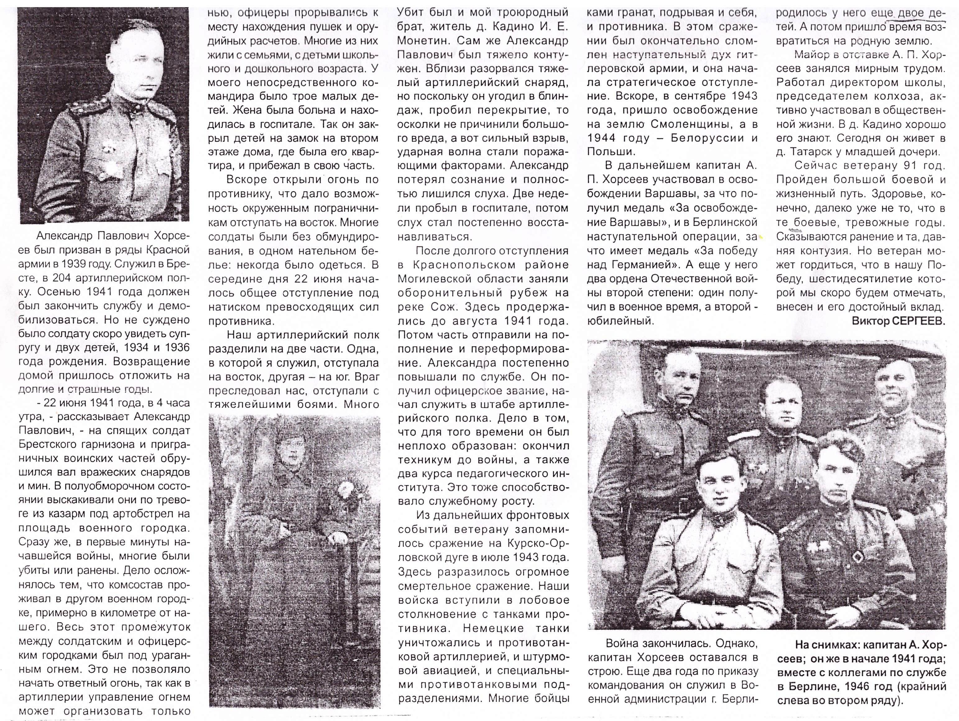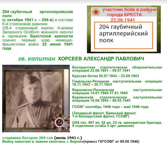 Был призван в Красную Армию в 1939 году. Служил в Бресте: 204 гаубичный артиллерийский полк 6 стрелковой дивизия - курсант полковой школы 204 гап, командир отделения 204 гап, старшина батареи. Демобилизации помешала война. Первый бой принял на рассвете 22 июня 1941 года. Участник боев в районе города Бреста (Западный фронт). 204 гап в составе 6 сд Западного и Центрального фронтов существовал по 04.09.1941, затем стал 497 артиллерийским полком 269 стрелковой дивизии Брянского фронта. Дошел до Берлина (Брянский фронт, 1-й Белорусский фронт). От рядового до офицера (войну окончил в звании гв. капитана 4 отделения штаба 5 артиллерийской дивизии прорыва). Боевые награды: орден и 3 медали (награды вручены, орденская книжка № 765379). Отслужив в Военной Администрации г. Берлина (Группа советских войск в Германии), в 1948 году вернулся на родину. Занялся мирным трудом. Вырастил с женой 4-х детей, дождался внуков и старших правнуков. Прожил 93 года. С воинскими почестями и доброй памятью родных и земляков похоронен в родной деревне на Смоленщине.