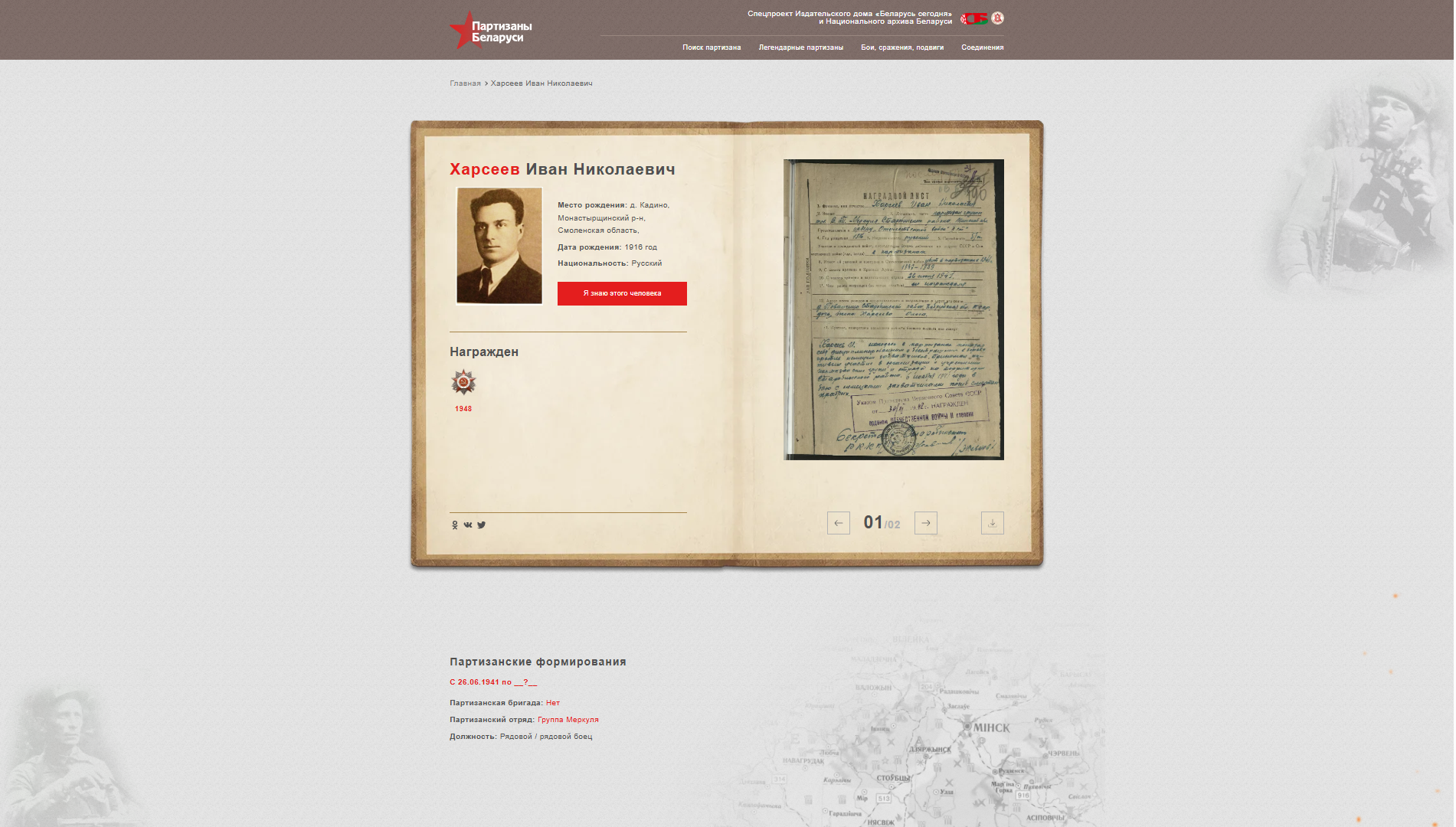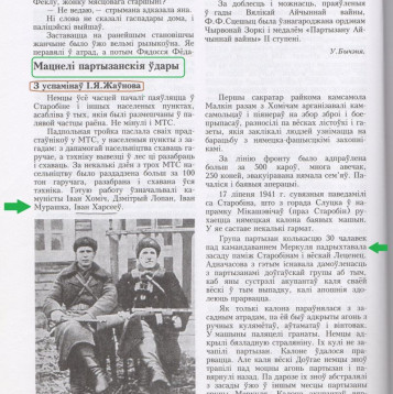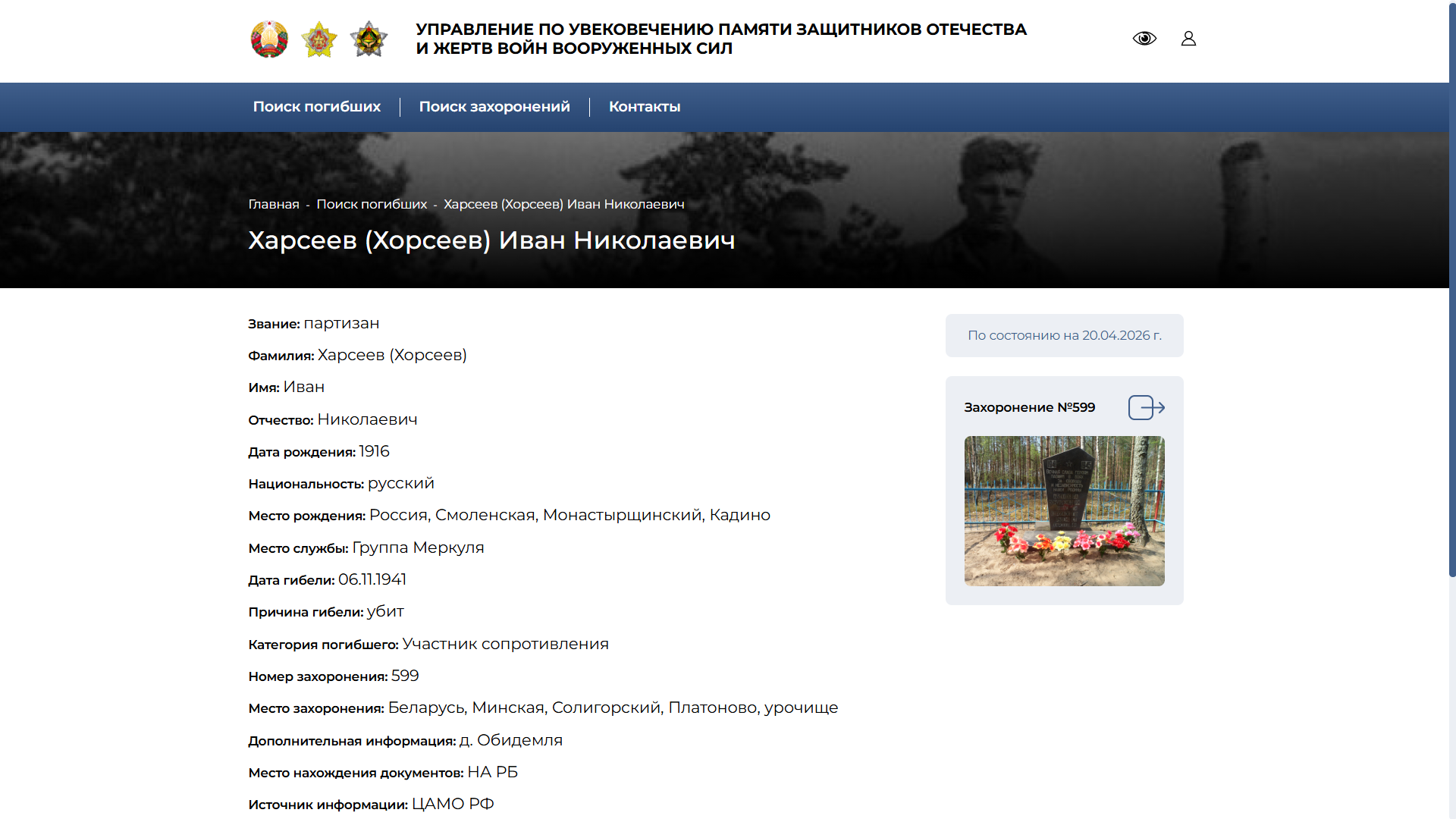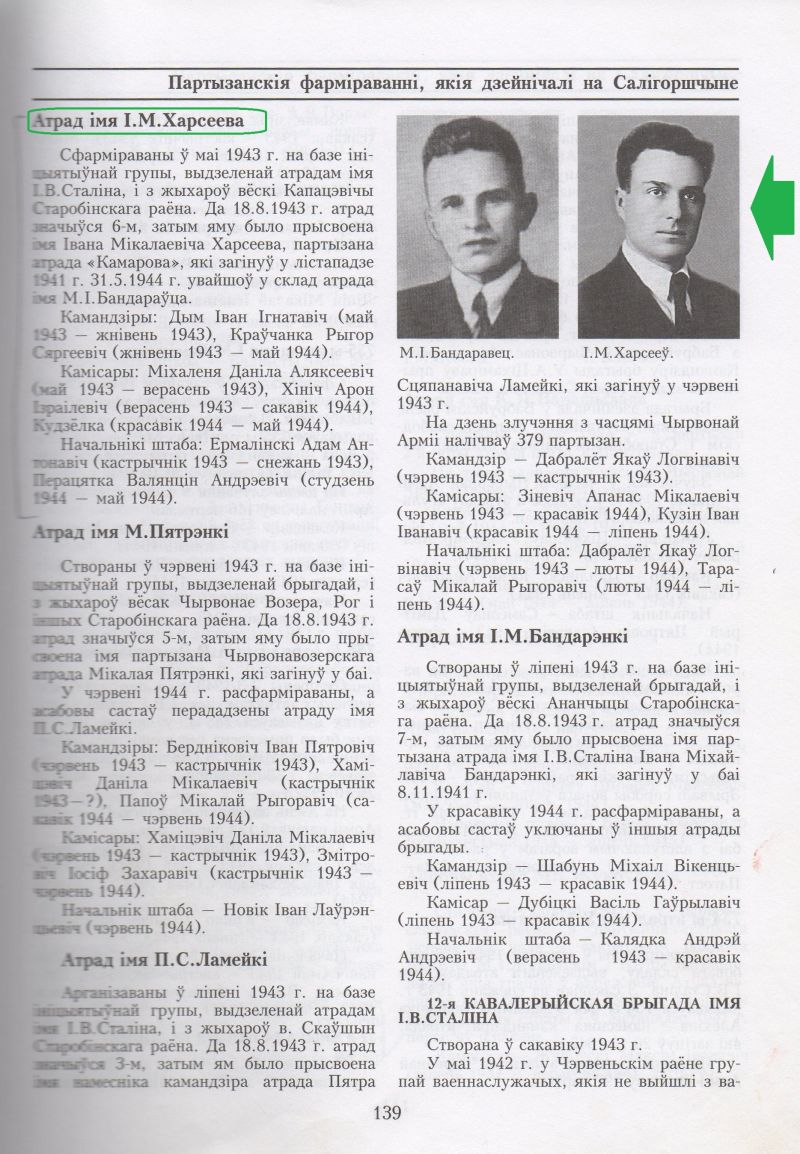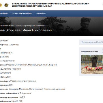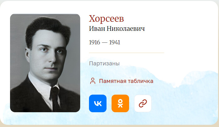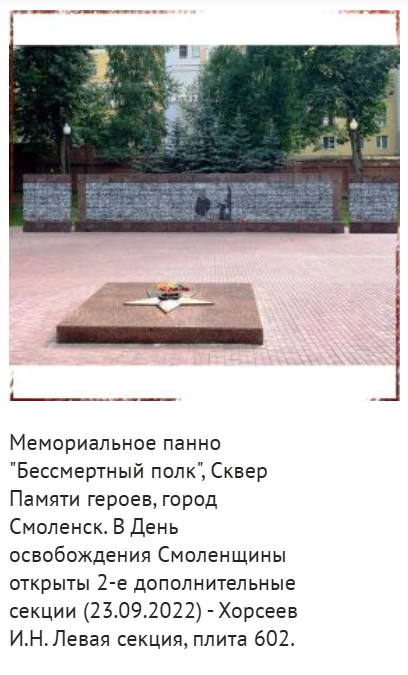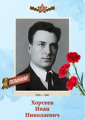 После обучения в Горецкой с/х академии, 1934-1939 гг. (и присвоения звания мл. лейтенант, летчик наблюдатель) уроженец Смоленской области (дата рождения - 30 июля 1916 г., дата крещения - 1 августа 1916 г. по старому стилю) был направлен на работу в Белоруссию. Работал ст. агрономом в Копацевичской МТС в Старобинском (Солигорском) районе Минской области. Женился на местной девушке. Дождаться рождения дочки помешала война... Комсомолец Иван Хорсеев участник организации партизанского движения на Старобинщине. С июля 1941 г. - партизан группы тов. В.Т. Меркуля (организован как Старобинский), отряда Комарова (в ноябре 1941 г. группа вошла в отряд “Комарова” 6-ой группой. При формировании бригады, в 1943 году, отряду В.Т. Меркуля присвоено имя И.В. Сталина. Партизаны участвовали в операции “Рельсовая война”, в боях против карателей провели 4 оборонительных боя. С боями заняли 29 июня 1944 г. Старобин и переправу на реке Случь. Удерживали их до подхода советских войск. Бригада соединилась с Красной армией 1 июля 1944 г., на тот момент включала отряды, в которых насчитывалось 1300 партизан). В сентябре 1941 года из Пинской области прибыл отряд «Комарова», Василия Захаровича Коржа, который встретился с партизанами Старобинского отряда, 12 ноября группа из 21 партизана( командир – В.З.Корж, заместитель − Н.И.Бондаровец, комиссар В.Т.Меркуль) провела одну из самых эффективных боевых операций 1941 г. по ликвидации полиции в деревнях Забродье, Красное Озеро, Осово. После неё отряды Старобинский, «Комарова», партизанские группы объединились. Командиром объединённого отряда «Комарова» выбрали В.З.Коржа, заместителем В.Т.Меркуля. комиссаром – Н.И.Бондаровца. Легендарный партизанский командир, создатель первого партизанского отряда в Беларуси в годы Великой Отечественной войны, генерал-майор, талантливый организатор сельского хозяйства, человек, символом которого стали винтовка и хлеб, Василий Захарович Корж навсегда остался в памяти белорусского народа. Его имя вошло во все издания и труды о героической партизанской борьбе на нашей многострадальной земле. Осенью 1941 года Василий Корж во главе отряда вместе с партизанами Полесья и Минщины прошел рейдом по районам Полесской и Минской областей. Первоначально отряд состоял из трех стрелковых соединений по 20 человек в каждом и отделения разведки (6 человек). Такое построение обеспечивало маневренность и позволяло самостоятельно решать боевые задачи каждому подразделению. Сообщая первые сведения об отряде Комарова и его действиях, Вера Хоружая, которая также была в этом отряде, писала в донесении на имя ЦК КП(б)Б 6 августа 1941 года: «Отряд тесно связан с местным населением, ведет по возможности разъяснительную работу и пользуется большой поддержкой деревенского актива. Появление партизан в деревне, в местностях, занятых немцами, вызывает большое воодушевление среди крестьян. Колхозники очень охотно снабжают партизан продуктами, информируют о происходящих событиях, о движении и действиях немцев, указывают дорогу, предупреждают о грозящей опасности». Из шестидесяти человек отряд Коржа до конца 1942 года перерос в соединение, в которое входило семь отрядов, в них насчитывалось более двух тысяч бойцов, а до 1944 года — около пятнадцати тысяч. Погиб в ноябре 1941 г. Один из отрядов 101-ой партизанской бригады им. Александра Невского с августа