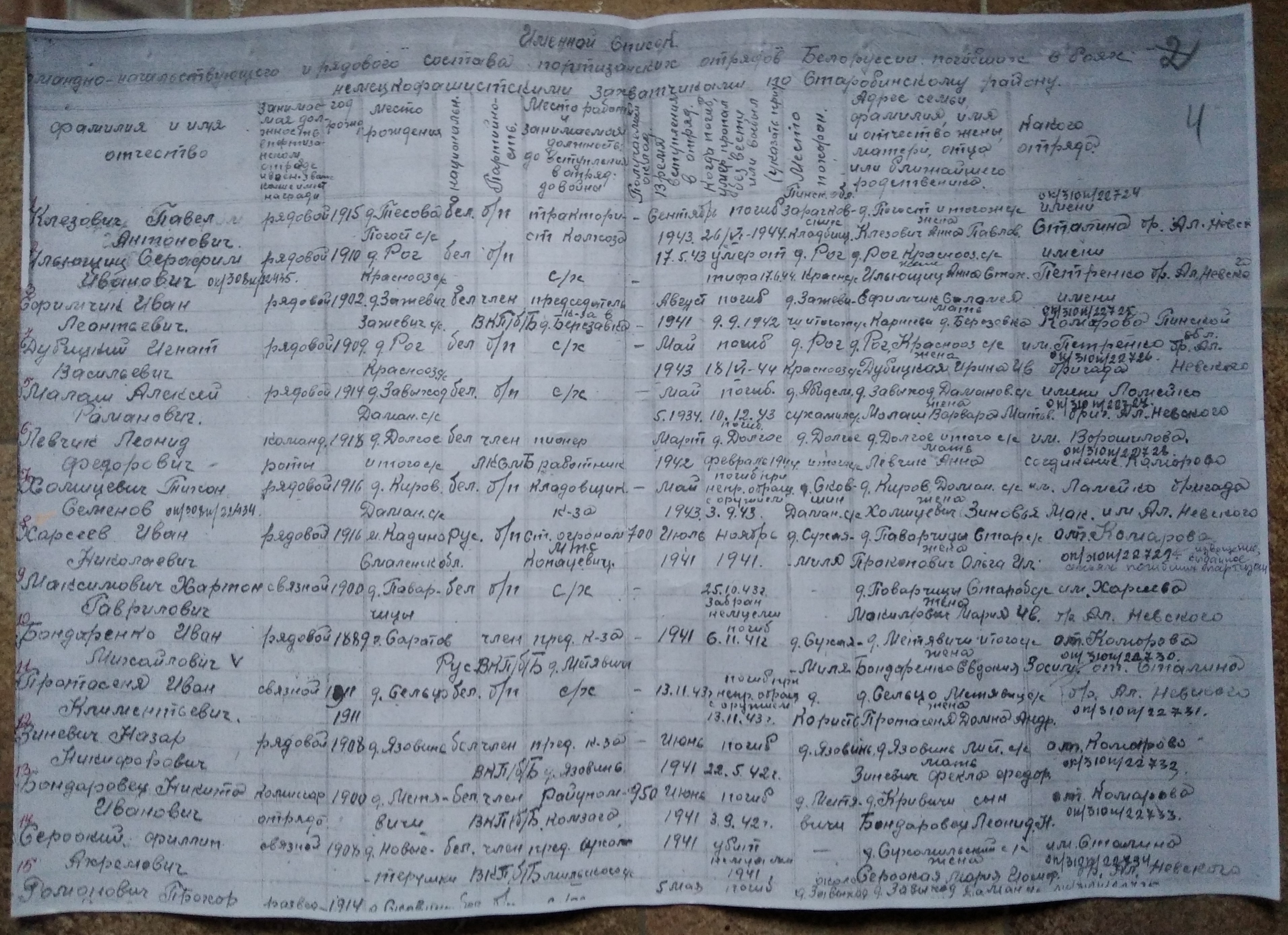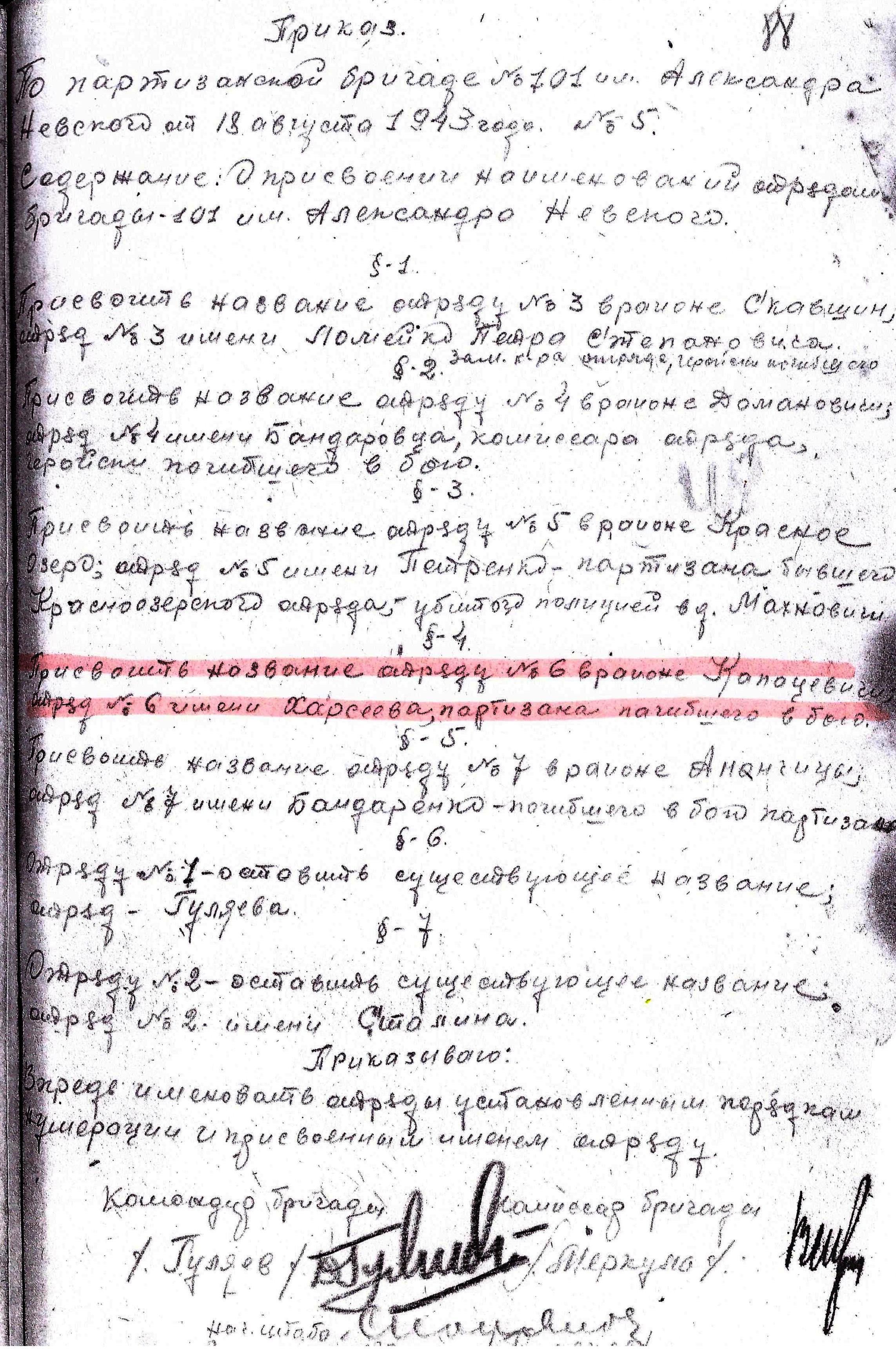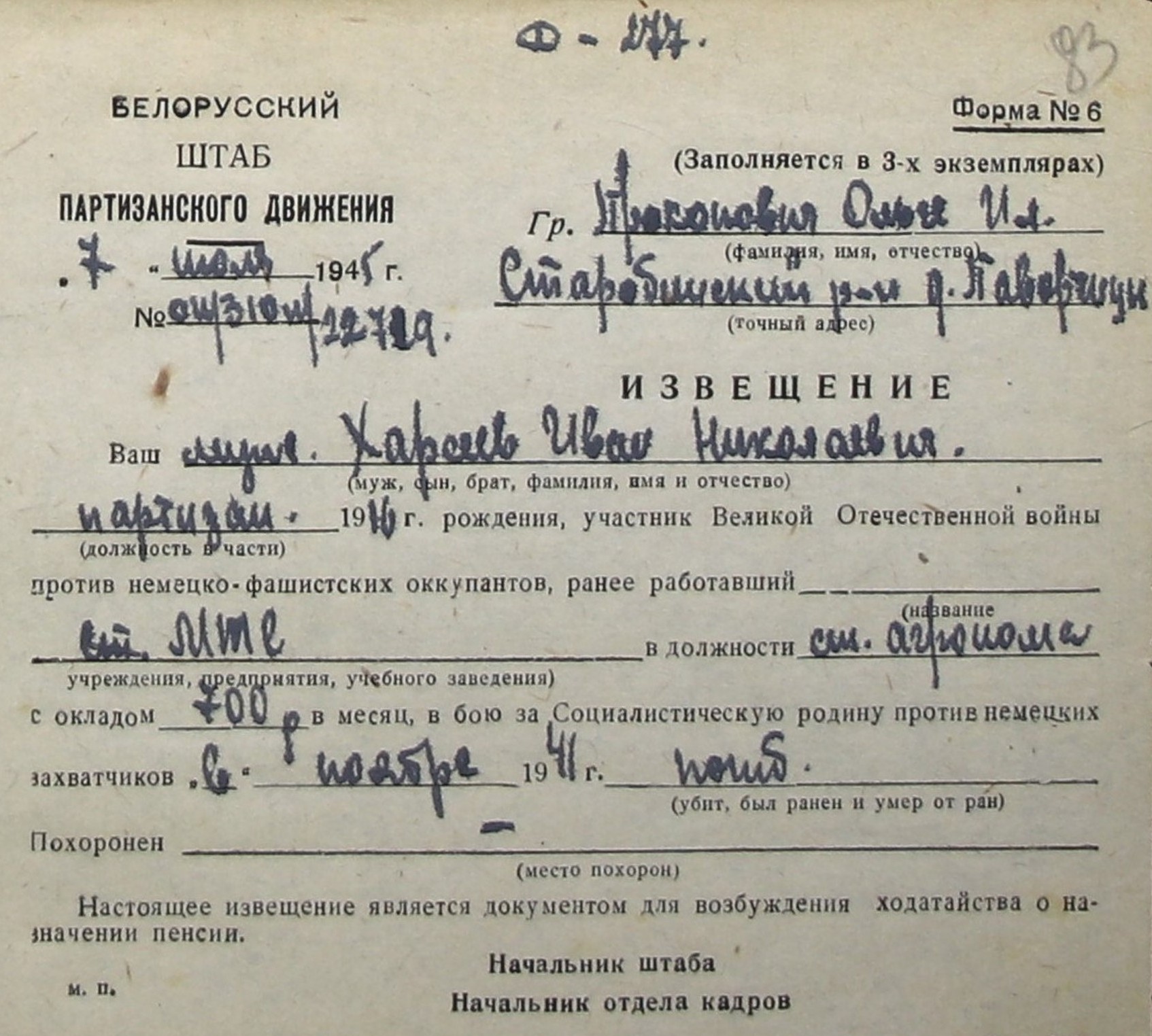 После обучения в Горецкой с/х академии, 1934-1939 гг. (и присвоения звания мл. лейтенант, летчик наблюдатель) уроженец Смоленской области (дата рождения - 30 июля 1916 г., дата крещения - 1 августа 1916 г. по старому стилю) был направлен на работу в Белоруссию. Работал ст. агрономом в Копацевичской МТС в Старобинском (Солигорском) районе Минской области. Женился на местной девушке. Дождаться рождения дочки помешала война... Комсомолец Иван Хорсеев участник организации партизанского движения на Старобинщине. С июля 1941 г. - партизан группы тов. В.Т. Меркуля (организован как Старобинский), отряда Комарова (в ноябре 1941 г. группа вошла в отряд “Комарова” 6-ой группой. При формировании бригады, в 1943 году, отряду В.Т. Меркуля присвоено имя И.В. Сталина. Партизаны участвовали в операции “Рельсовая война”, в боях против карателей провели 4 оборонительных боя. С боями заняли 29 июня 1944 г. Старобин и переправу на реке Случь. Удерживали их до подхода советских войск. Бригада соединилась с Красной армией 1 июля 1944 г., на тот момент включала отряды, в которых насчитывалось 1300 партизан). В сентябре 1941 года из Пинской области прибыл отряд «Комарова», Василия Захаровича Коржа, который встретился с партизанами Старобинского отряда, 12 ноября группа из 21 партизана( командир – В.З.Корж, заместитель − Н.И.Бондаровец, комиссар В.Т.Меркуль) провела одну из самых эффективных боевых операций 1941 г. по ликвидации полиции в деревнях Забродье, Красное Озеро, Осово. После неё отряды Старобинский, «Комарова», партизанские группы объединились. Командиром объединённого отряда «Комарова» выбрали В.З.Коржа, заместителем В.Т.Меркуля. комиссаром – Н.И.Бондаровца. Легендарный партизанский командир, создатель первого партизанского отряда в Беларуси в годы Великой Отечественной войны, генерал-майор, талантливый организатор сельского хозяйства, человек, символом которого стали винтовка и хлеб, Василий Захарович Корж навсегда остался в памяти белорусского народа. Его имя вошло во все издания и труды о героической партизанской борьбе на нашей многострадальной земле. Осенью 1941 года Василий Корж во главе отряда вместе с партизанами Полесья и Минщины прошел рейдом по районам Полесской и Минской областей. Первоначально отряд состоял из трех стрелковых соединений по 20 человек в каждом и отделения разведки (6 человек). Такое построение обеспечивало маневренность и позволяло самостоятельно решать боевые задачи каждому подразделению. Сообщая первые сведения об отряде Комарова и его действиях, Вера Хоружая, которая также была в этом отряде, писала в донесении на имя ЦК КП(б)Б 6 августа 1941 года: «Отряд тесно связан с местным населением, ведет по возможности разъяснительную работу и пользуется большой поддержкой деревенского актива. Появление партизан в деревне, в местностях, занятых немцами, вызывает большое воодушевление среди крестьян. Колхозники очень охотно снабжают партизан продуктами, информируют о происходящих событиях, о движении и действиях немцев, указывают дорогу, предупреждают о грозящей опасности». Из шестидесяти человек отряд Коржа до конца 1942 года перерос в соединение, в которое входило семь отрядов, в них насчитывалось более двух тысяч бойцов, а до 1944 года — около пятнадцати тысяч. Погиб в ноябре 1941 г. Один из отрядов 101-ой партизанской бригады им. Александра Невского с августа
