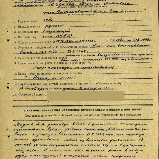 Участвуя в боях в должности командира минометного взвода 312 стрелковой дивизии под городом Сокольники в августе 1942 года, был тяжело ранен в левую руку с последующей ампутацией. В дальнейшем работал управляющим Юргинского отделения банка.