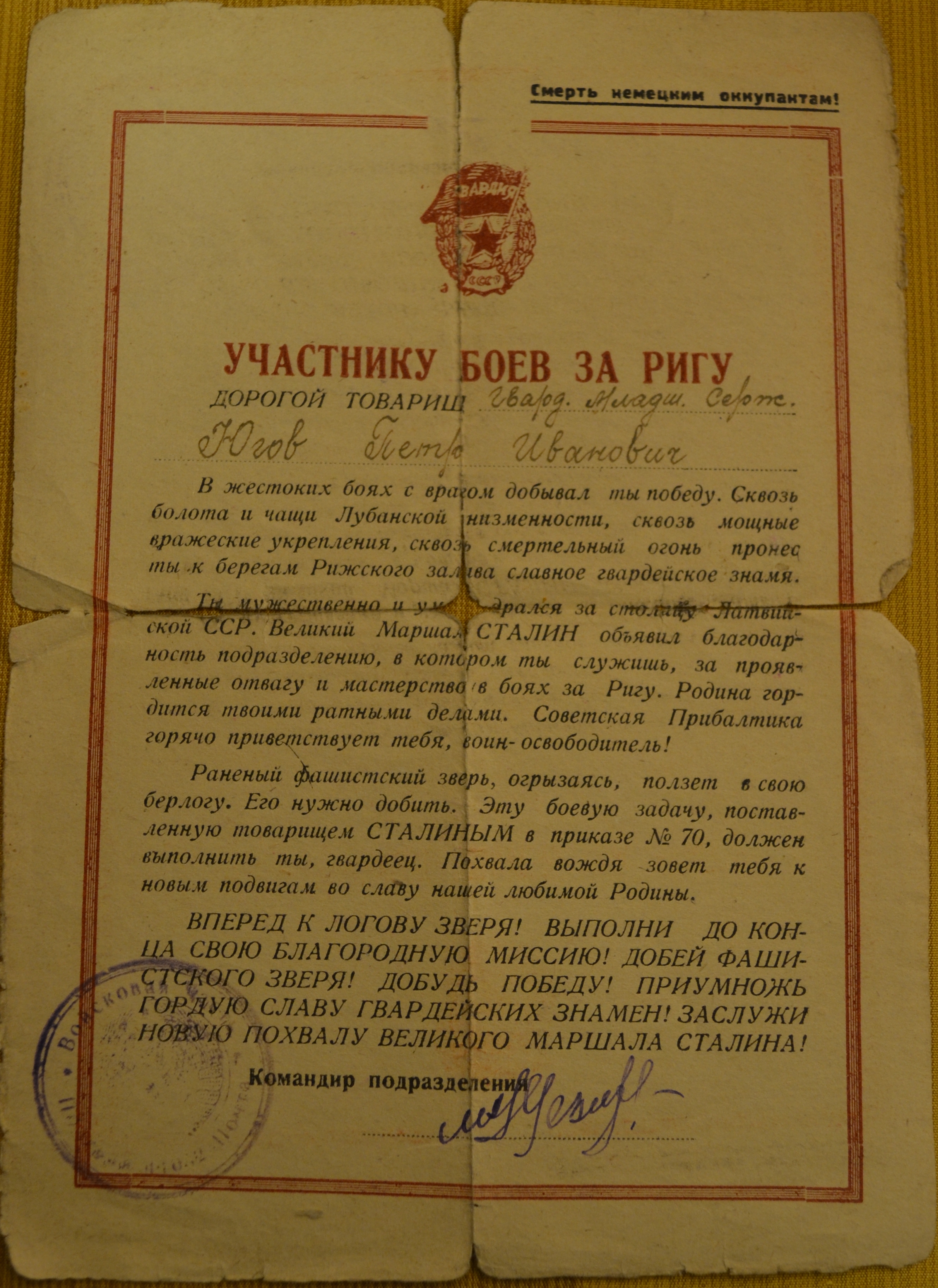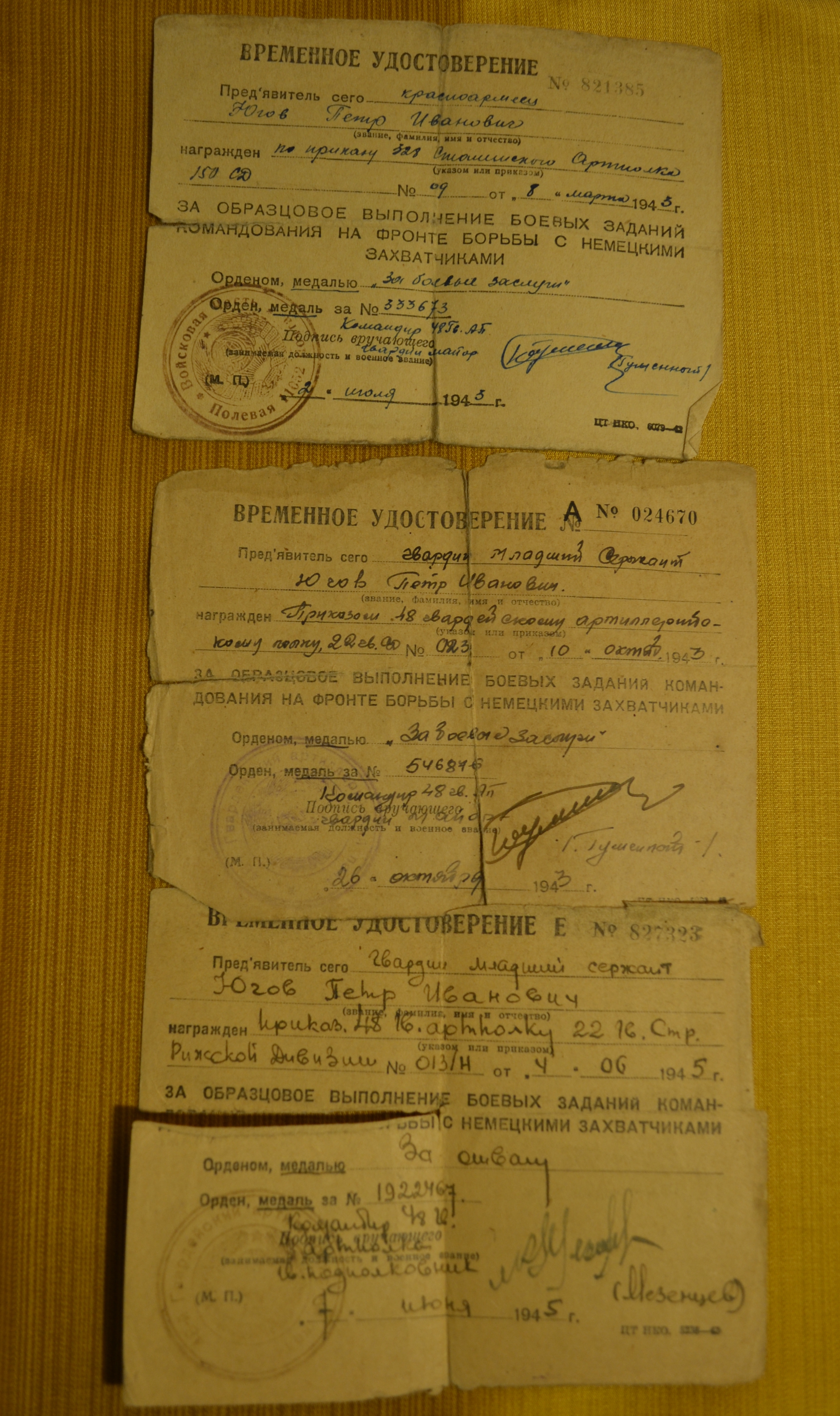 Югов Петр Иванович в 1941 г уже 3 года проучился в Томском политехническом институте на горном факультете и на фронт их не брали - стране нужны были инженеры. В 1942 г. организовывалась Сибирская добровольческая дивизия им. Сталина и пятерым комсомольцам удалось попасть на фронт. Воевал до осени 1945г, вернулся в институт и в 1946 г, защитился и приступил к работе. Строил и разрабатывал урановые месторождения в Киргизии, Казахстане. Стал одним из основателей Приаргунского горно-химического комбината в Читинской области. За что был награжден двумя орденами "Трудового Красного Знамени", орденом "Знак Почета" и знаками "Шахтерская Слава" трех степеней.