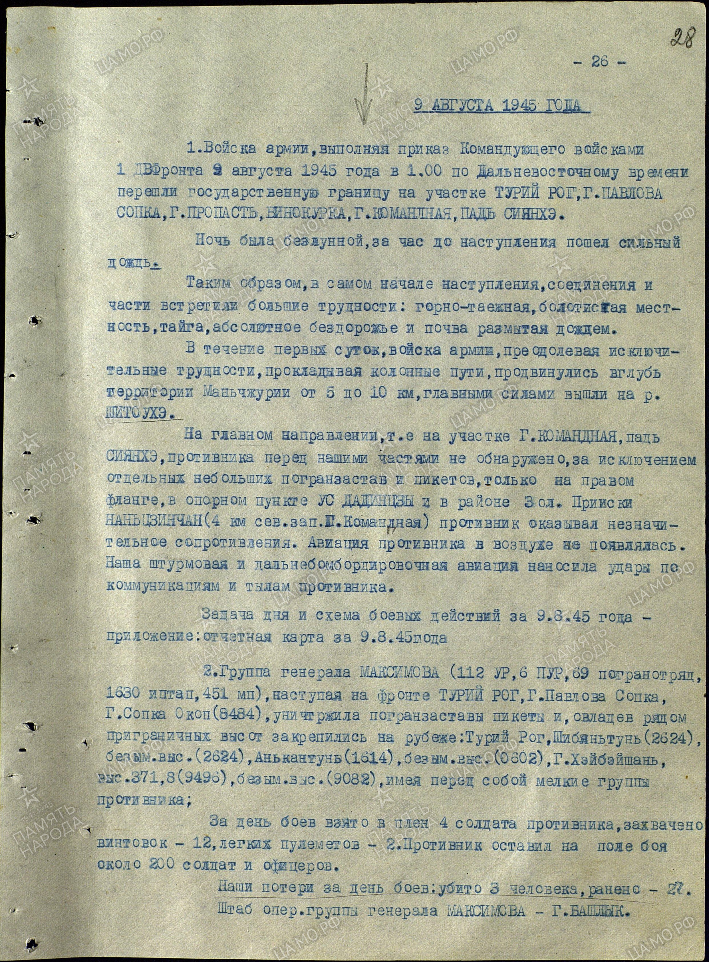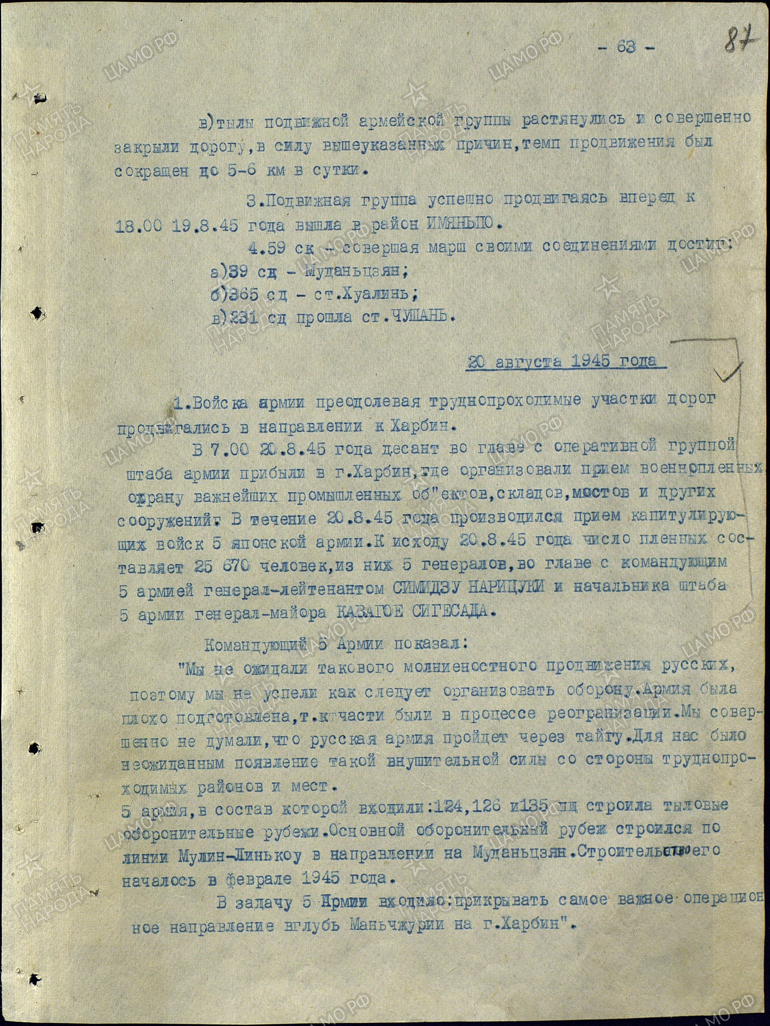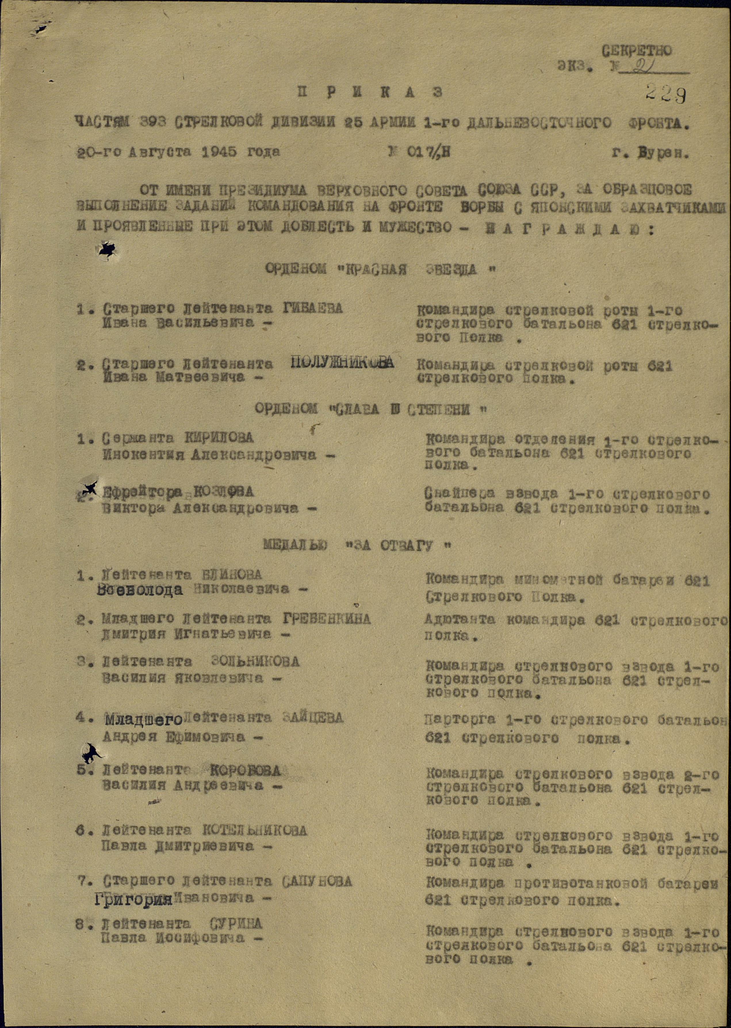 августе 1945 года, участвовал в Харбинско-Гиринской операции в составе 1 ДВФ.