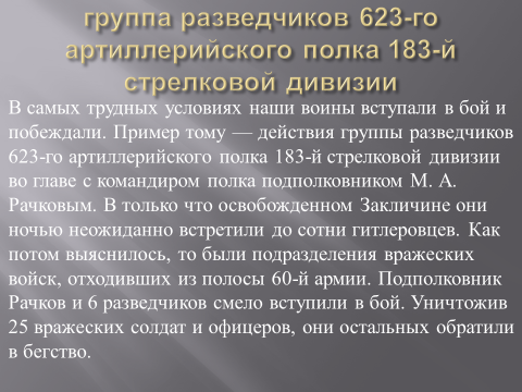 12-13 февраля 1945 года командир орудия 3-й батареи 623-го артиллерийского полка (183-я стрелковая дивизия, 38-я армия, 4-й Украинский фронт) сержант 3арипов З.З., в боях близ польского города Струмень при отражении контратаки танков и пехоты противника вывел из строя вражеское орудие. Командуя расчётом, в течение трёх дней он сдерживал натиск врага, уничтожив более двадцати фашистских солдат и офицеров.