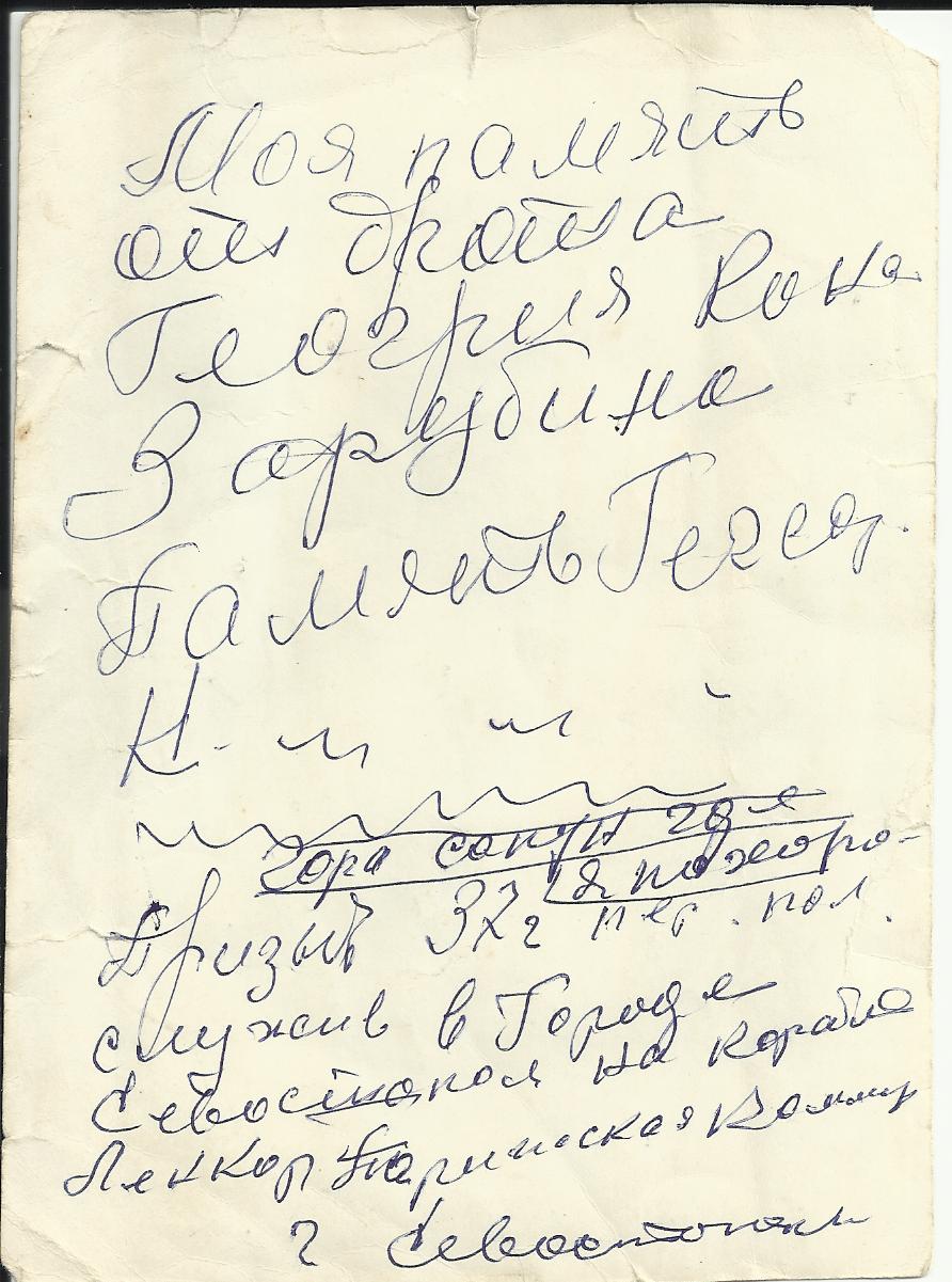 Георгий Константинович родной брат моего дедушки Зарубина Николая Константиновича и родной дядя моей мамы! Воевал ЧФ, БО-4, младший сержант. Участвовал в обороне Севастополя. Пропал без вести в 1942 году.
