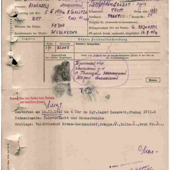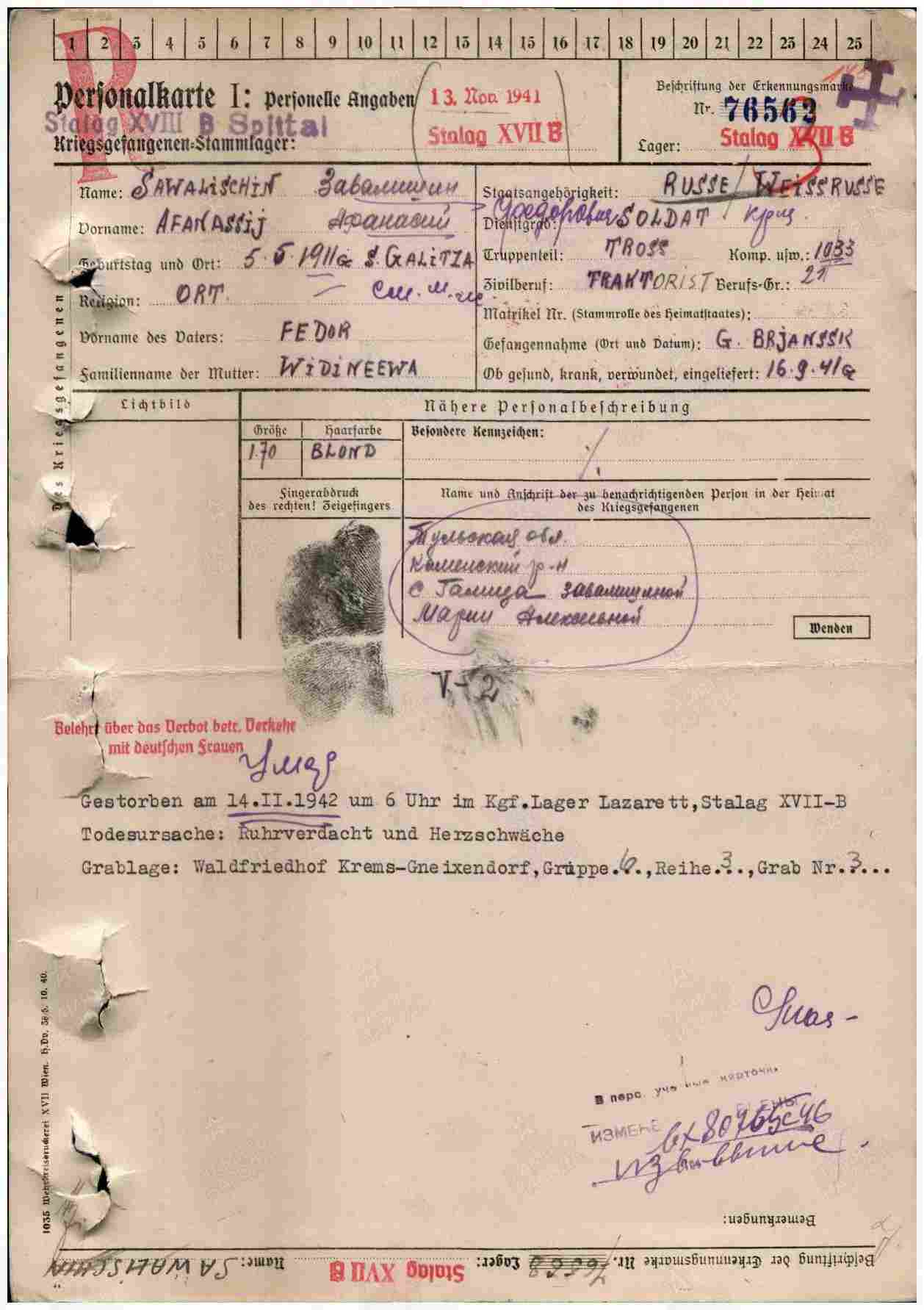 Был призван Ефремовским военкоматом, попал в плен по ранению в городе Брянск, был в концлагере шталаг XVII B, пленен 16.09.1941. Лагерный номер 76562 Погиб 14.11.1942 в концлагере шталаг XVII B , Место захоронения Кремс-Гнайксендорф (лесное кладбище) Могила - группа 6, ряд 3, могила 3