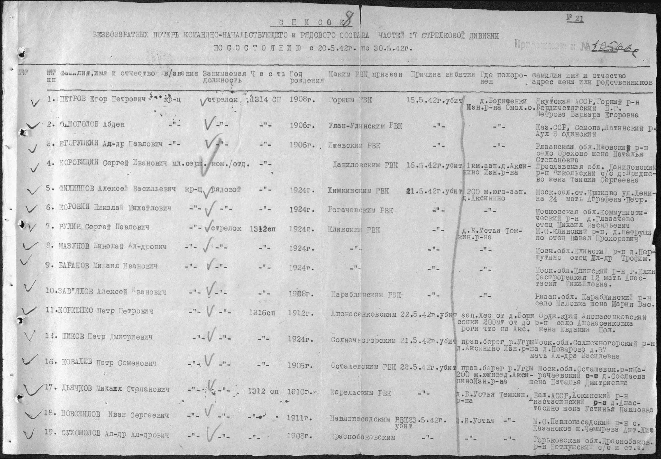 Завьялов Алексей Иванович родился в 1908 году в Кораблинском районе Рязанской области. На фронт призван Кораблинским РВК в 1941 году. Воевал в 1321 сп 17 сд рядовой / стрелок. Погиб 21.05 1942 года. Место захоронения Смоленская область, Темкинский район, д. Б. Устья. Место перезахоронения Калужская область, Юхновский район.