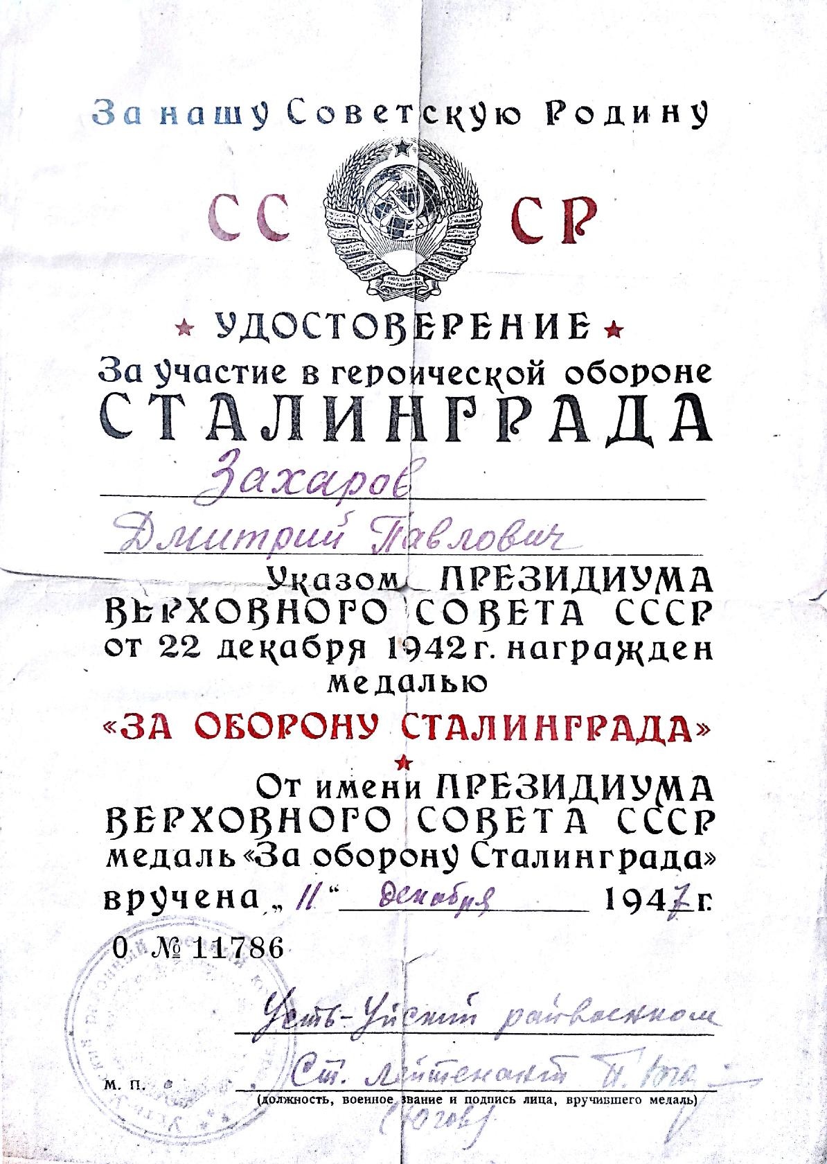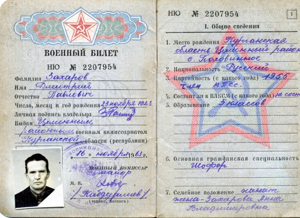 Захаров Дмитрий Павлович в семье был самым младшим. Родился он 23 октября 1923 года. В 1941 году ему было 17 лет. Его взяли в армию, только после того как он написал заявление, о том, что он хочет идти на фронт добровольцем. 10 октября 1941 года он был призван в армию, а 20 ноября 1941 года принял присягу в 9 Воздушно-десантном корпусе, где воевал по август 1942 года.