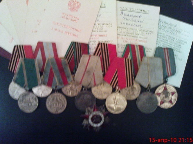 В июле был отправлен на Прибалтийский фронт в 260 танковый полк. И далее прадедушка был механиком – водителем танка Т-34. «Сменил миномет на танк не глядя. Да тяжеловат танк оказывается, 40 километров не доехал до Риги» - посмеивался прадедушка. На подступах к городу Риге был он ранен во второй раз. После лечения в госпитале вернулся в свой танковый полк. «Победу отмечали в Польше! Ждали её каждый день. Но когда сказали – Победа – не ожидали. Замолчали. И только потом закричали от радости...» - рассказывал прадедушка. «А домой возвращались уже в марте 1946 года. Демобилизовались из Польши. И возвращались через Белоруссию. Награбленное фашистами возвращали. Лошадей везли, коров…»Большую часть Великой Отечественной войны мой прадедушка прошел в звании старшего сержанта. К сожалению, моя мама и мой дедушка не помнят его рассказа о том, когда и где он получил это звание.Для нашей семьи мой прадедушка Захаров Дмитрий Павлович – герой. При рождении мне дали именно его имя. И я с гордостью ношу его имя. До моего рождения он не дожил две недели. (Писал правнук со слов дедушки /сына Дмитрия Павловича/Ситников Дмитрий )