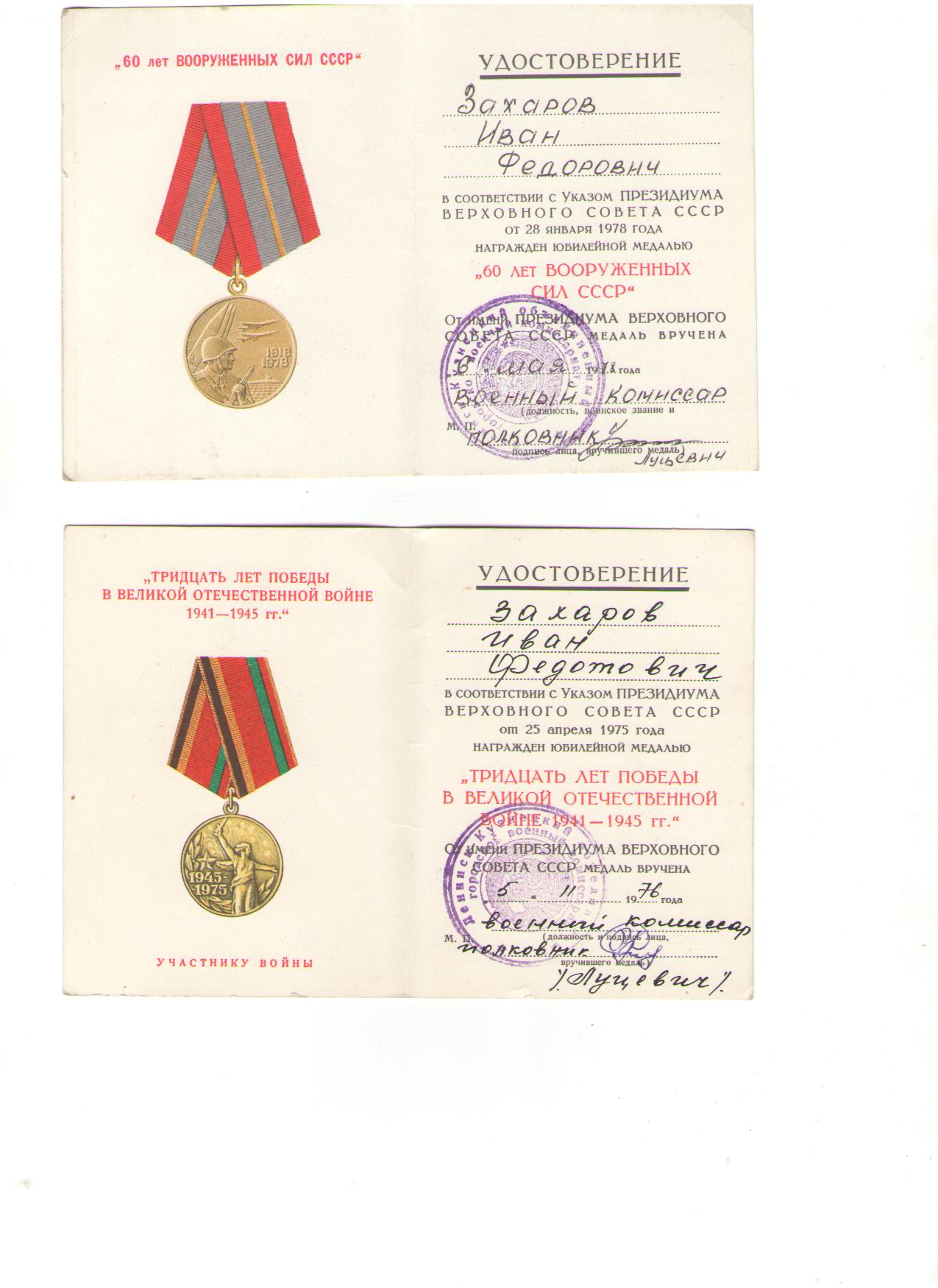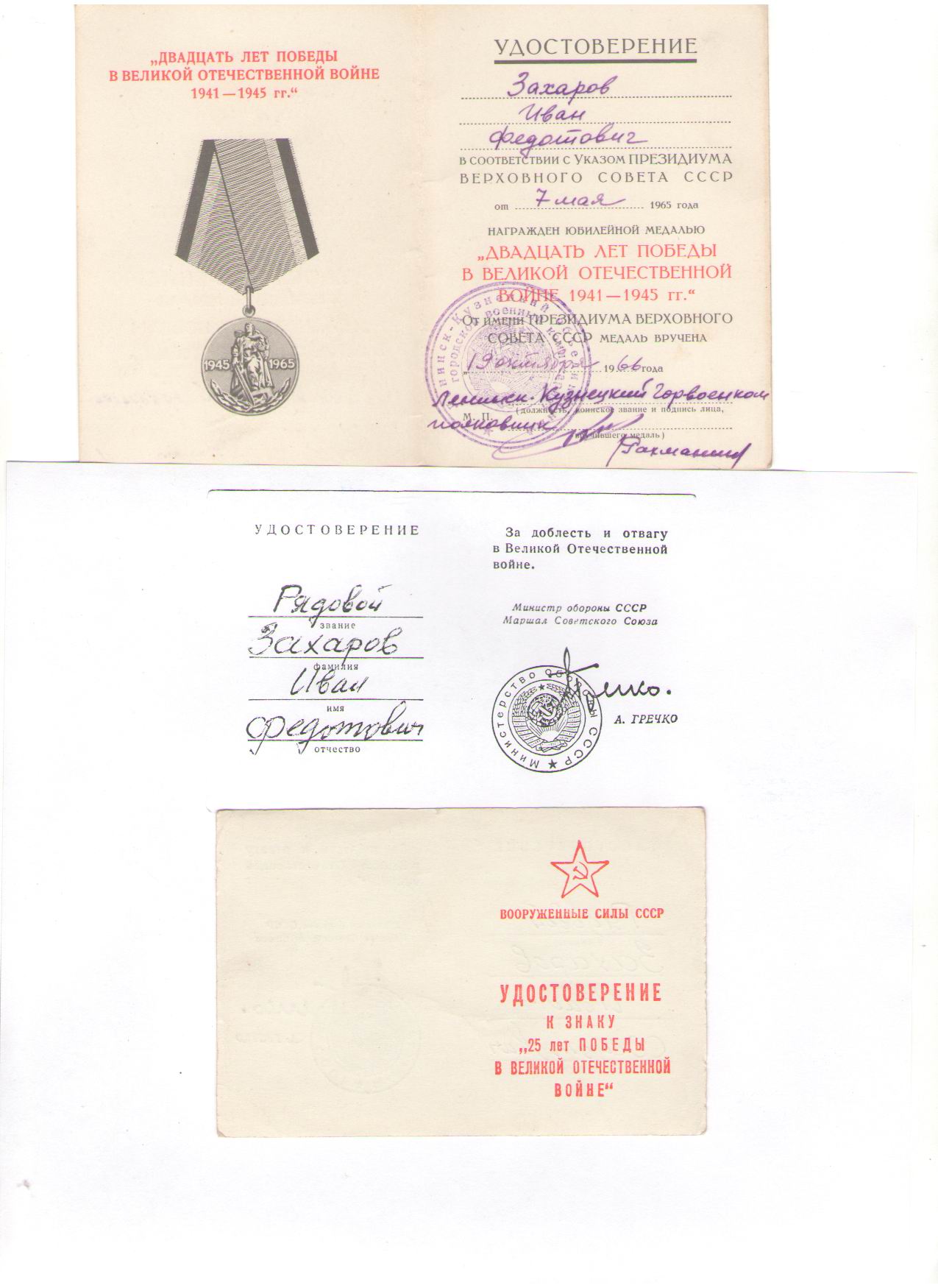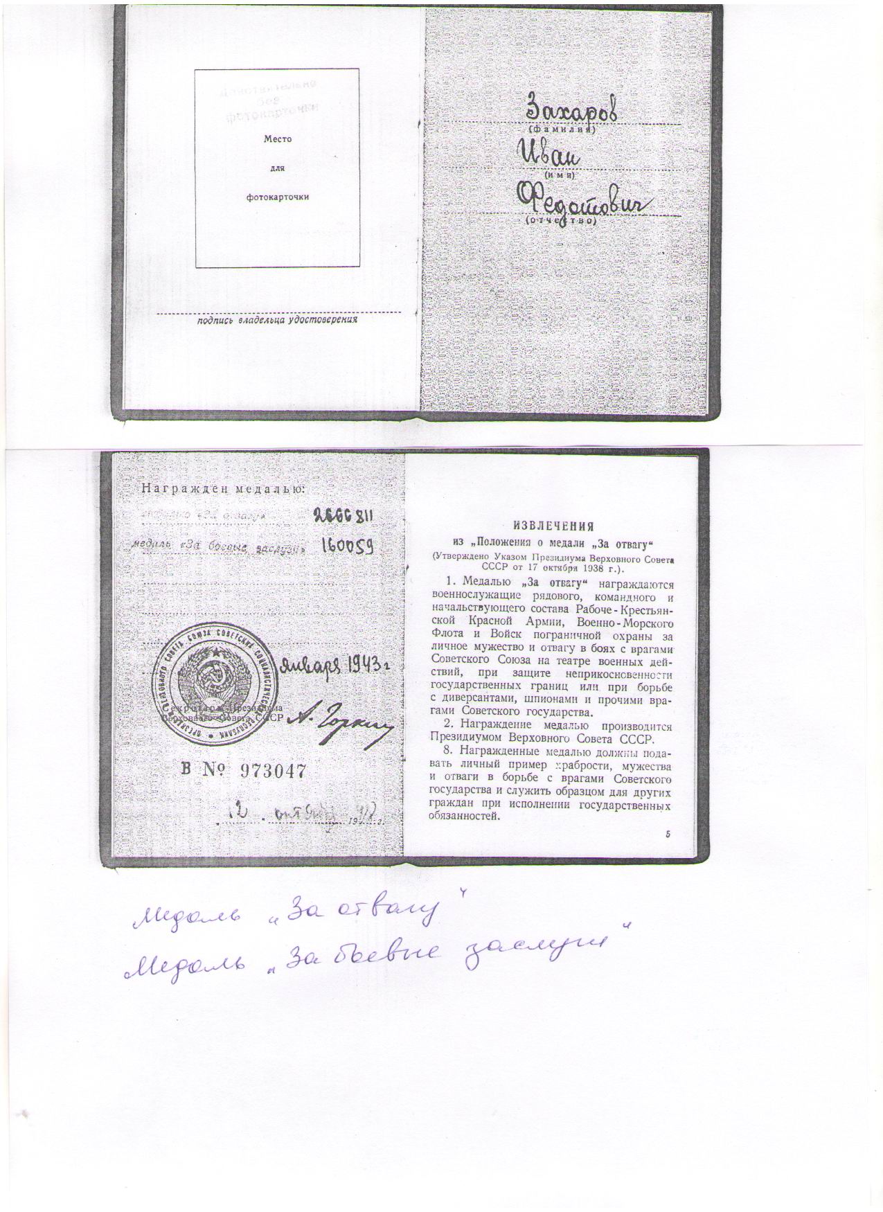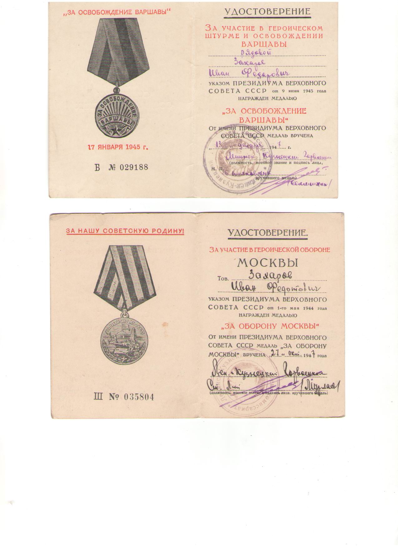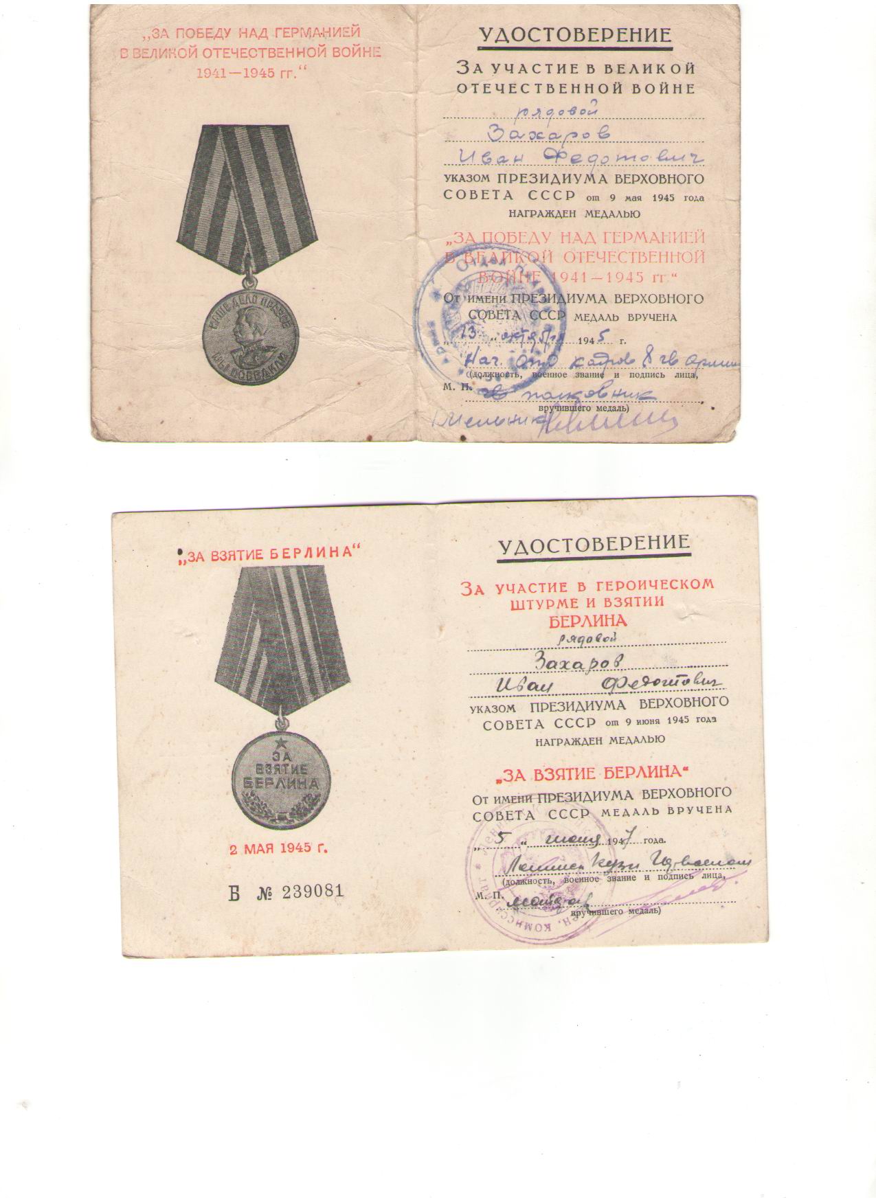 За мужество и героизм при выполнении боевых задач Захаров Иван Федотович был награжден Правительственными наградами: медалью "За отвагу", медалью "За боевые заслуги", медалью "За оборону Москвы", медалью "За освобождение Варшавы", медалью "За взятие Берлина".