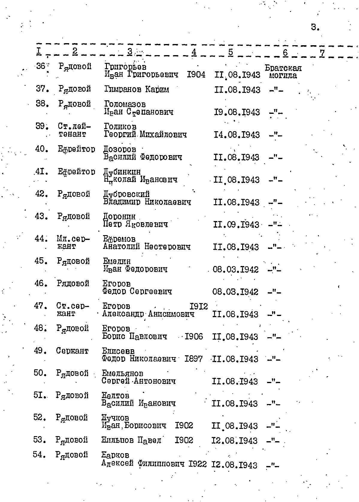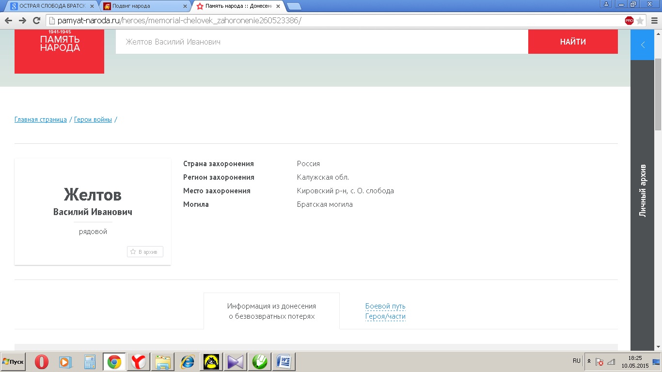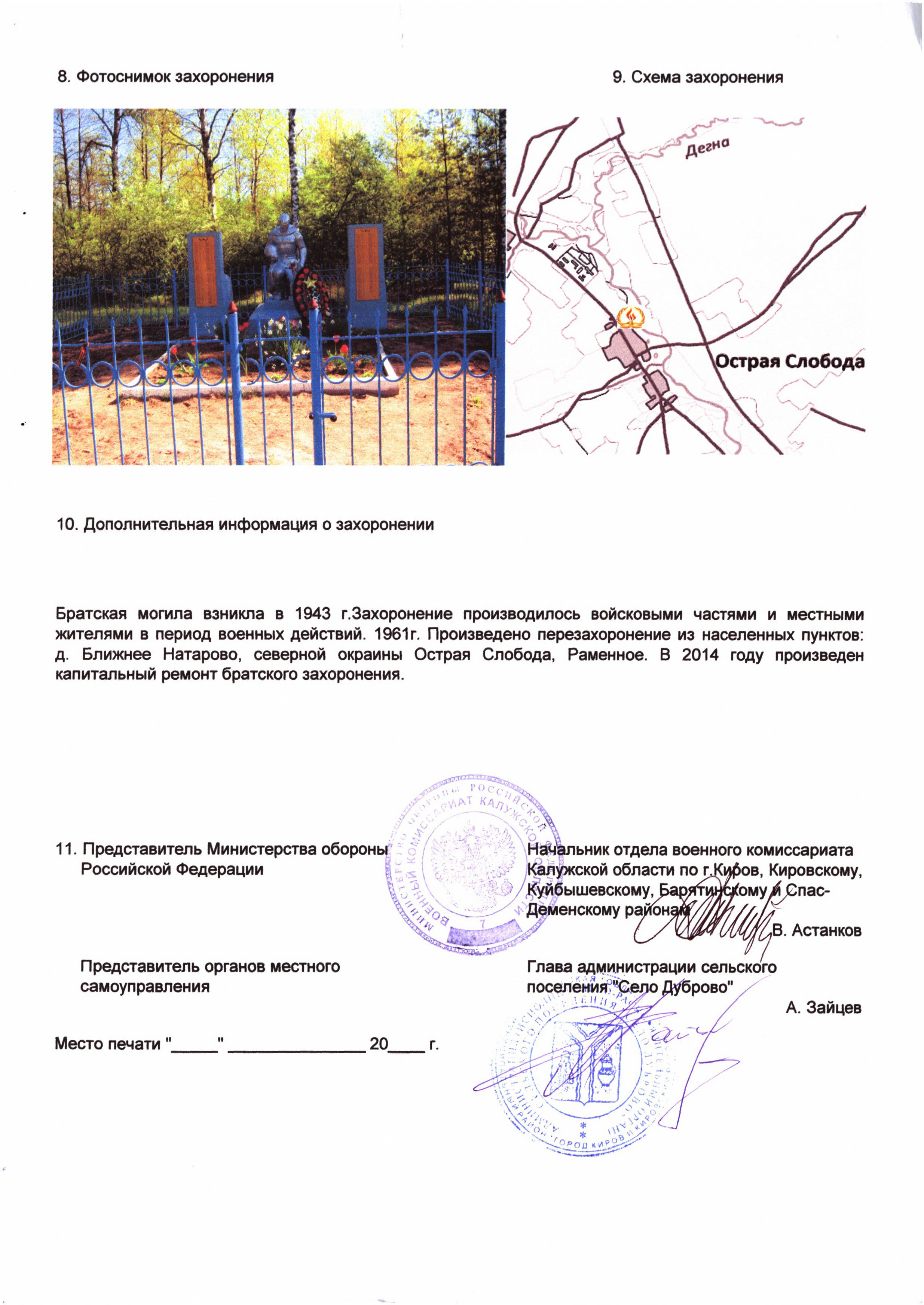 Мой прадедушка погиб в жесточайшем бою 11 августа 1943 году в Смоленской области. Первичное место захоронения деревня Ближнее Натарово, затем на окраине деревни Острая Слобода возникла братская могила размером 40 кв.м. Там были похоронены советские воины, погибшие в оборонительных и наступательных боях 1942 – 1943 гг. В 1961 г. на братской могиле был установлен памятник. На постаменте – полутораметровая гипсовая скульптура коленопреклонённого воина с обнаженной и скорбно склонённой головой, с плащ-накидкой за спиной, в правой руке держащего каску, в левой – опущенное знамя. Всего в Братской могиле в деревне Острая Слобода покоится прах 447 воинов. Из них известны фамилии 368 воинов и 79 воинов, имена которых неизвестны.