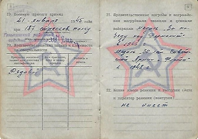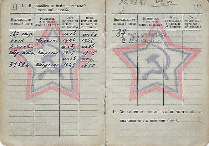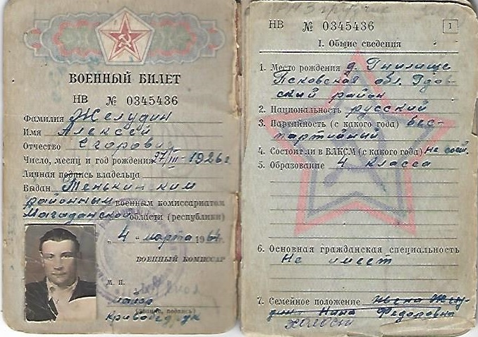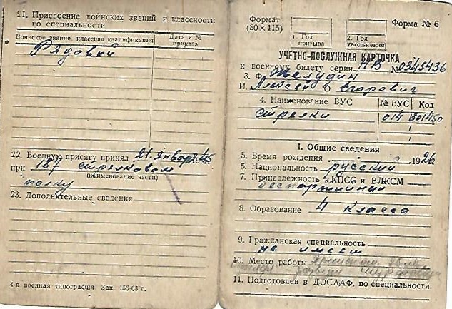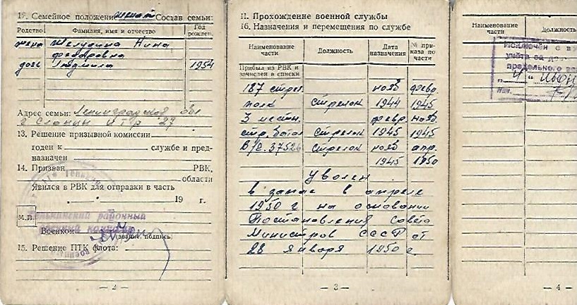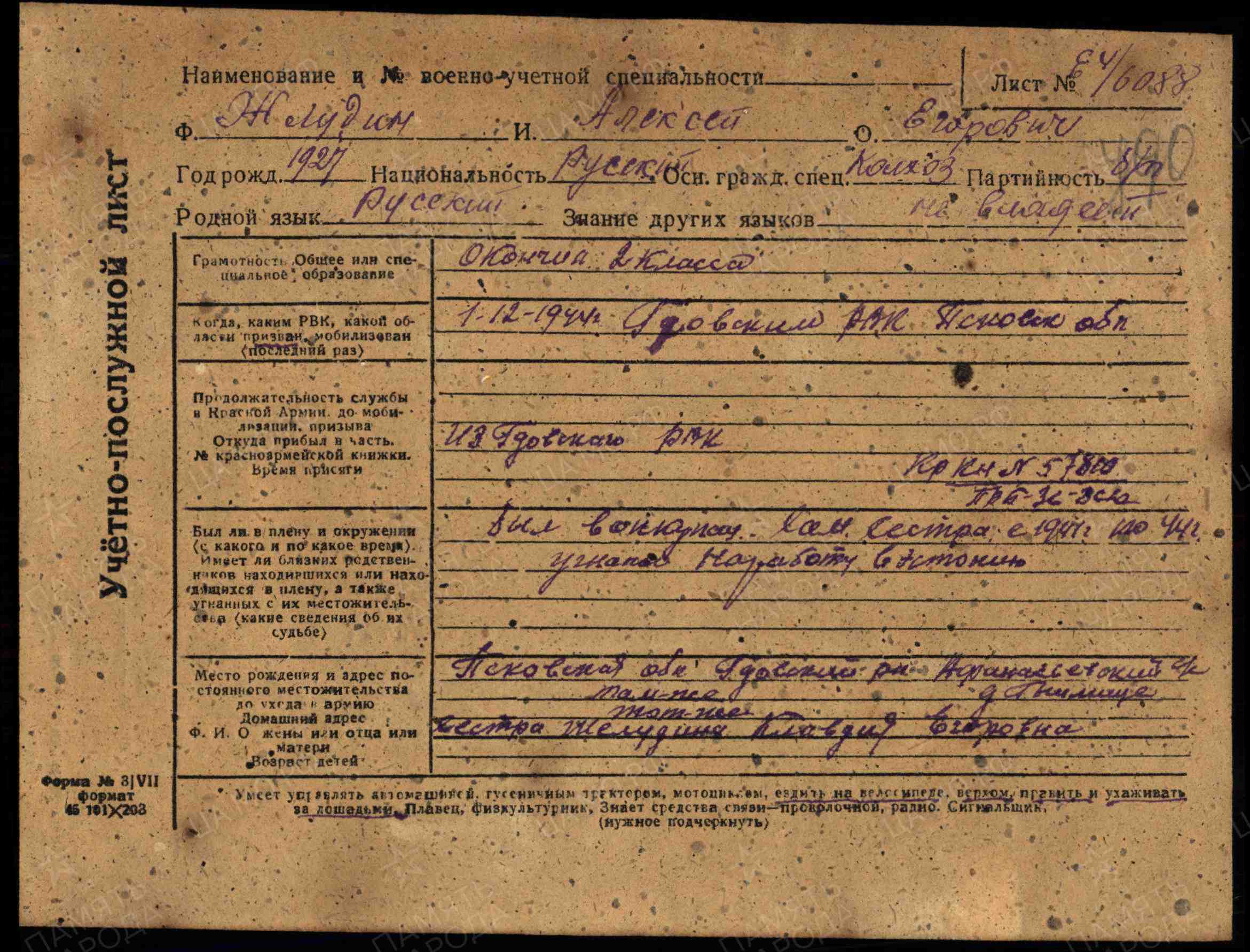 Воинское звание:рядовой Место призыва:Гдовский РВК, Псковская обл., Гдовский р-н Дата призыва:01.12.1944 Воинская часть:36 запасная стрелковая бригада Гдовский РВК, 48 запасной стрелковый полк 389 запасной стрелковый полк 78 запасной стрелковый полк 36 запасной стрелковой дивизии 78 запасной стрелковый полк 187 стр. Поле стрелок нояб.44-фев.45, 3 мест стр. Бат. Стрелок фев. 45-нояб. 45, 37526 стрелок нояб. 45 - апр. 50 Награды: медаль «30 лет Совесткой Армии и Флота» в 1948 Жена: Желудина Нина Федоровна Проживал в Ягоднинском р-не, п. Ягодное, ул. Дебинская, № 7., кв.1. Потом отбывал срок в Учр. АВ 261/4 (ст. 108ч.2 УК РСФСР) Поступил в Магаданский Дом-интернат, учреждение: 03.08.1993г Покинул учреждение: 04.08.1993г.