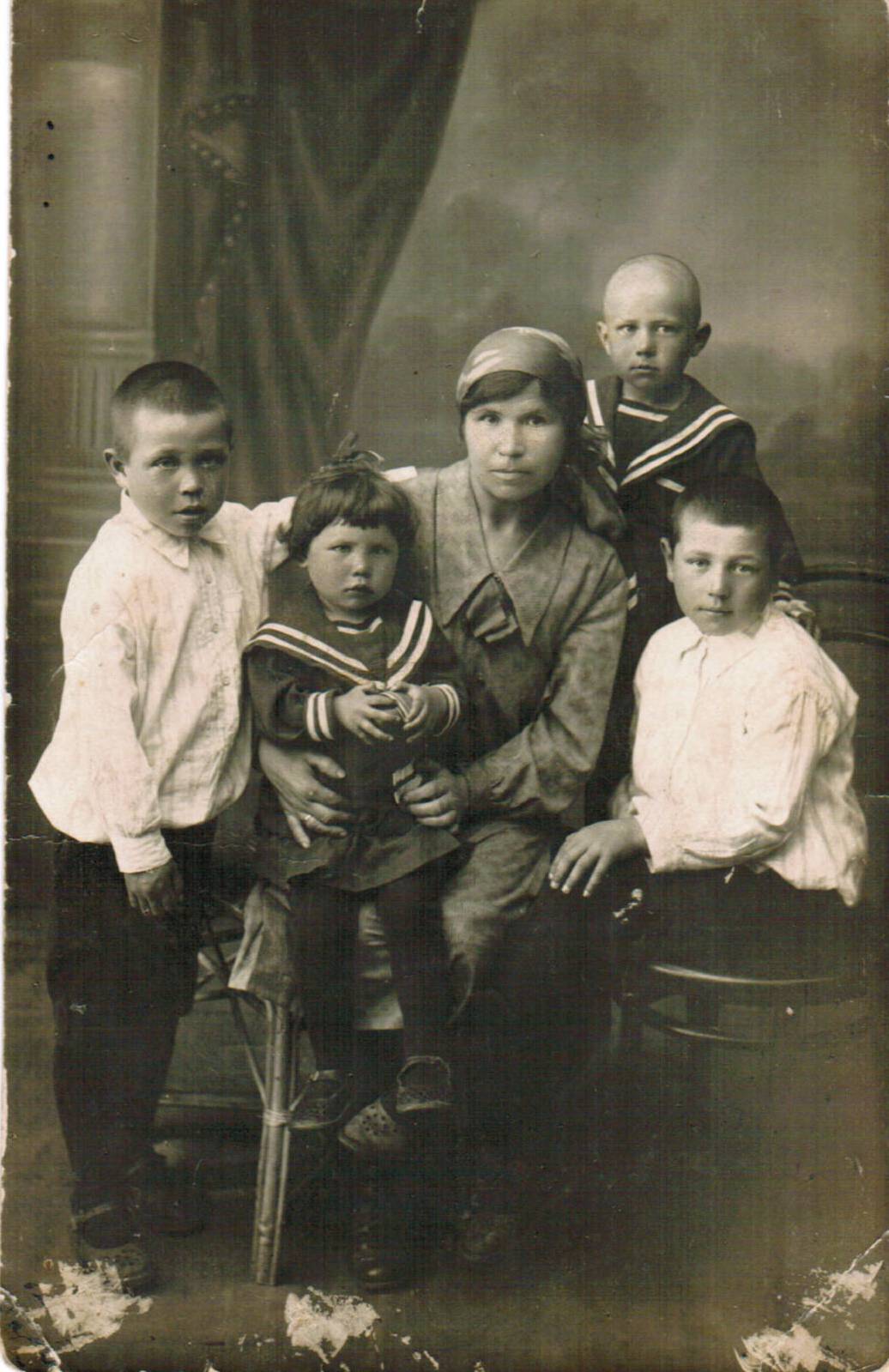 Я расскажу ,что знаю про своего деда и семью.Мой дед Земляков Павел Матвеевич участник ВОВ 1941-45 г. г.,рядовой. О нем я знаю мало и его никогда не видела. Фотографии его не сохранились.Родился он в деревне Крестовая , Новгородской области в 1894 году.Проживал в г. Боровичи Новгородской области .До войны работал на заводе.Жили они с женой (моей бабушкой)Федосьей ,имели четверых детей ,сын Сергей (мой папа),сын Серафим,сын Костя (умер в детстве) и дочь Валя. В 1940 году Сергея призвали на службу в армию,служил он под г. Ленинградом.В 1941 году началась война.Завод и рабочих эвакуировали в г. Новосибирск. Так мой дед и его сын Серафим,который тоже работал на заводе , оказались в Новосибирске.В Боровичах остались моя бабушка с малолетней дочкой Валей.В декабре 1942 года из Новосибирска дед был призван в армию и отправлен на фронт .Так же на фронт был отправлен и его сын Серафим.Последнее письмо от деда было в июле 1943 года, больше никаких известий не было.Делали запрос и пришел ответ,что он пропал без вести в октябре 1944 года.Моя бабушка Землякова Федосья во время войны умерла от болезни и голода.Немцы почти окружили город и нечего было есть.Осталась малолетняя дочь Валя,ее определили жить в интернат , там она и жила до конца войны.Братья Сергей и Серафим вернулись живые с войны.На фотографии моя бабушка Федосья с детьми.