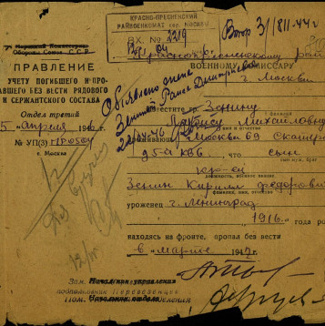 Красноармеец 1134 стр. полка, 338 стр. див. (I формир.), 33 армии, п.п.143. Пропал без вести в январе-марте 1942 года в боях под г. Вязьма (Ржевско - Вяземская наступательная операция).