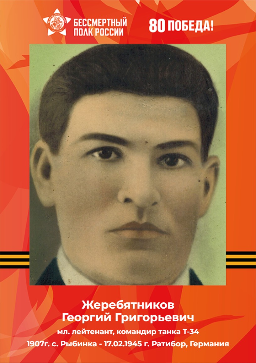 Фамилия Жеребятников Имя Георгий Отчество Григорьевич Дата рождения/Возраст __.__.1907 Место рождения Сталинградская обл., Камышинский р-н, с. Рыбинка Дата и место призыва __.__.1941 Елатомский РВК, Рязанская обл., Елатомский р-н Последнее место службы 152 тбр 60 А 1 УкрФ Воинское звание мл. лейтенант Причина выбытия убит Дата выбытия 17.02.1945 Первичное место захоронения Германия, г. Ратибор, севернее, 10 км, д. Раттесдорф, в районе Название источника донесения ЦАМО Номер фонда источника информации 38 Номер описи источника информации 11385 Номер дела источника информации 127 Жил в г. Ставрополь с женой Евдокией Трофимовной. Имел сыновей : Валентина, Юрия, Геннадия.