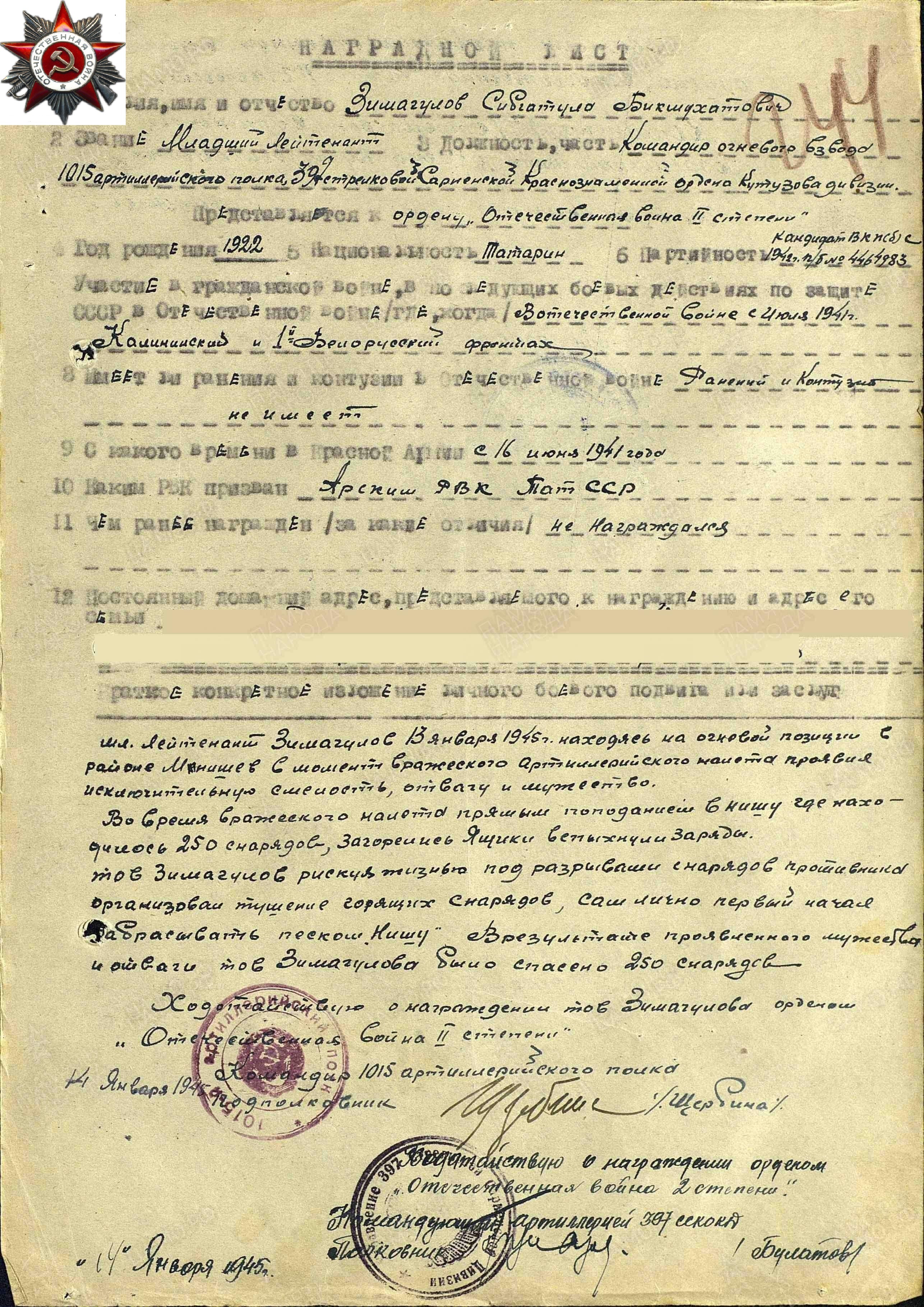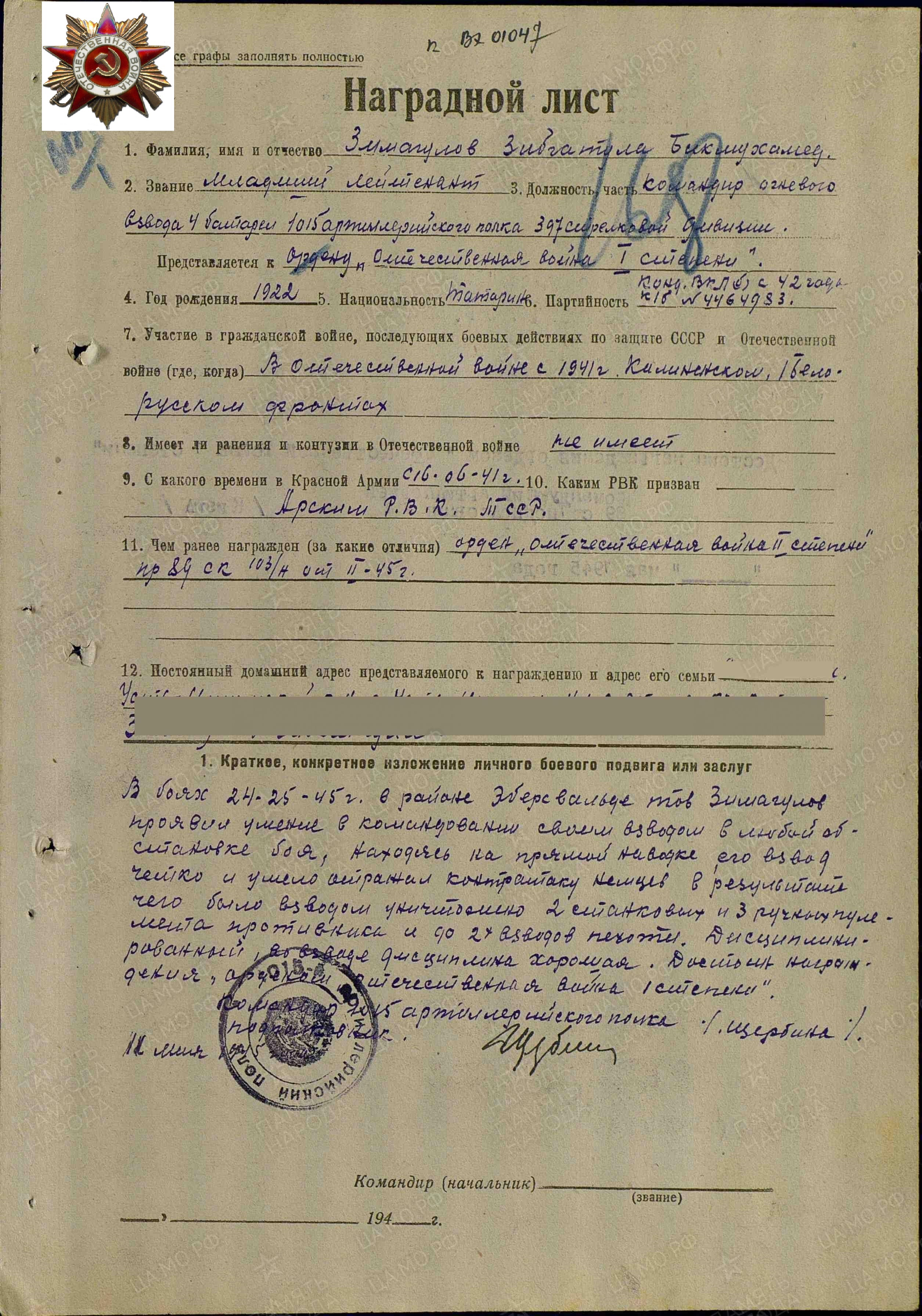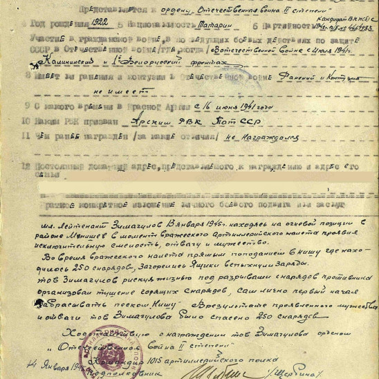 Призвался в конце мая 1941 года, из Арского педагогическо-го училища, где он учился вместе со своей женой Сажидой. Прошел всю войну до Берлина в составе Калининского, за-тем 1-го Белорусского фронтов Командиром огневого взвода ар-тиллерийского полка. Кавалер орденов Отечественной войны 1 и 2 степени. Награжден медалями «За освобождение Варшавы» и «За взятие Берлина». После войны 2 года участвовал в восстановлении города Берлин. Вернувшись в д. Новая-Юльба Атнинского района Татарской АССР работал учителем, а затем и директором начальной шко-лы. Про Великую Отечественную войну рассказывал очень ма-ло, оберегая своих детей и внуков от ужасов войны. В нашей семье хранятся ордена и медали, военный бинокль и лупа.