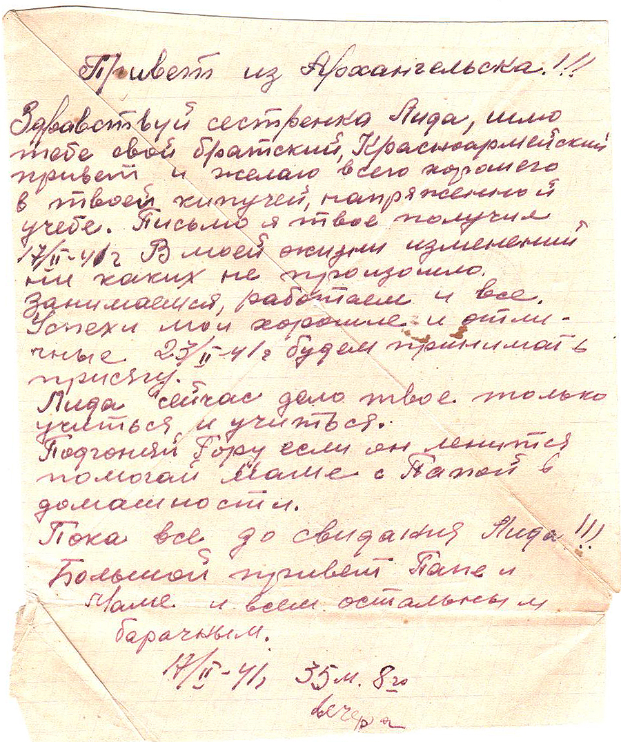 Мы, младшие сестра и брат хвостиком ходили за Васей. Он часто брал на с собой на речку "Белую" на рыбалку. Мы очень любили с ним играть, ходили по грибы, ягоды, на луг за щавелем. Родителям он был главным помощником, все успевал и учится, и нас учить, и помогать матери, и петь, и рисовать! Когда ушел на войну, не переставал о нас заботиться, письма писал, высылал деньги, все наказывал мне "Ты главное, Лида, учись! Учись изо всех сил. И я старалась, верила, что вернется, но не сбылось, погиб он. Принесли похоронку, мы плакали, не верили... Теперь вот храню письма его, да фотографии, ему то всего 24 года было... Хожу каждый год к "Тыл-Фронту", там на обелиске есть его имя, хожу, вспоминаю своего брата, столько лет прошло, а я все жду его, скучаю...