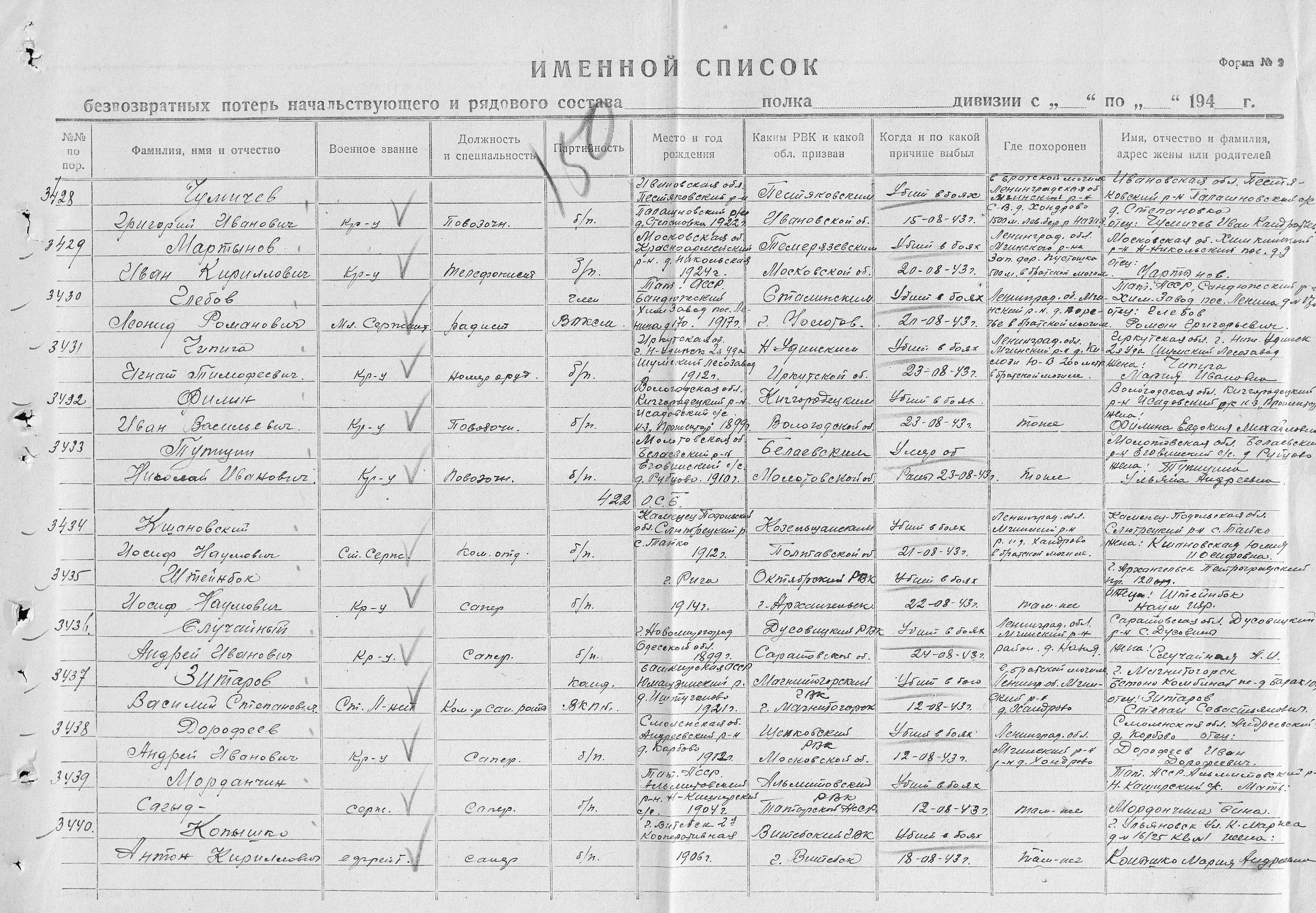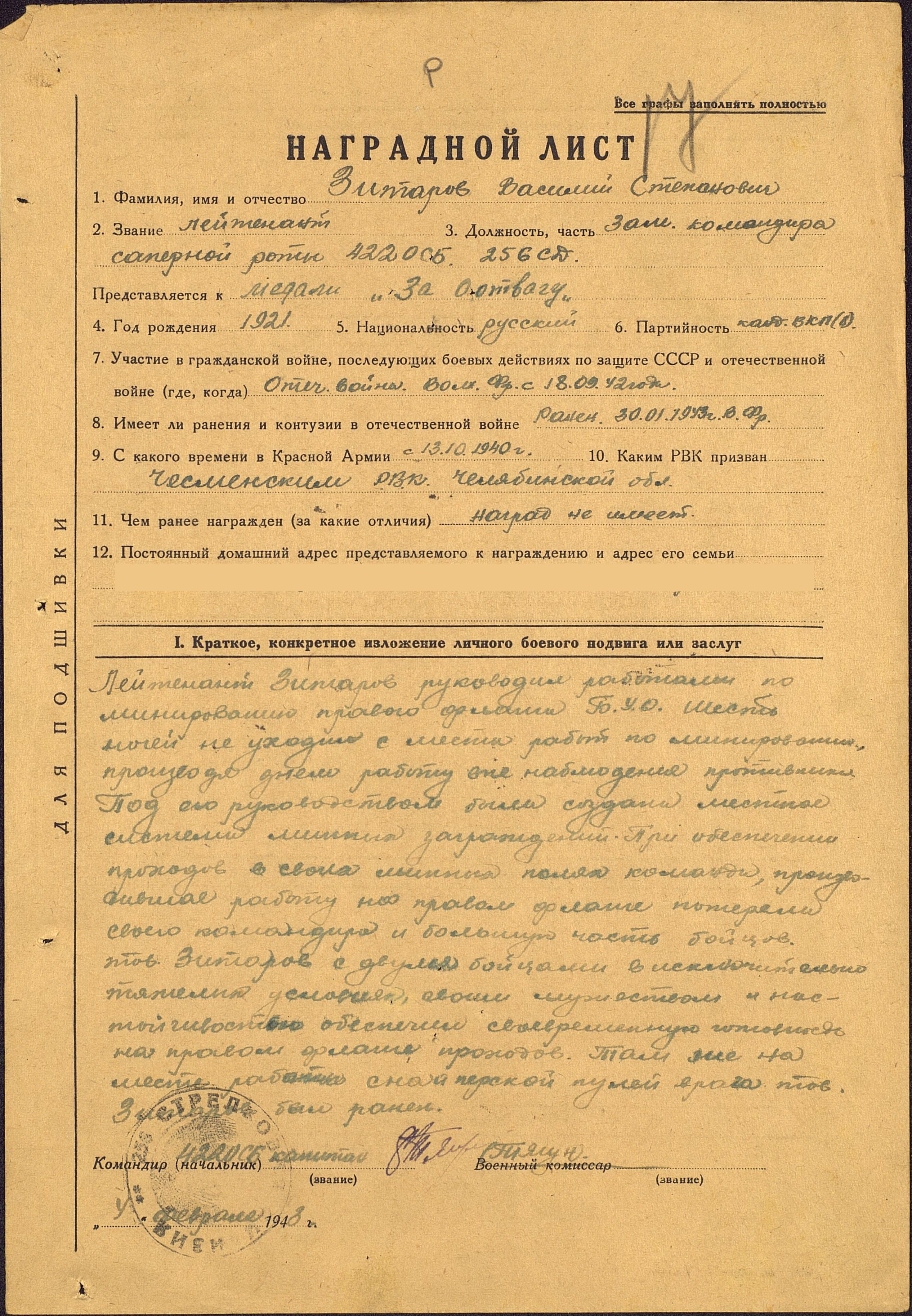 Сегодня вспоминаем о погибших,Кто защищал страну и весь народ.Кто не дожил до праздника Победы,Их подвиг в сердце, в памяти живёт.Идут года, уходят в вечность войны,Участники войны и поколенье вдов.Мы в День Победы всех их вспомнимУ “Вечного огня”, застыв без слов.Зитаров Василий Степанович родился в деревне Иштуганово, Юмагузинский р-н , Башкирской АССР в 1921 году. В семье было четверо детей. Василий был старшим. Опекал своих младших сестер и брата. В 1932 году семья переехала в город Магнитогорск. Василий закончил 7 классов школы, затем поступил в Магнитогорский педагогический техникум. В техникуме был активным студентом и комсомольцем. Увлекался шахматами, музыкой, хорошо играл на балалайке, мандолине и кларнете. У него было много друзей. Семья жила в бараке. Жили дружно, в бараке было много людей, жили как одна семья. Детишек вокруг было много и Вася с удовольствием занимался с ними, рисовал их портреты.После успешного окончания техникума был распределен в Сухтелинский район Челябинской области, в сельскую школу на должность директора школы. Но работать не пришлось, в 1938 году был призван в Красную Армию.Должен был вернуться в 1941 году домой, но его направили в город Архангельск в артиллерийскую школу (ПАП), где готовили младших офицеров. Окончив школу в звании лейтенанта был направлен командиром артиллерийского расчета под Ленинградом во время Ленинградской блокады. В ходе прорыва блокады Ленинграда в январе 1943 года его 256 стрелковая краснознаменная дивизия перешла в наступление. 12.01.1943 на участке между Липками и Гайтолово из района южнее Рабочего посёлка № 8, имея соседом слева 327-ю, а справа 372-ю стрелковые дивизии. 14.01.1943 овладела станцией Подгорная и завязала бои на подступах к Синявино, преодолевая покрытые льдом валы. 15.01.1943 овладела станцией Синявино.В феврале 1943 года в должности командира снайперской роты 422 снайперского батальона 256СД был представлен к награде : медаль "За отвагу". Вот описание его подвига из наградного листа: "Лейтенант Зитаров Руководил работами по минированию правого фланга БОУ. Шесть ночей не уходил с места работы по минированию. Под его руководством была создана местная система заграждений. При обеспечении подходов через минные поля, рота потеряла командующего и часть бойцов. Зитаров с двумя бойцами в исключительно тяжелых условиях, своим мужеством и настойчивостью обеспечили своевременную готовность на правом фланге проходов. Там же на месте работы фашистской пулей Зитаров был ранен. " Около месяца находился в полевом госпитале на излечении.В июле 1943 года, в ходе Мгинской операции, штурмует сильно укреплённую высоту «Лесная», рота несёт большие потери, отведена на пополнение и укомплектование. В августе 1943 года дивизия ведёт бои за Пореченский укреплённый узел. В результате Мгинской операции советские войска незначительно вклинились в оборону противника. Противник понес большие потери, особенно от огня артиллерии и ударов авиации. Немецкие войска перебросили в район Мгинского выступа все свои резервы и значительные силы с других участков фронта. Входе ожесточенных боев, продолжавшихся месяц, советские войска не сумели разгромить мгинско-синявинскую группировку противника, освободить Кировскую железную дорогу и обеспечить прочную железнодорожную связь Ленинграда со страной. Однако главна