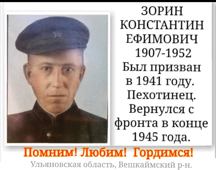 Зорин Константин Ефимович родился в 1907 году в деревне Кандарать, Вешкаймского района, Ульяновской области. Призывался на фронт с односельчанами: