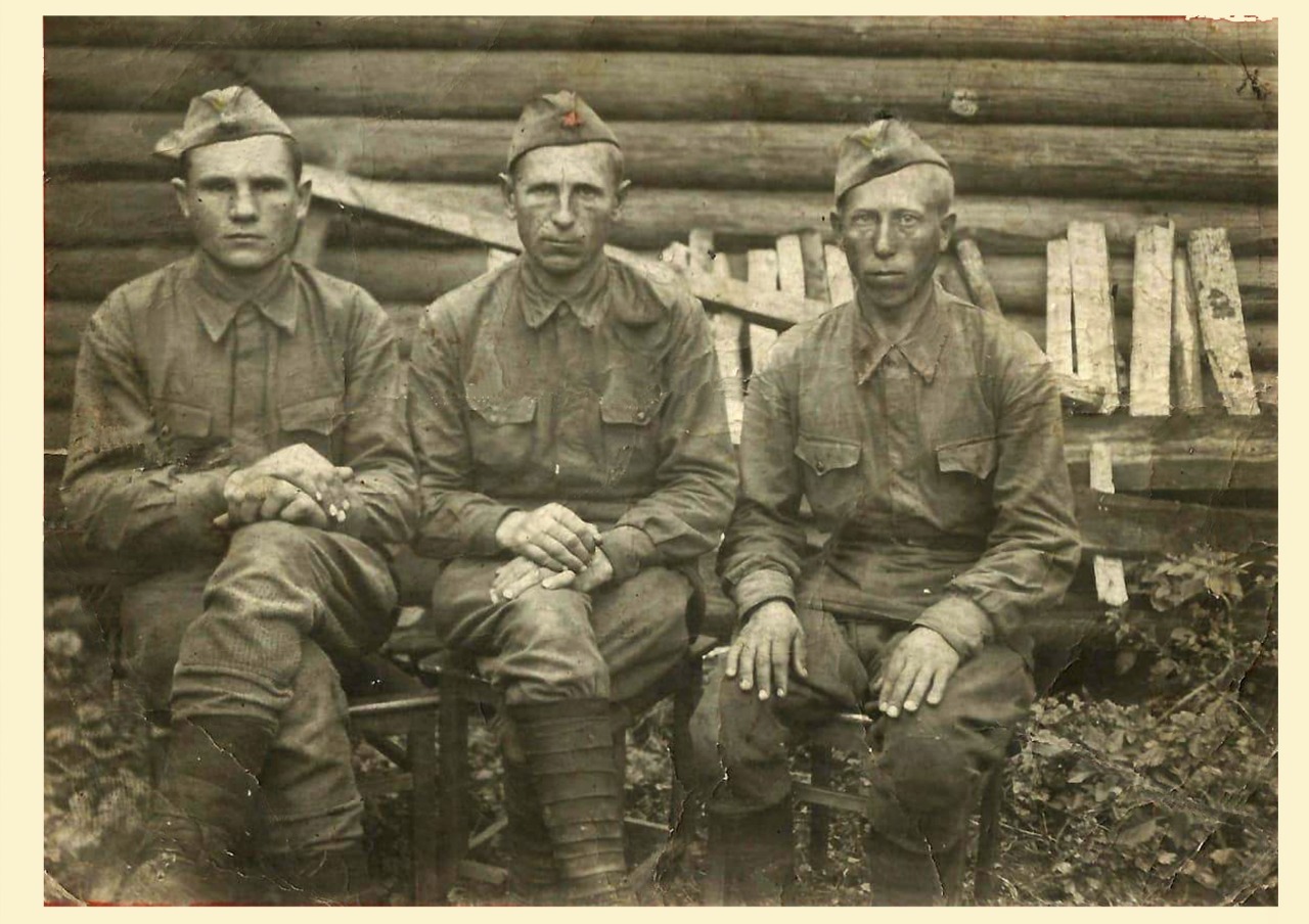 Сохранилась единственная фронтовая фотография дедушки, на которой он изображён с двумя однополчанами. Кто это, мне неизвестно. Может для кого-то это ценная информация, а может у кого-то тоже есть такой же снимок.