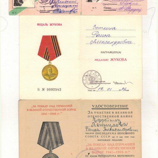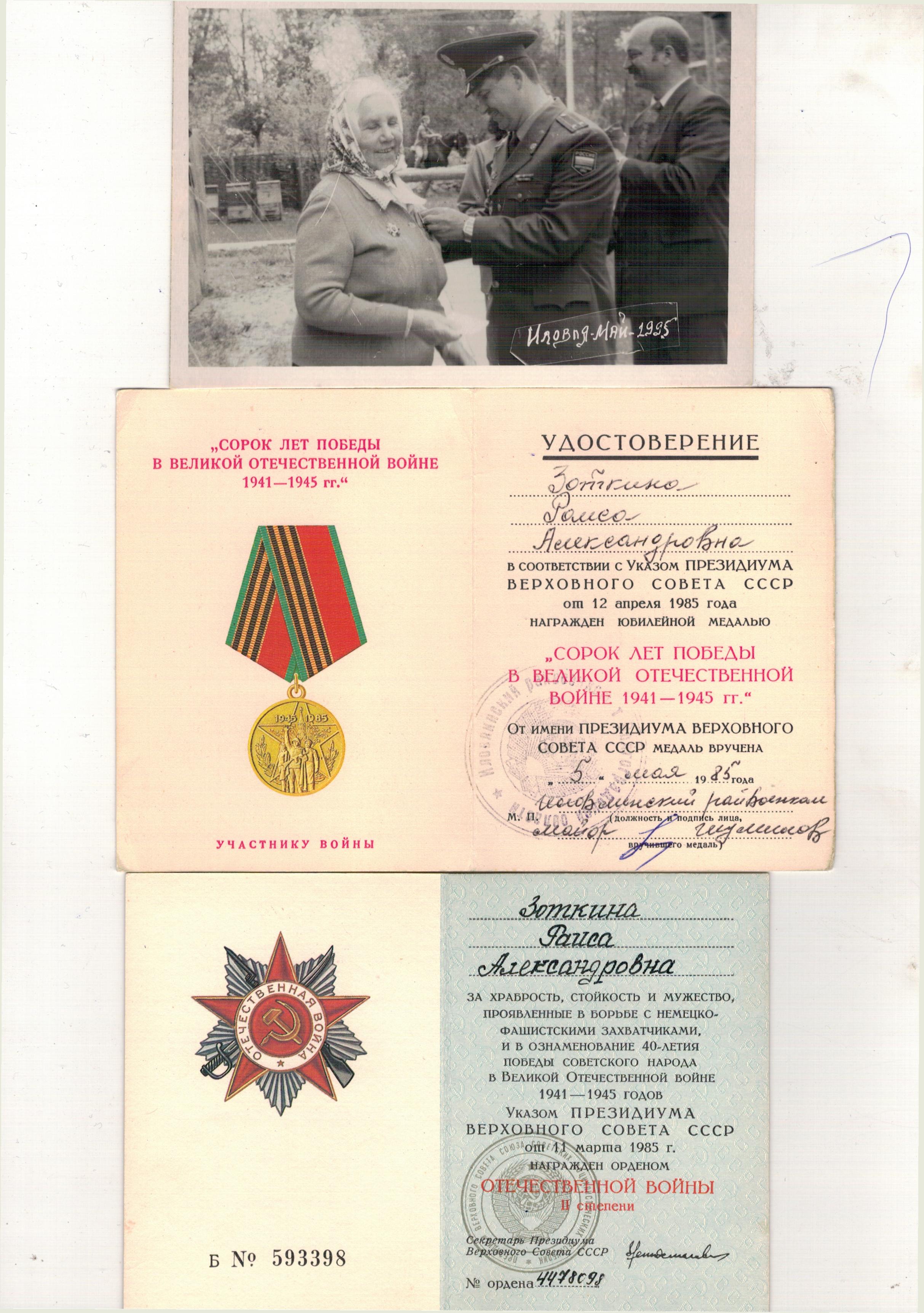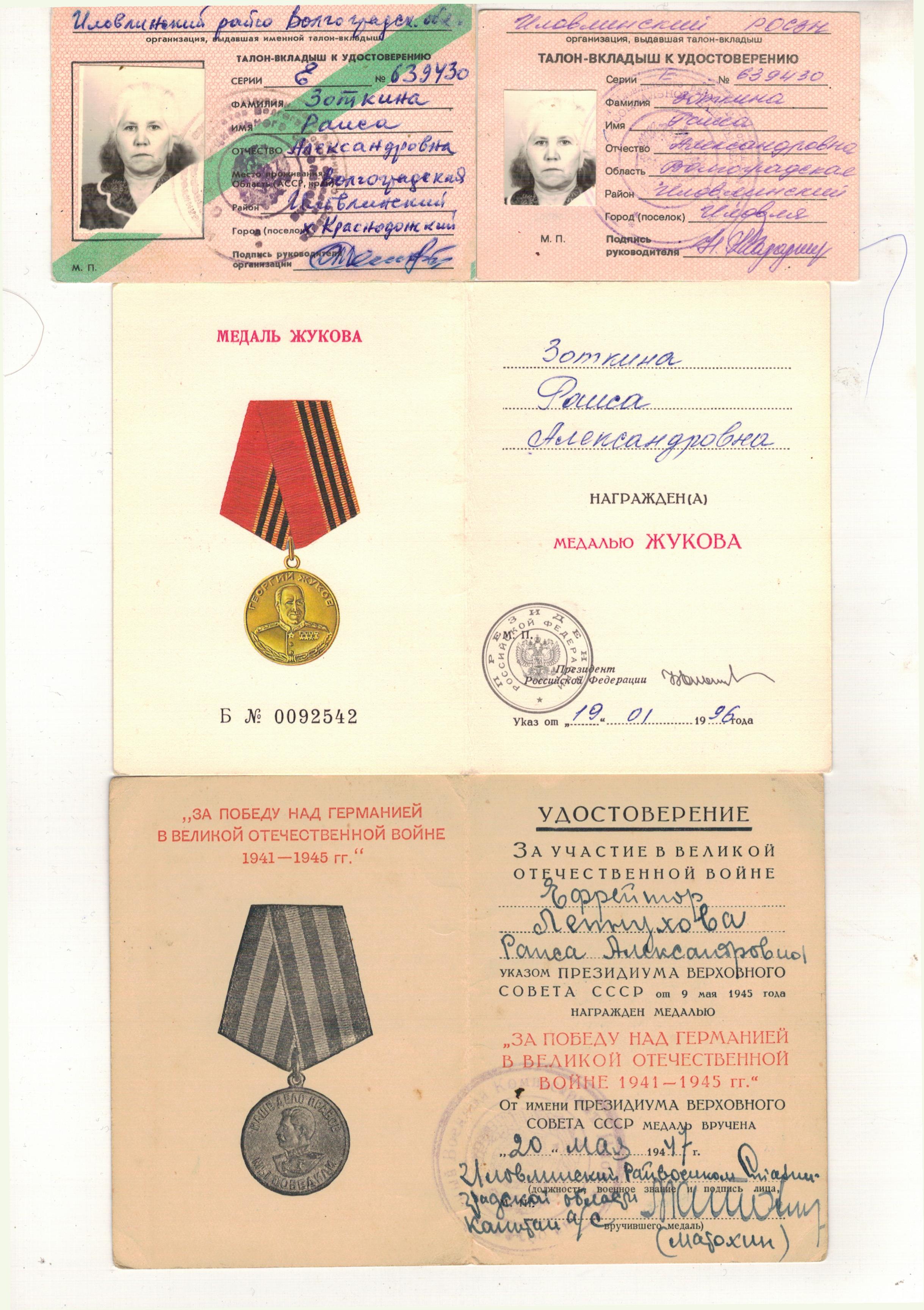 Зоткина (Лепнухова) Раиса Александровна родилась 15 марта 1923г .До войны с 1938 года ,после смерти отца работала дояркой .В 1942 году 18 летней девушкой ,ушла добровольцем на фронт ,принимала участие в Сталинградской битве от начала и до полного разгрома фашистов ,боевой путь проходит в 3-м Белорусском фронте под командованием генерала Толбухина .С начала рядовой ,потом в звании Ефрейтора ,все время была зенитчецей-командиром орудийного расчета .Дошла до города Дрогобыч,там и встретила победу.Вернулась домой в Августе 1945 года.Всю жизнь проработала дояркой в совхозе Пролетарий Иловлинского района.Общий трудовой стаж 37 лет ,много лет была передовой дояркой -за что получала ценные подарки и вознаграждения
