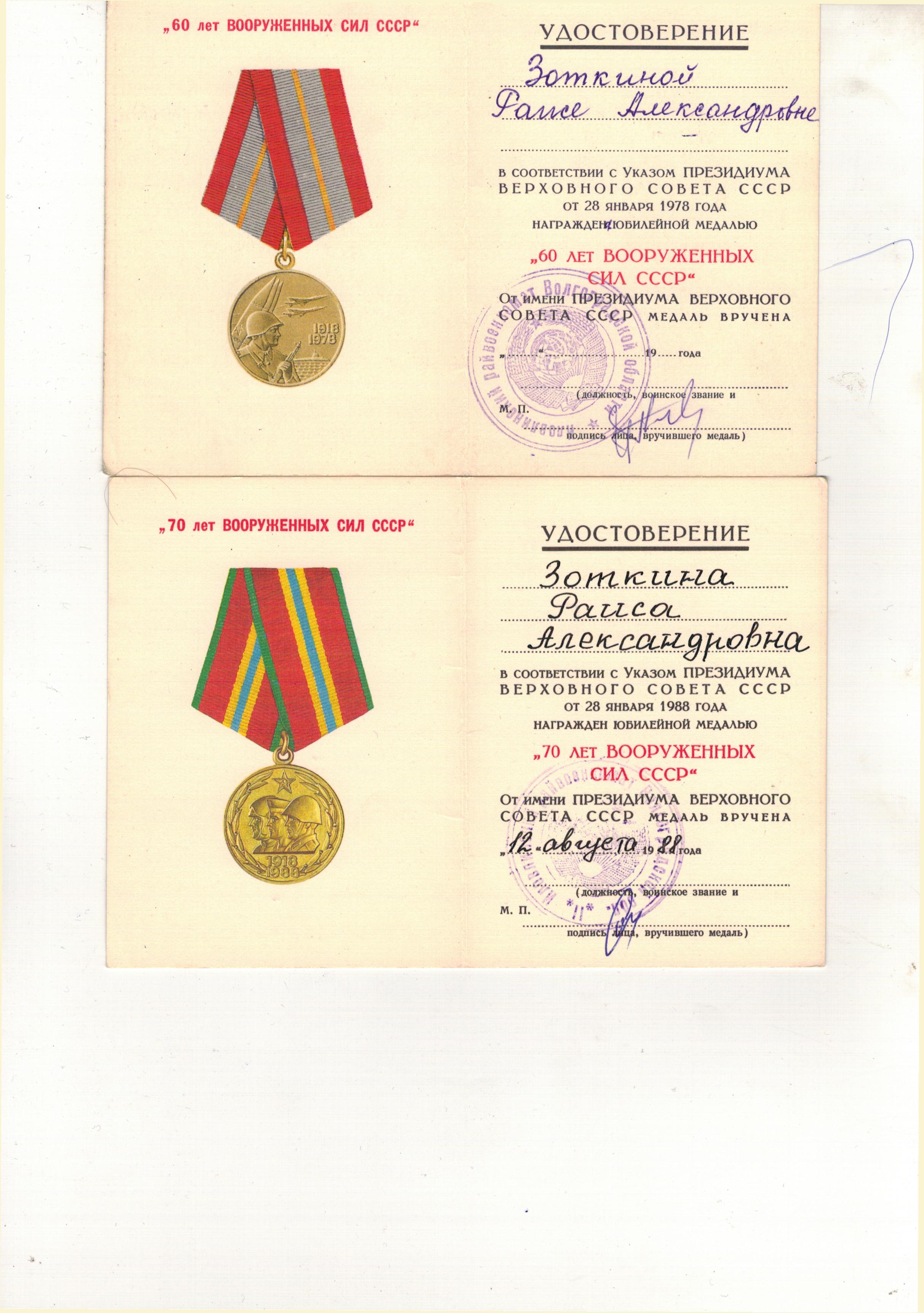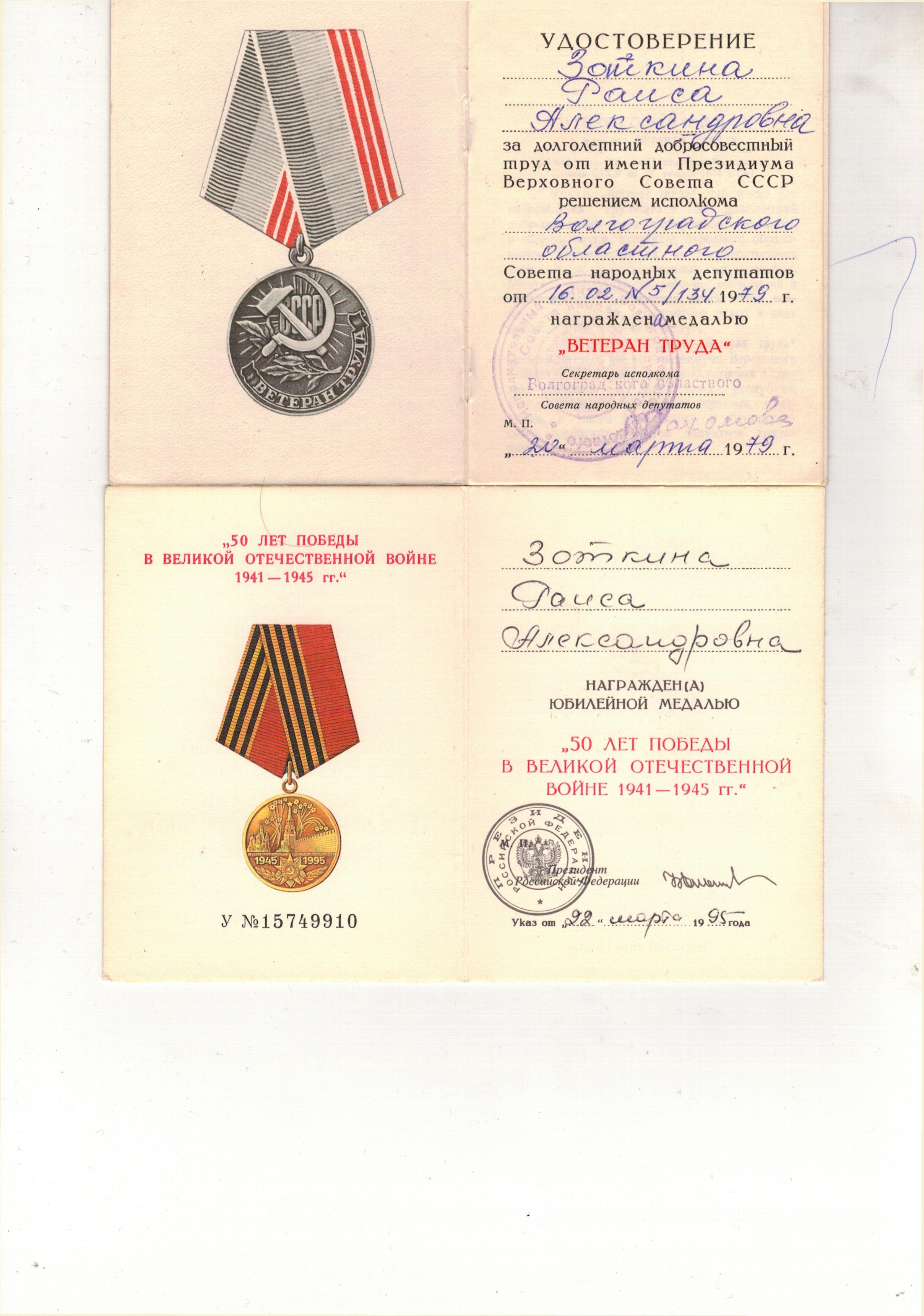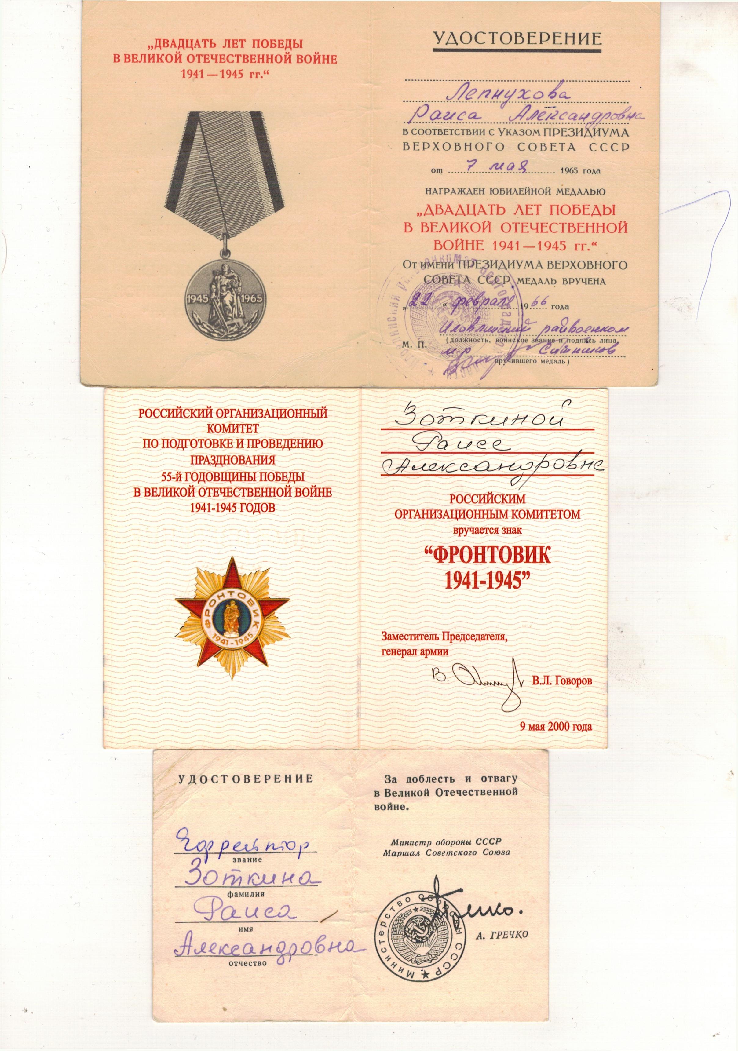 Зоткина (Лепнухова) Раиса Александровна родилась 15 марта 1923г .До войны с 1938 года ,после смерти отца работала дояркой .В 1942 году 18 летней девушкой ,ушла добровольцем на фронт ,принимала участие в Сталинградской битве от начала и до полного разгрома фашистов ,боевой путь проходит в 3-м Белорусском фронте под командованием генерала Толбухина .С начала рядовой ,потом в звании Ефрейтора ,все время была зенитчецей-командиром орудийного расчета .Дошла до города Дрогобыч,там и встретила победу.Вернулась домой в Августе 1945 года.Всю жизнь проработала дояркой в совхозе Пролетарий Иловлинского района.Общий трудовой стаж 37 лет ,много лет была передовой дояркой -за что получала ценные подарки и вознаграждения