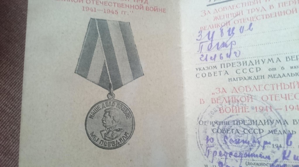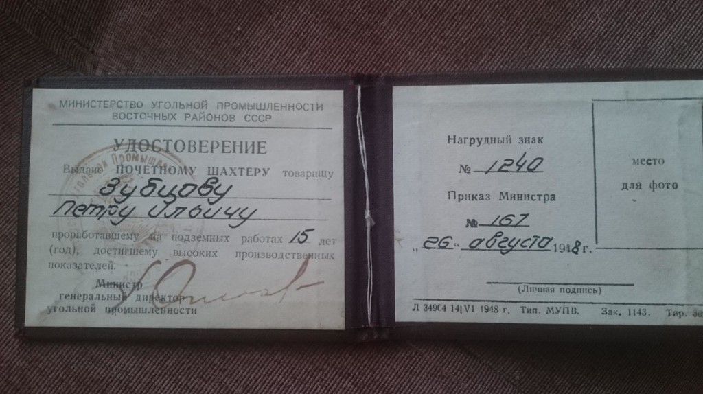 Мой дед Зубцов Пётр Ильич во время Великой Отечественной Войне работал шахтёром на шахте в г.Киселёвск, по 16-18 часов в сутки, на нём была бронь,на фронт шахтёров не пускали, уголь нужен был Родине и он за свой труд был награждён-Медаль За доблестный труд в период Великой Отечественной Войне,приказ от 10 сентября 1946 года, Медаль За трудовую доблесть, приказ от 14 октября 1948 г. №100253,Орден Трудового Красного Знамени от16 сентября 1952 г.№550334,и Нагрудной знак №1240,приказ№167 от 26 августа 1948 г.-Почётный Шахтёр,спасибо ему за его доблестный труд Во Имя Победы!